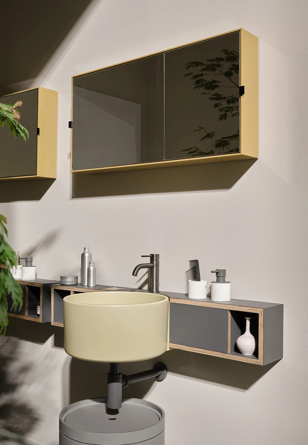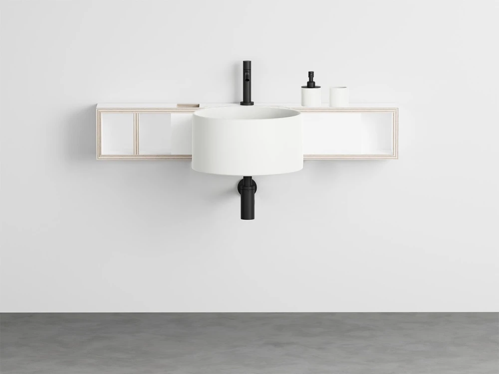 Wall-hung washbasin, without overflow, available in different ceramic finishes, completed by a wall-hung storage unit in Fenix