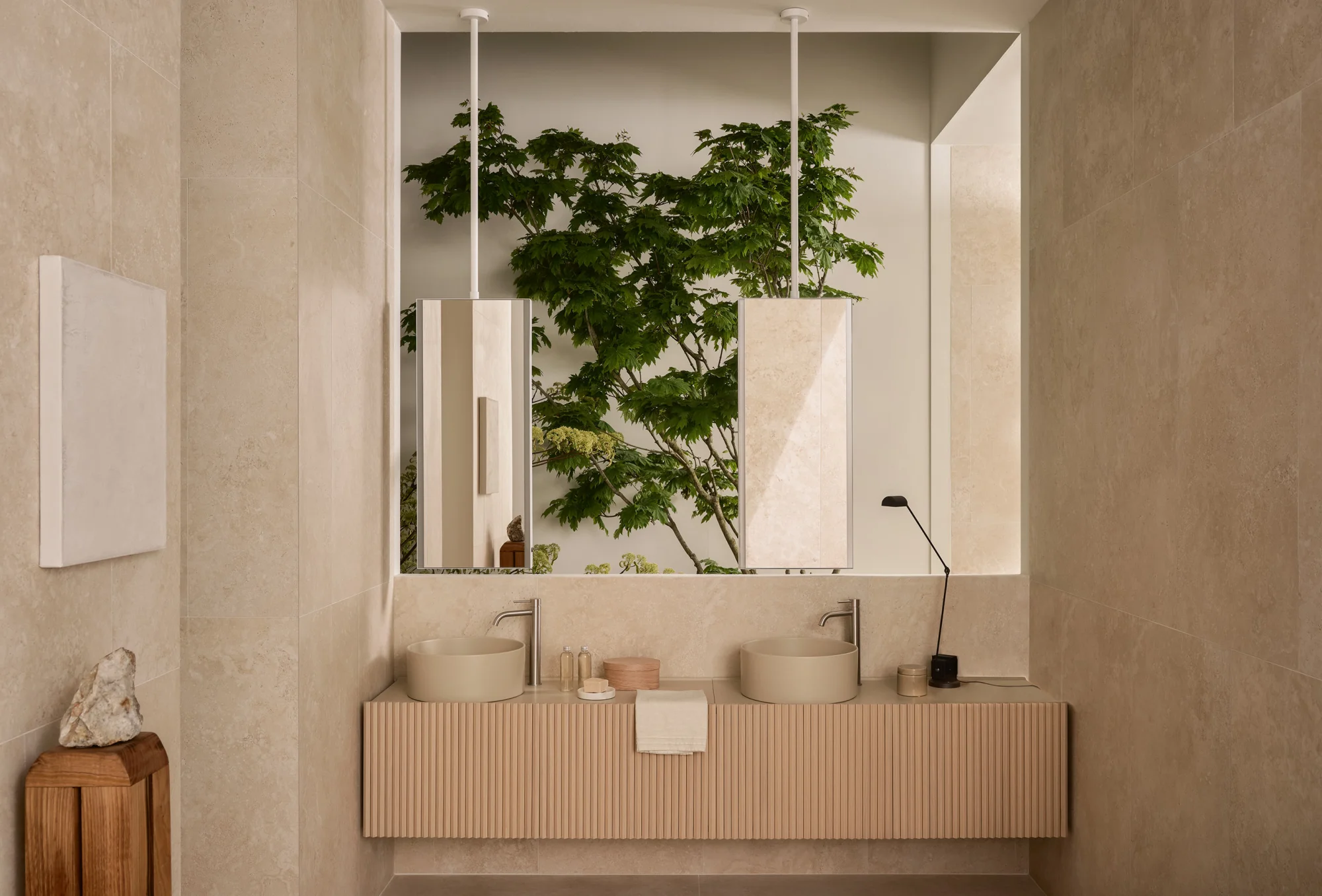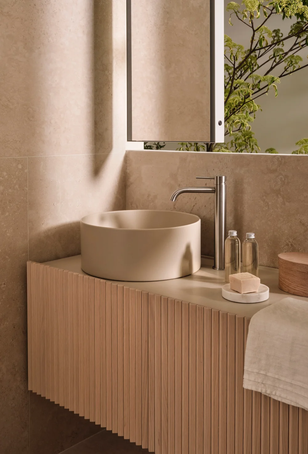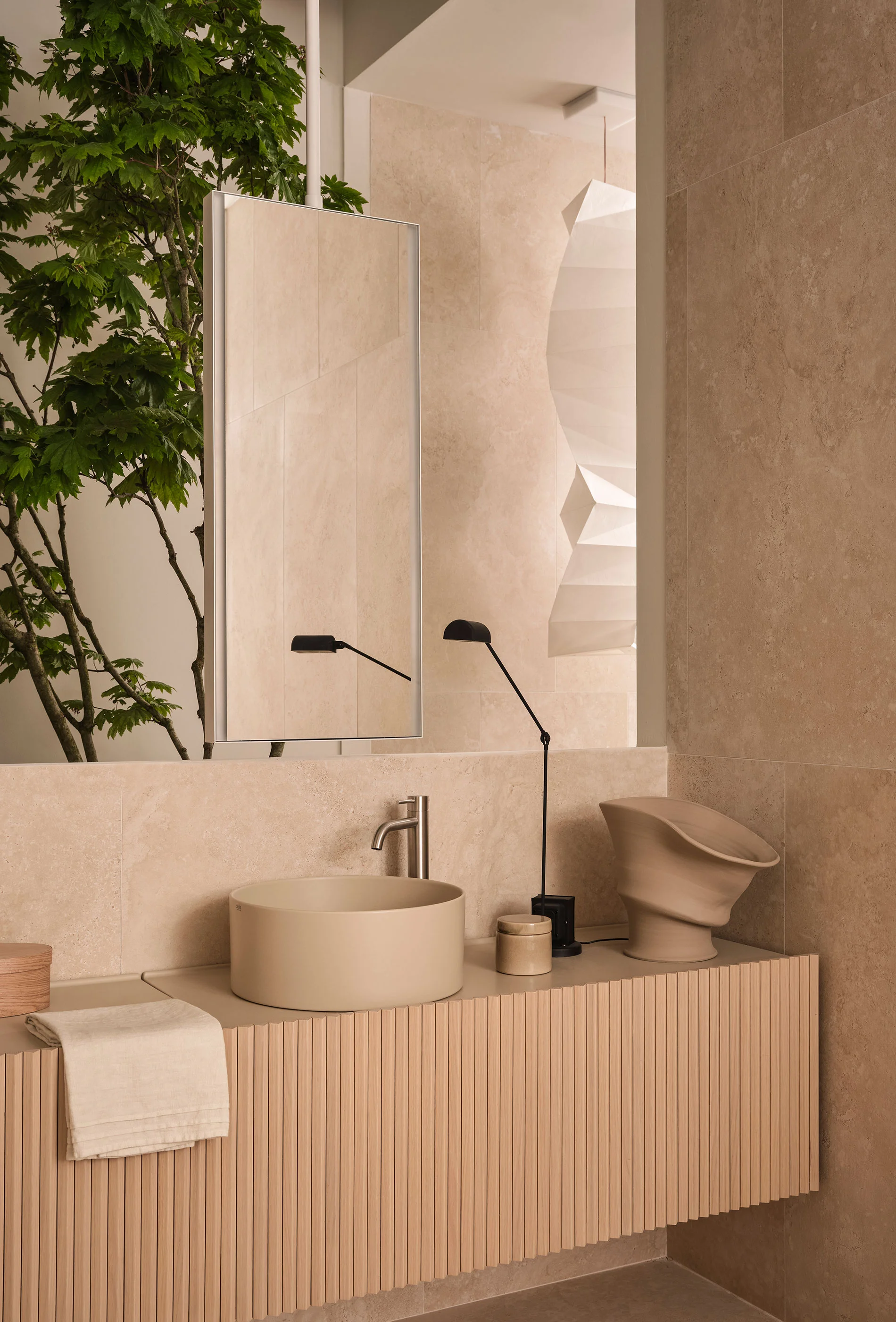 Un progetto dal design puro, caratterizzato dall’attenta cura per il dettaglio. Questa nuova interpretazione vede infatti la presenza di un piccolo bordo contenitivo che evita la fuoriuscita dell’acqua e al contempo dona movimento alla composizione.