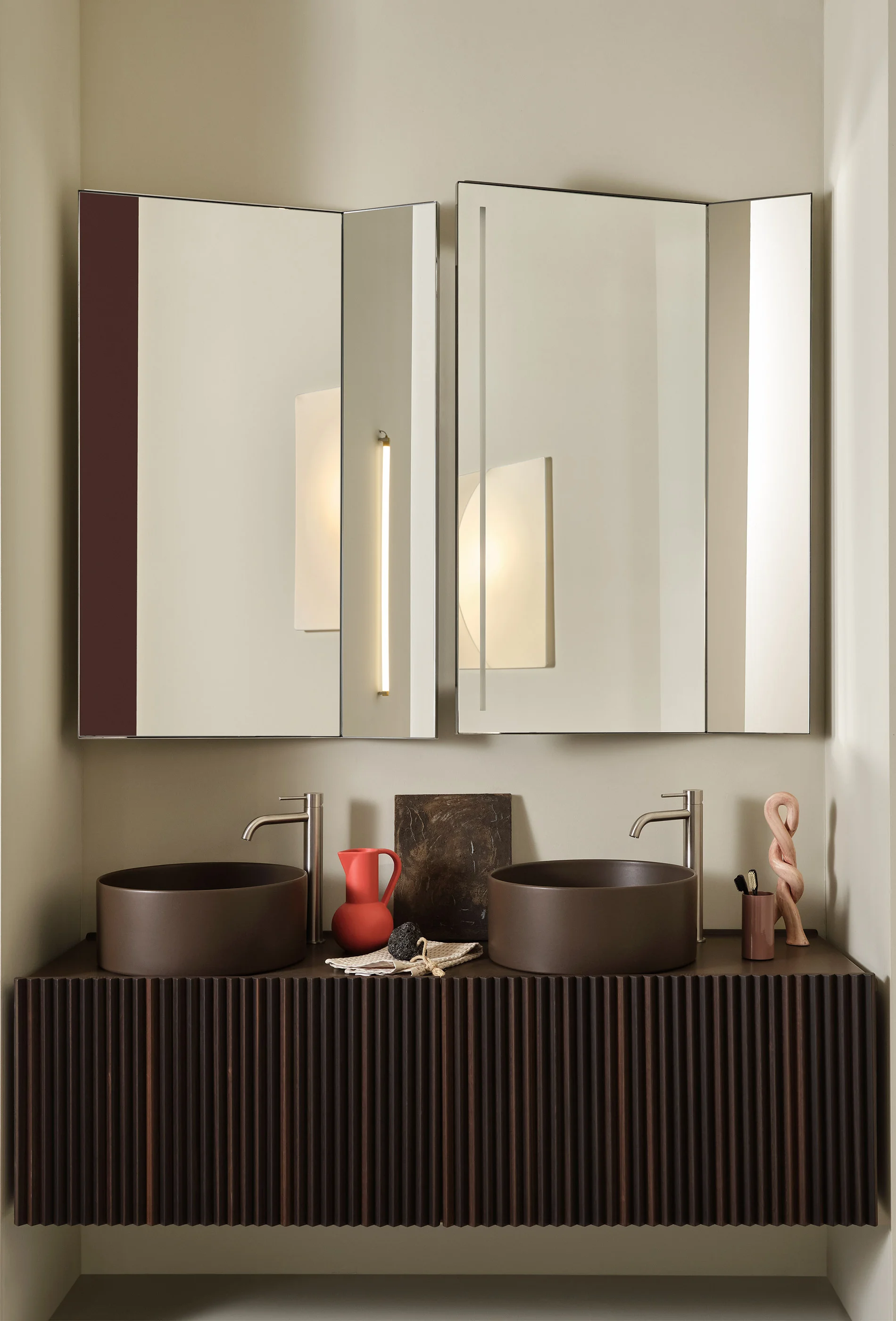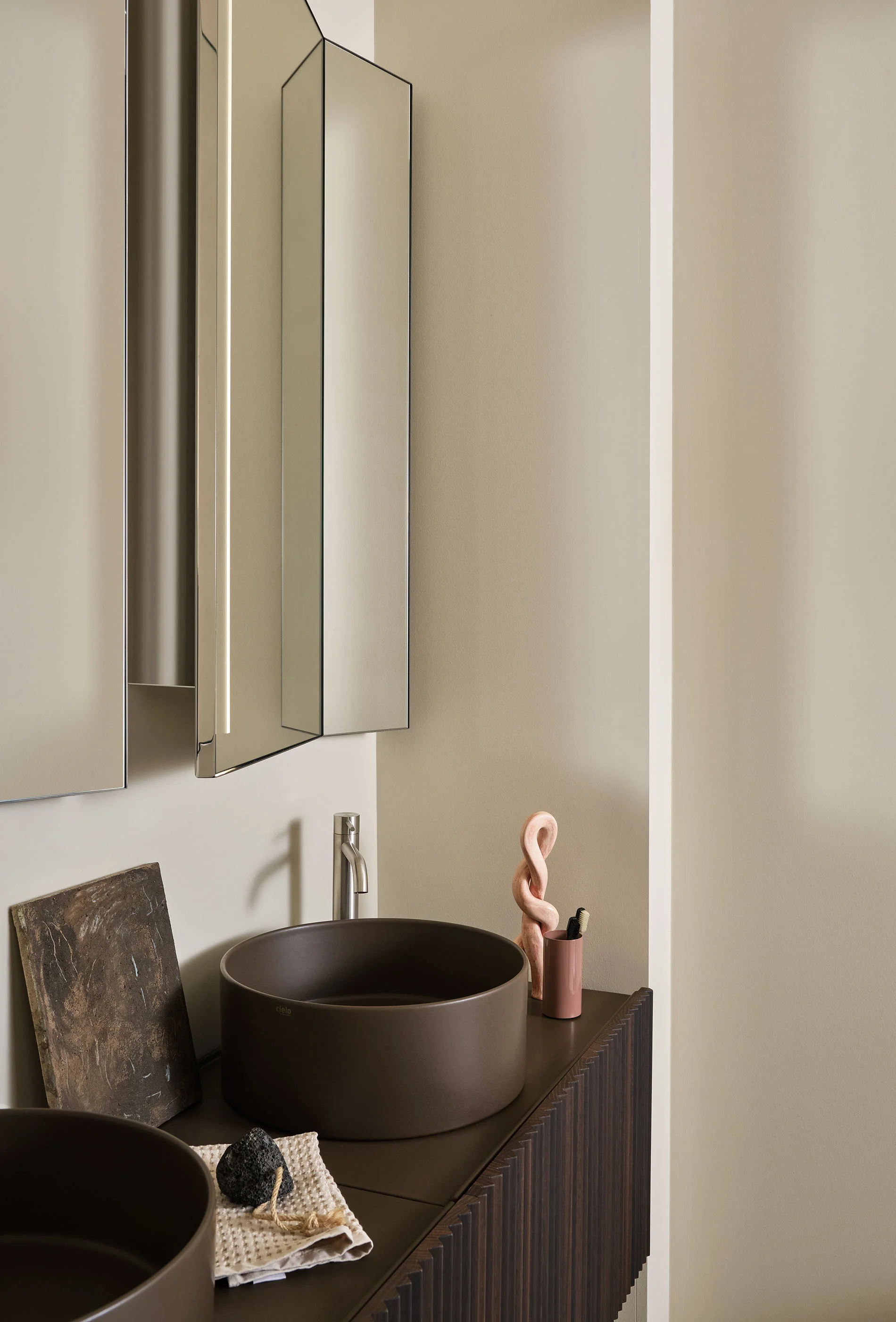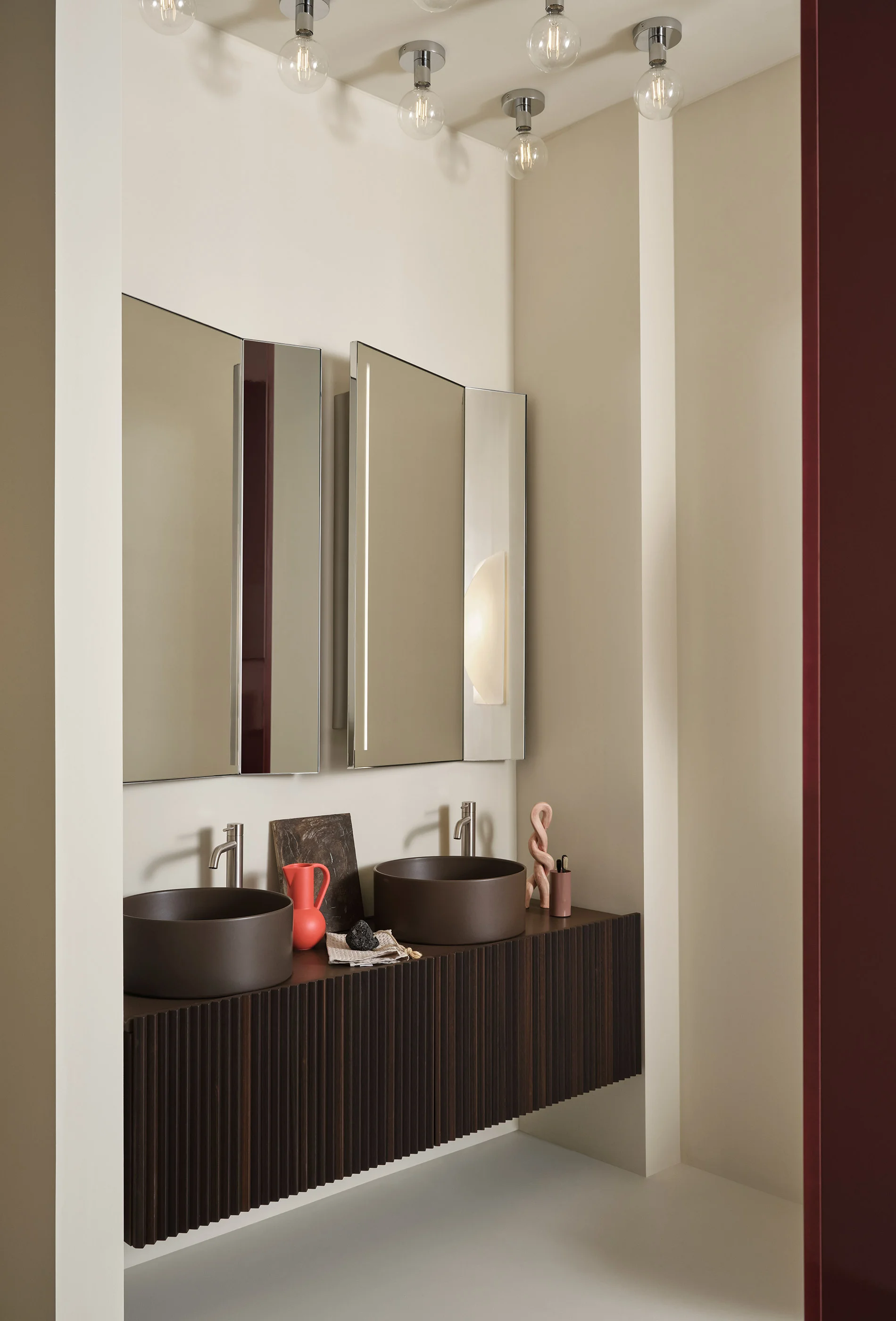 Il mobile contenitore sospeso in legno laccato, declinabile in 9 cromie e 5 essenze, può essere abbinato a bacinelle di varie collezioni di Ceramica Cielo, conferendo così una straordinaria valenza arredativa al progetto. Lo scenografico impatto estetico si amplifica nella versione del mobile contenitore sospeso con anta frontale in listelli di massello triangolari in essenza, declinabile - come la versione liscia - in Eucalipto, Rovere tinto Noce, Sbiancato, Naturale e Nero.