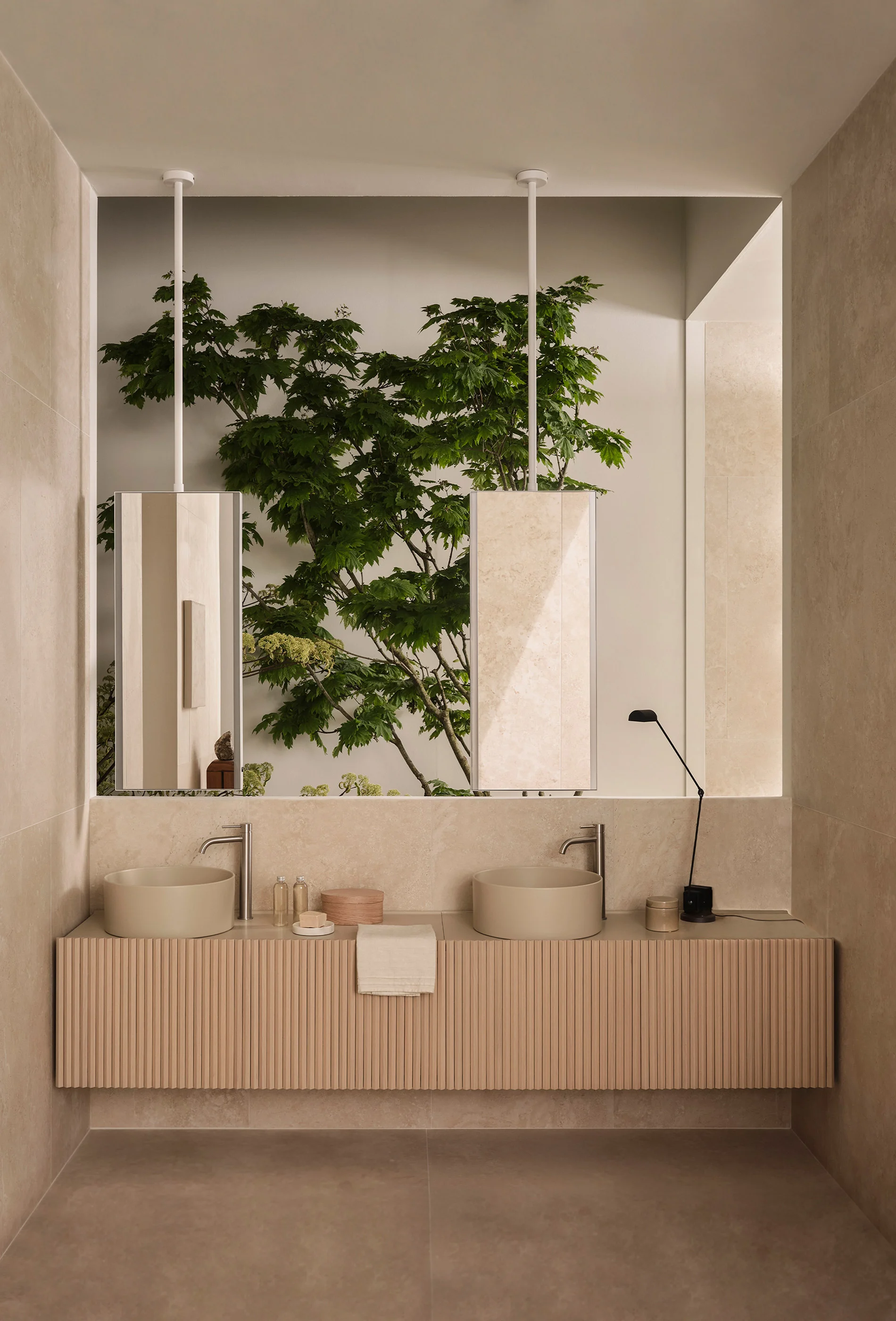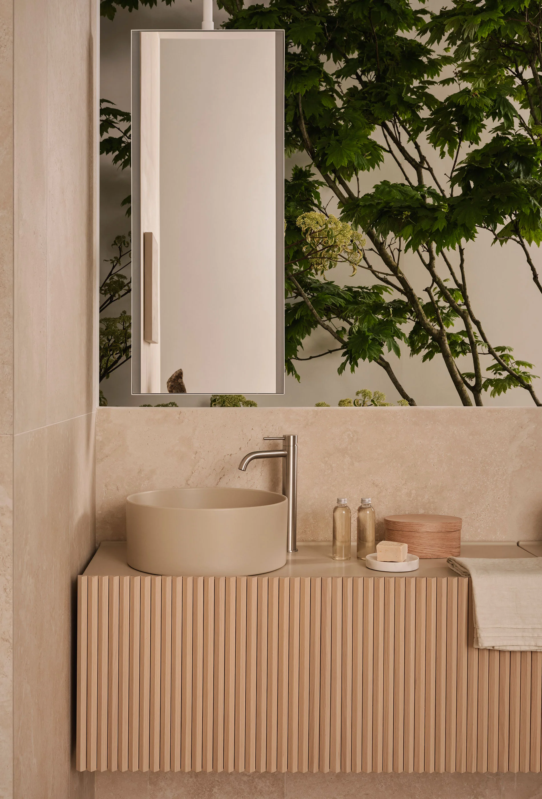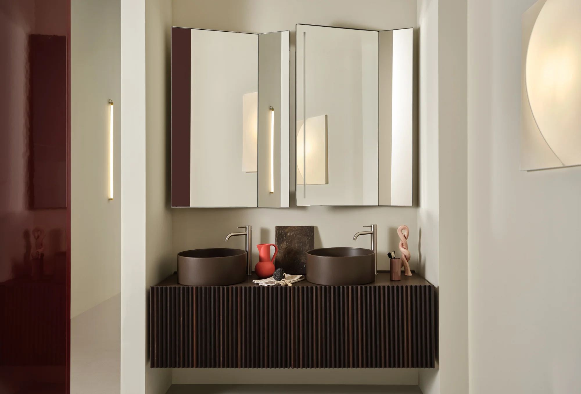 Il mobile contenitore sospeso in legno laccato, declinabile in 9 cromie e 5 essenze, può essere abbinato a bacinelle di varie collezioni di Ceramica Cielo, conferendo così una straordinaria valenza arredativa al progetto. Lo scenografico impatto estetico si amplifica nella versione del mobile contenitore sospeso con anta frontale in listelli di massello triangolari in essenza, declinabile - come la versione liscia - in Eucalipto, Rovere tinto Noce, Sbiancato, Naturale e Nero.
