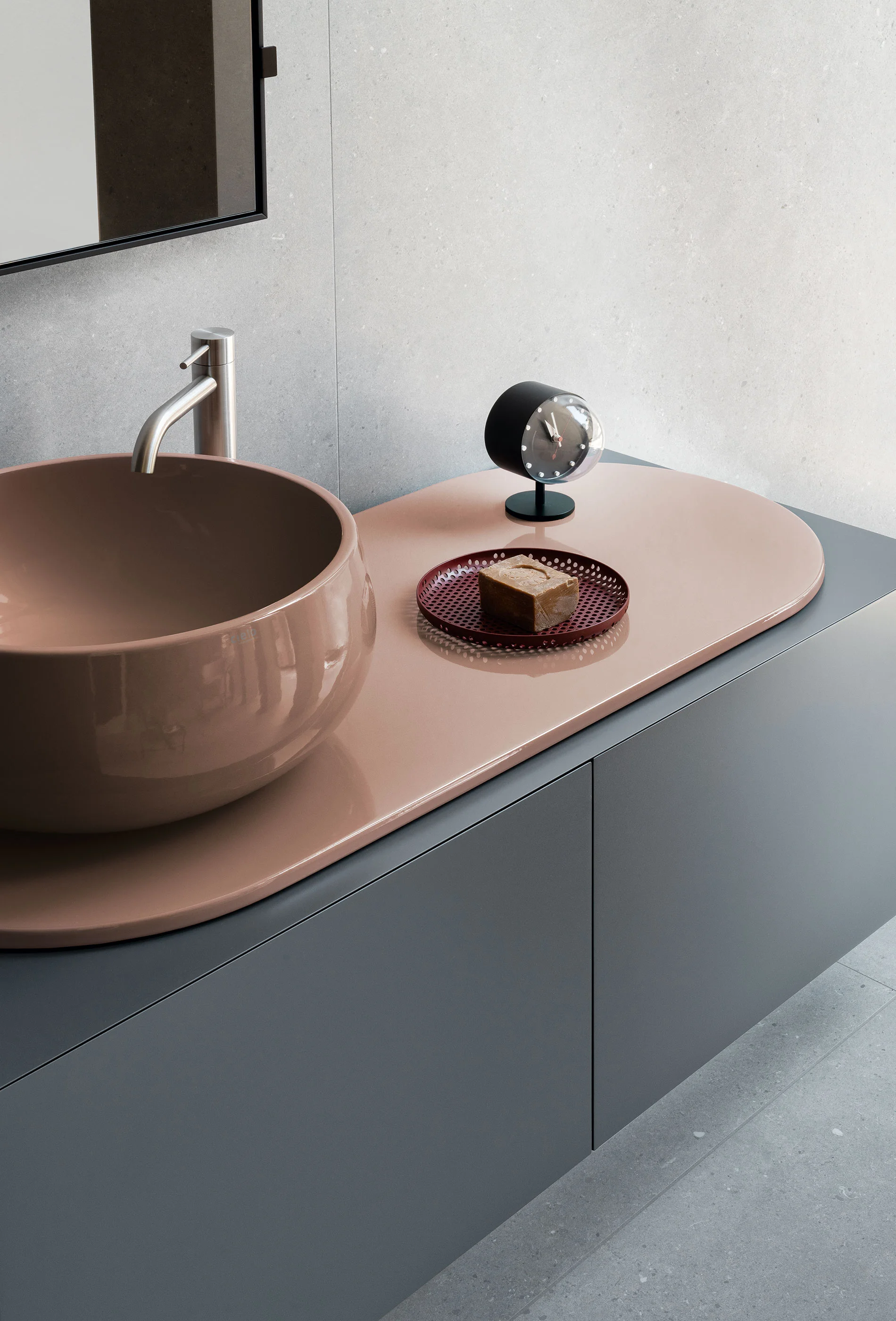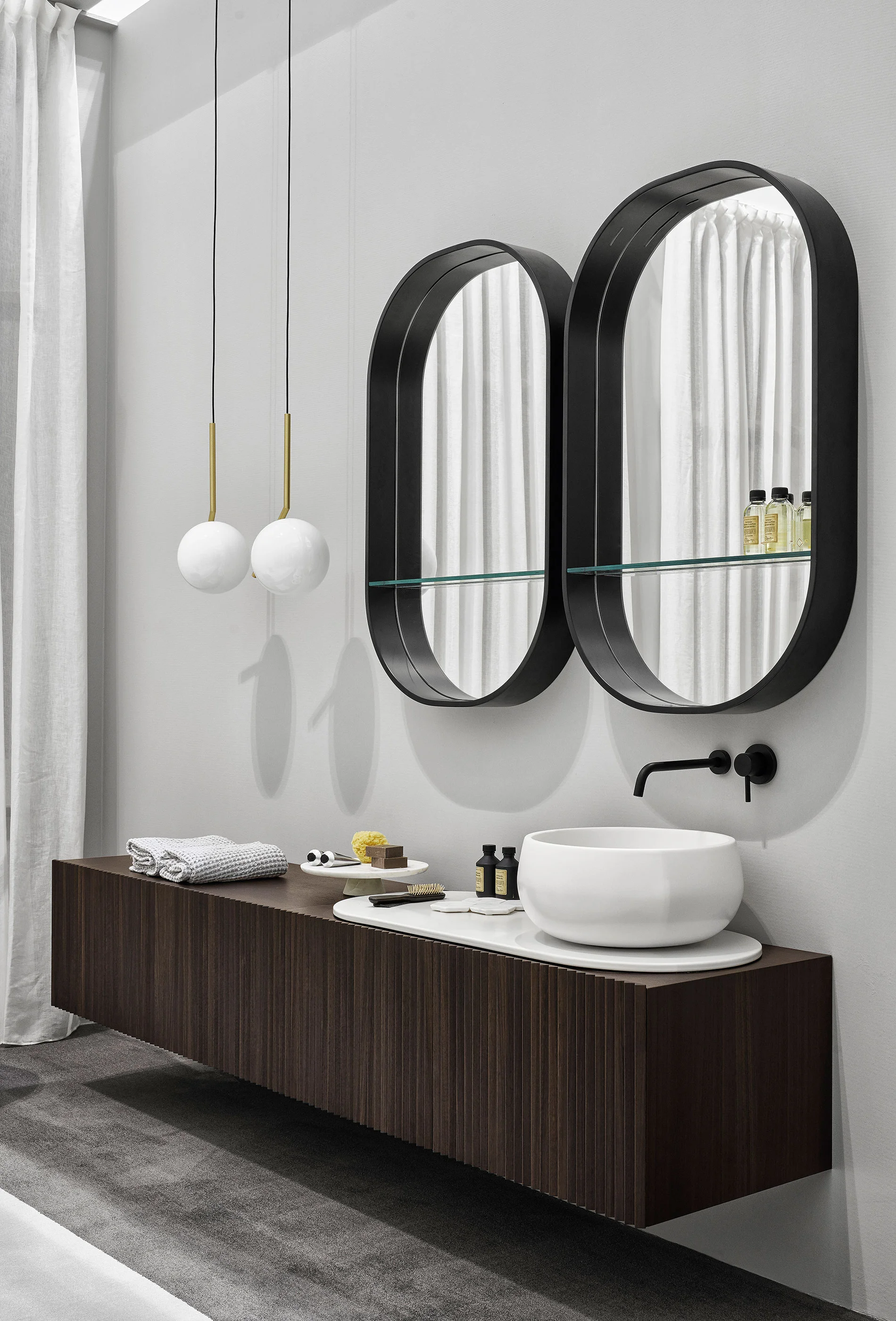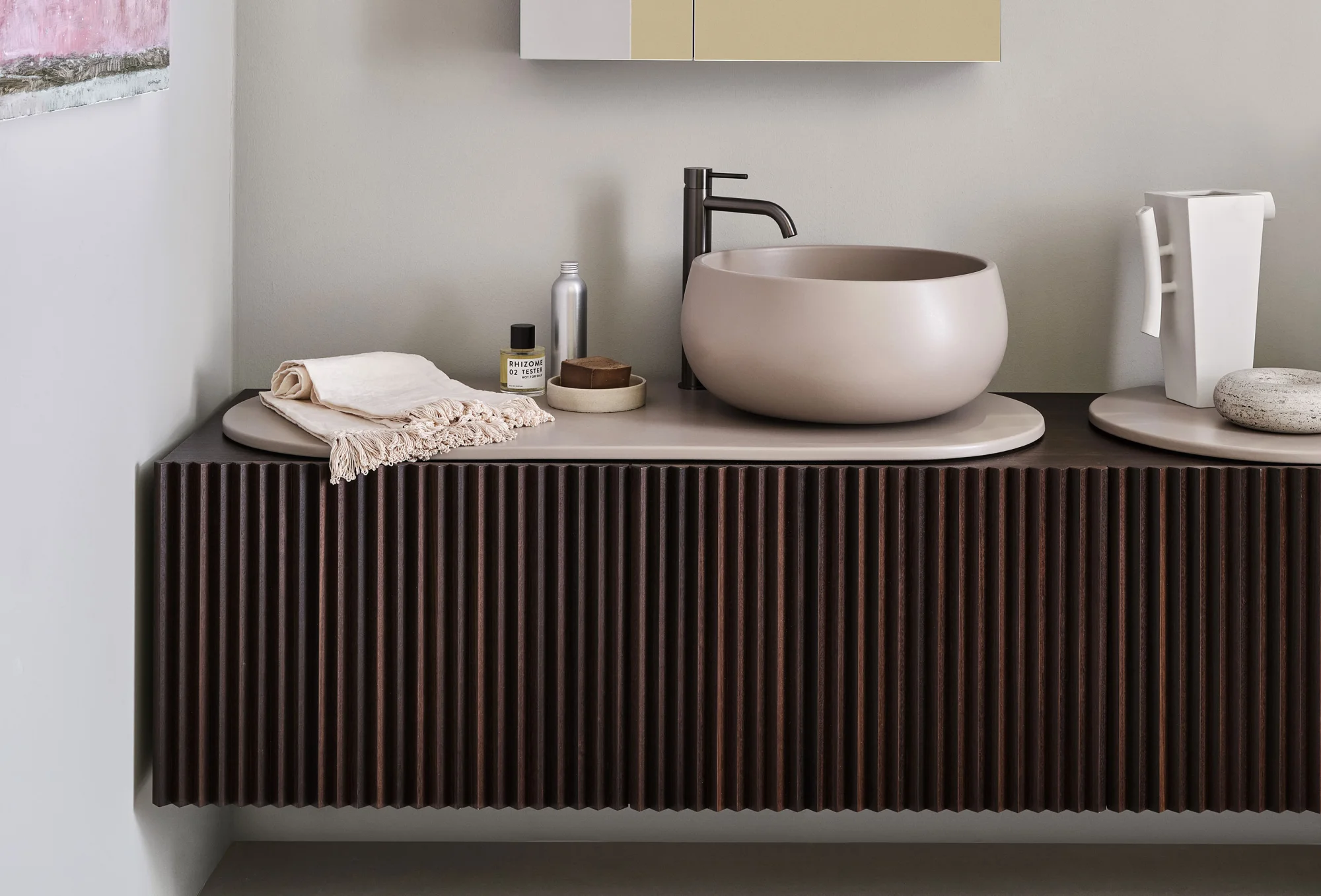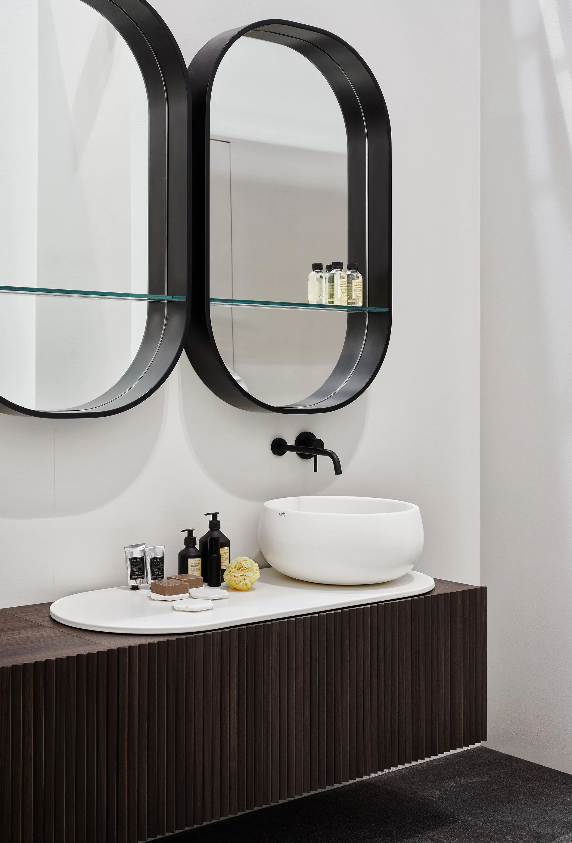 Il design di Delfo celebra l’incontro tra ceramica e legno, unendo rigore formale e calore materico. Il progetto si esprime attraverso due diverse interpretazioni del piano: l’iconico top ovale dal segno scultoreo e la soluzione con piano ceramico a filo mobile, caratterizzato da eleganti alzatine salvagoccia che incorniciano e proteggono le superfici.