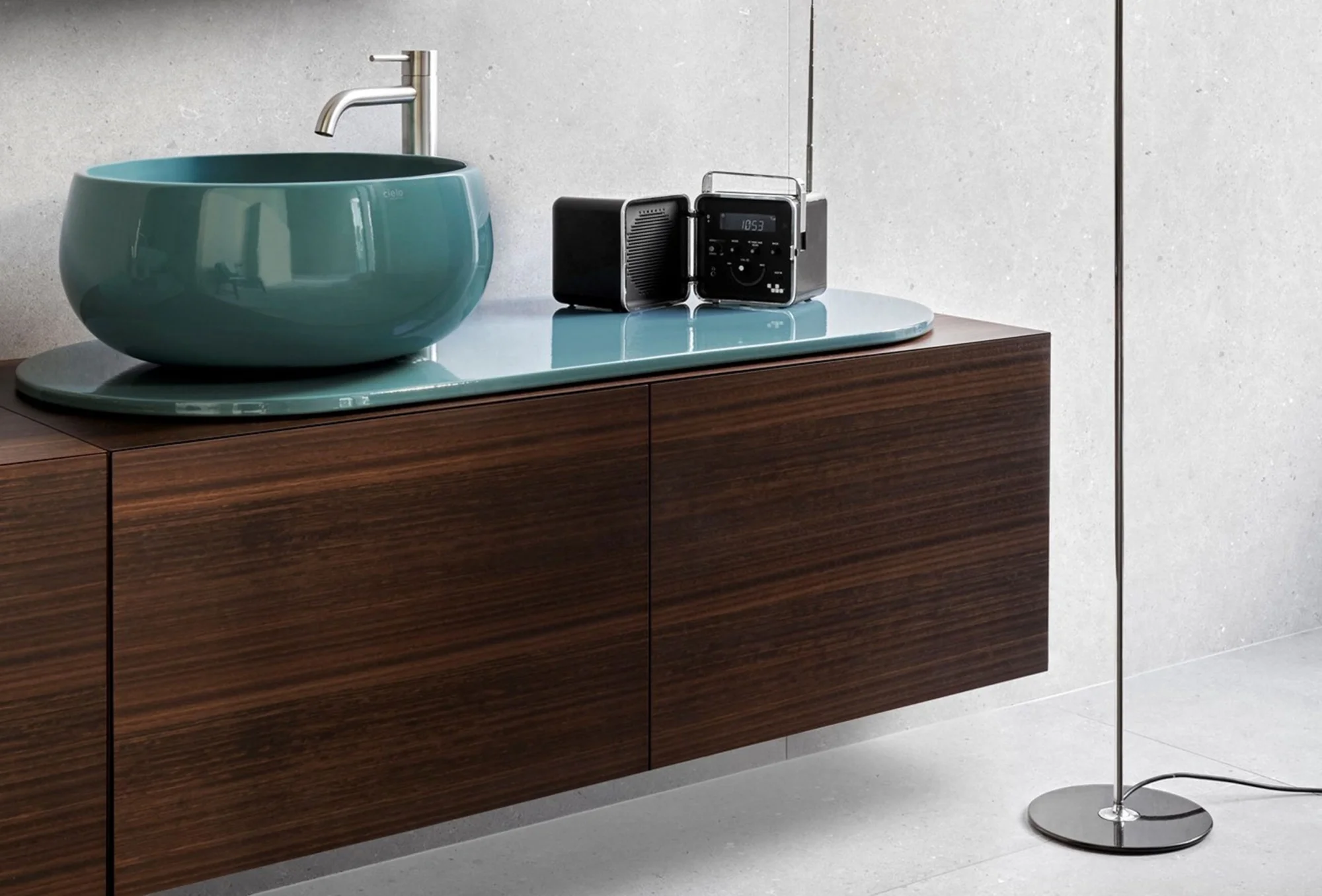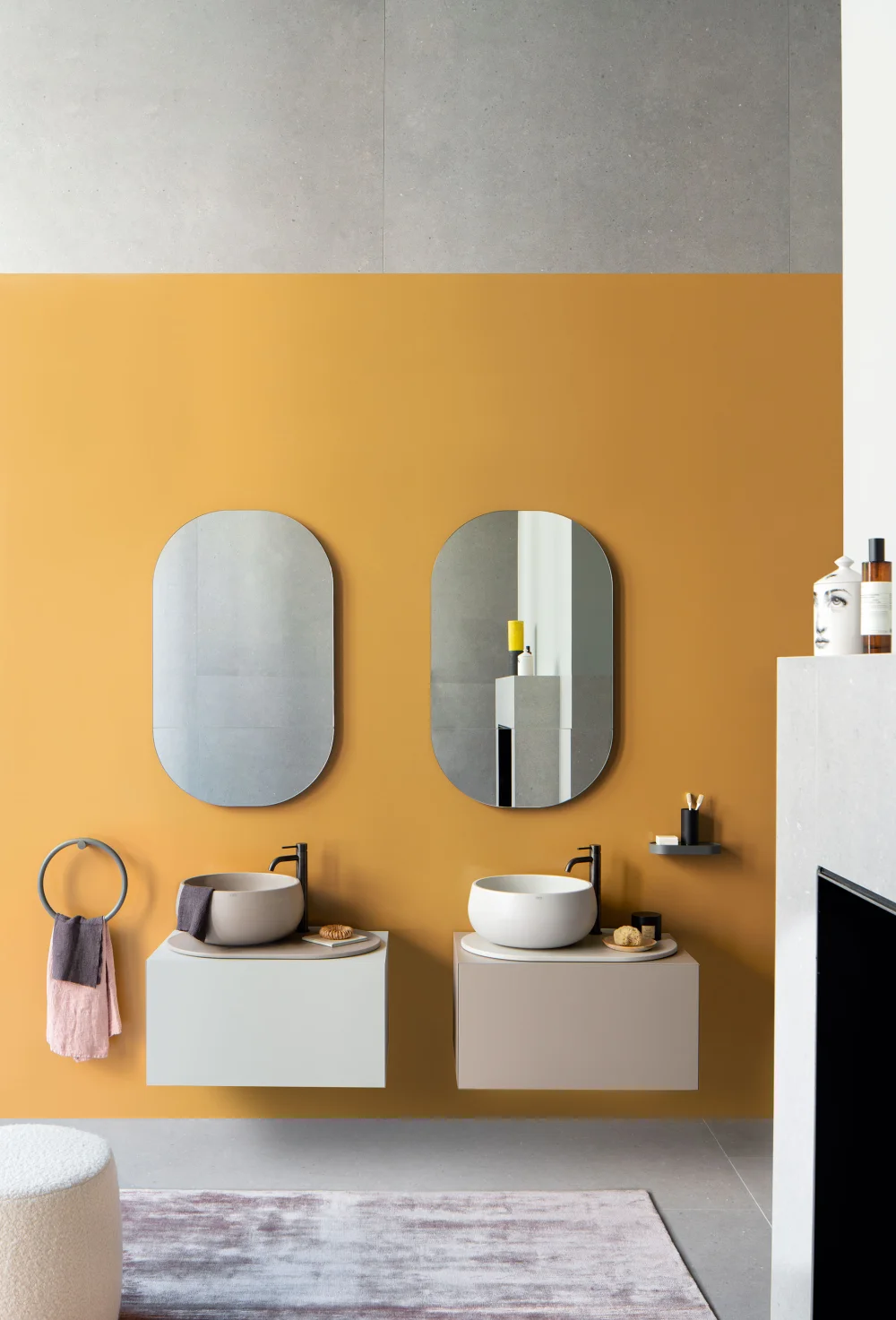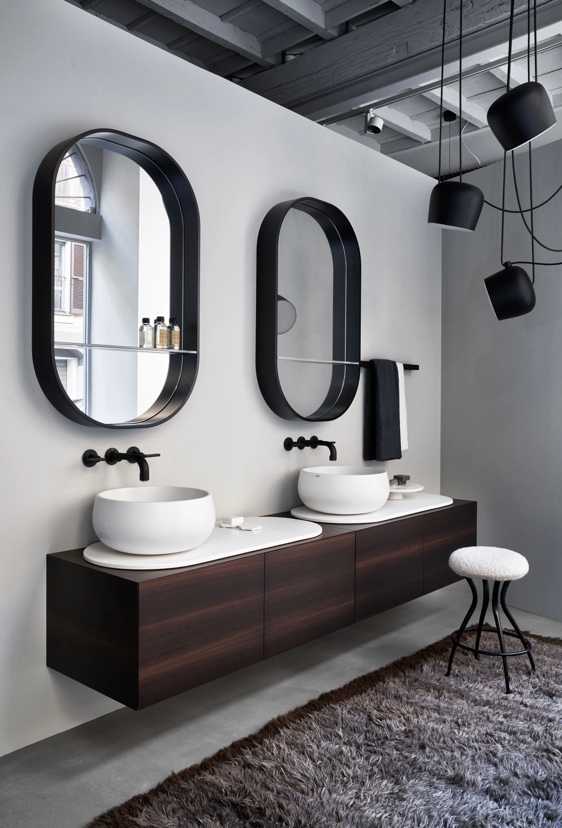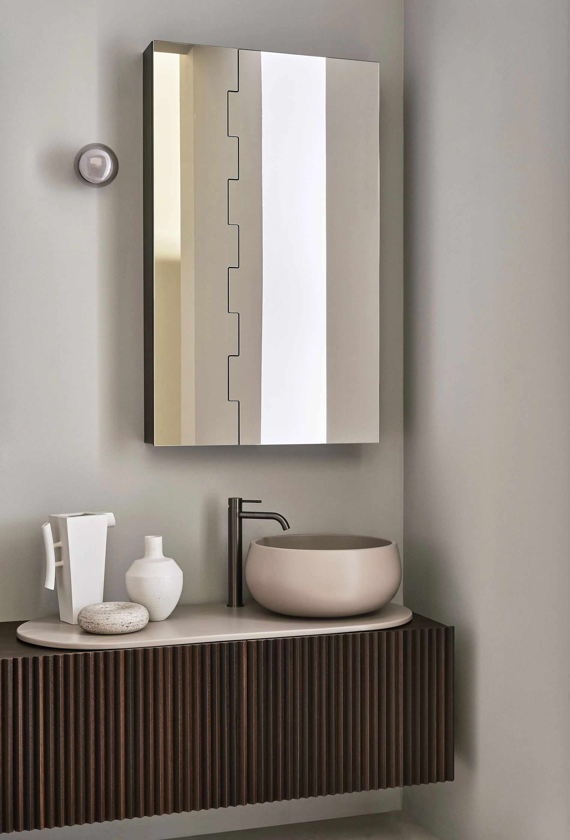Il design di Delfo celebra l’incontro tra ceramica e legno, unendo rigore formale e calore materico. Il progetto si esprime attraverso due diverse interpretazioni del piano: l’iconico top ovale dal segno scultoreo e la soluzione con piano ceramico a filo mobile, caratterizzato da eleganti alzatine salvagoccia che incorniciano e proteggono le superfici.