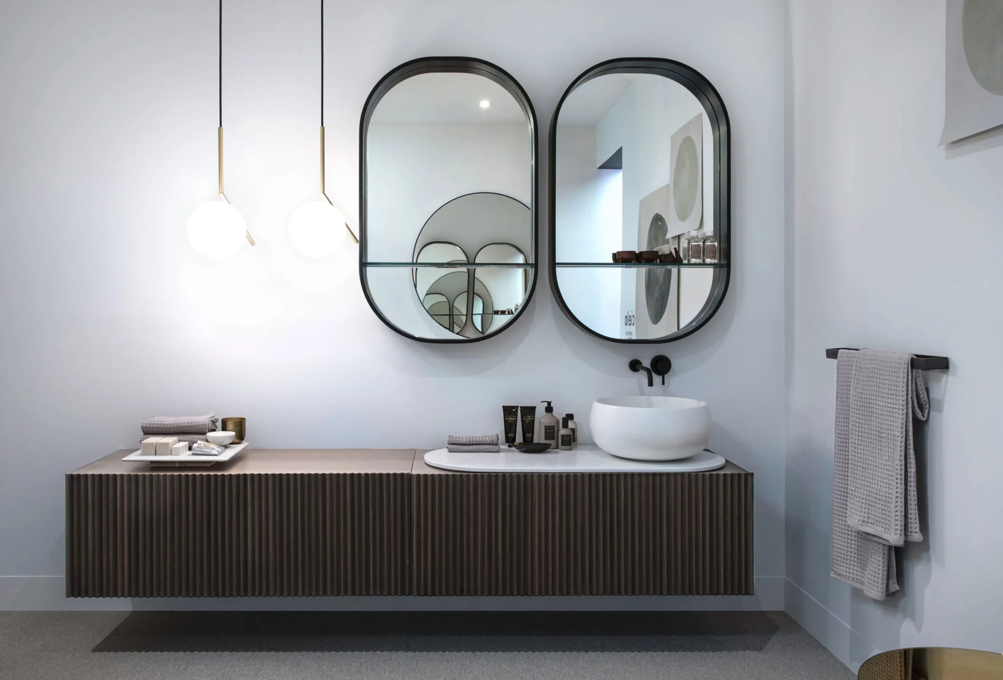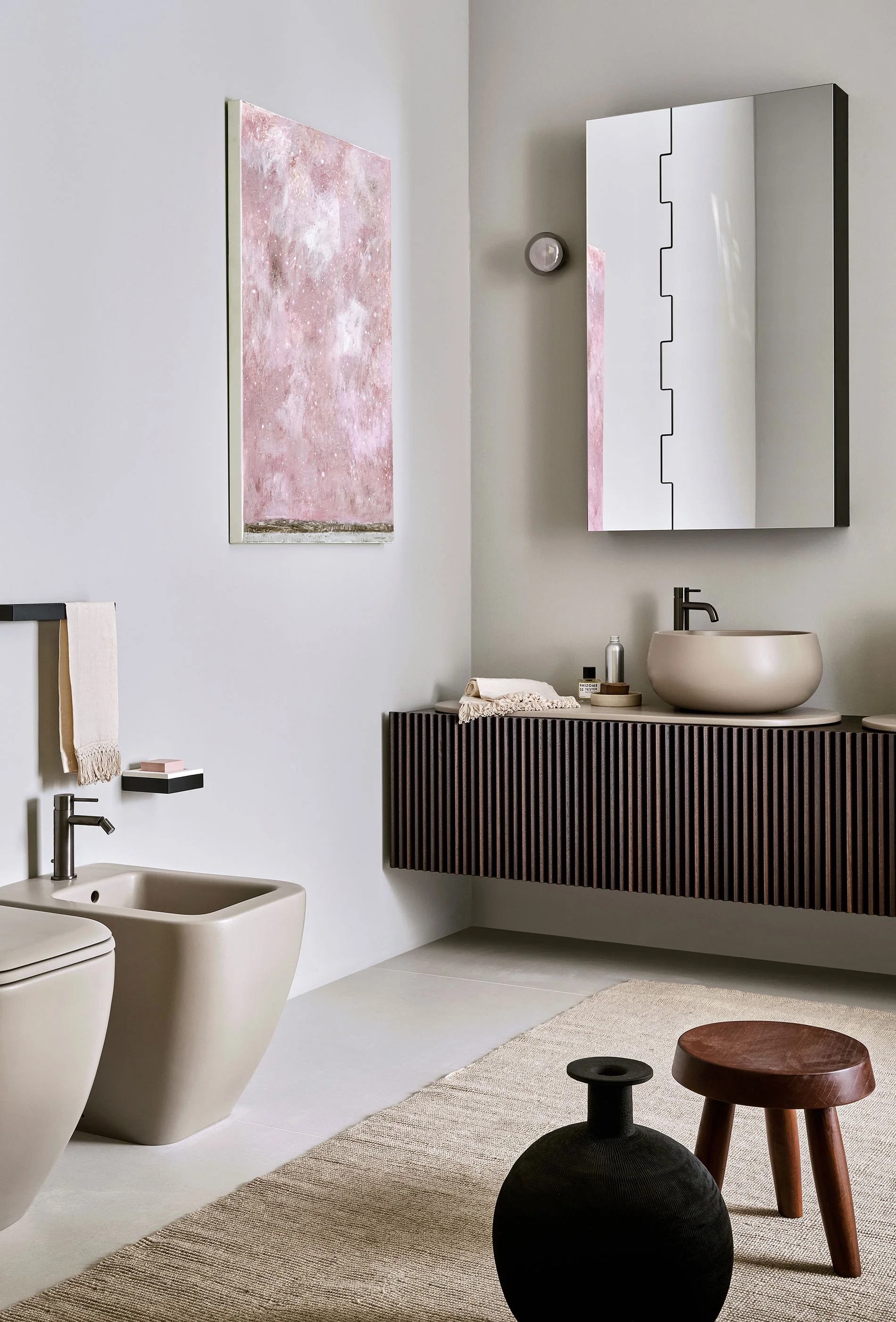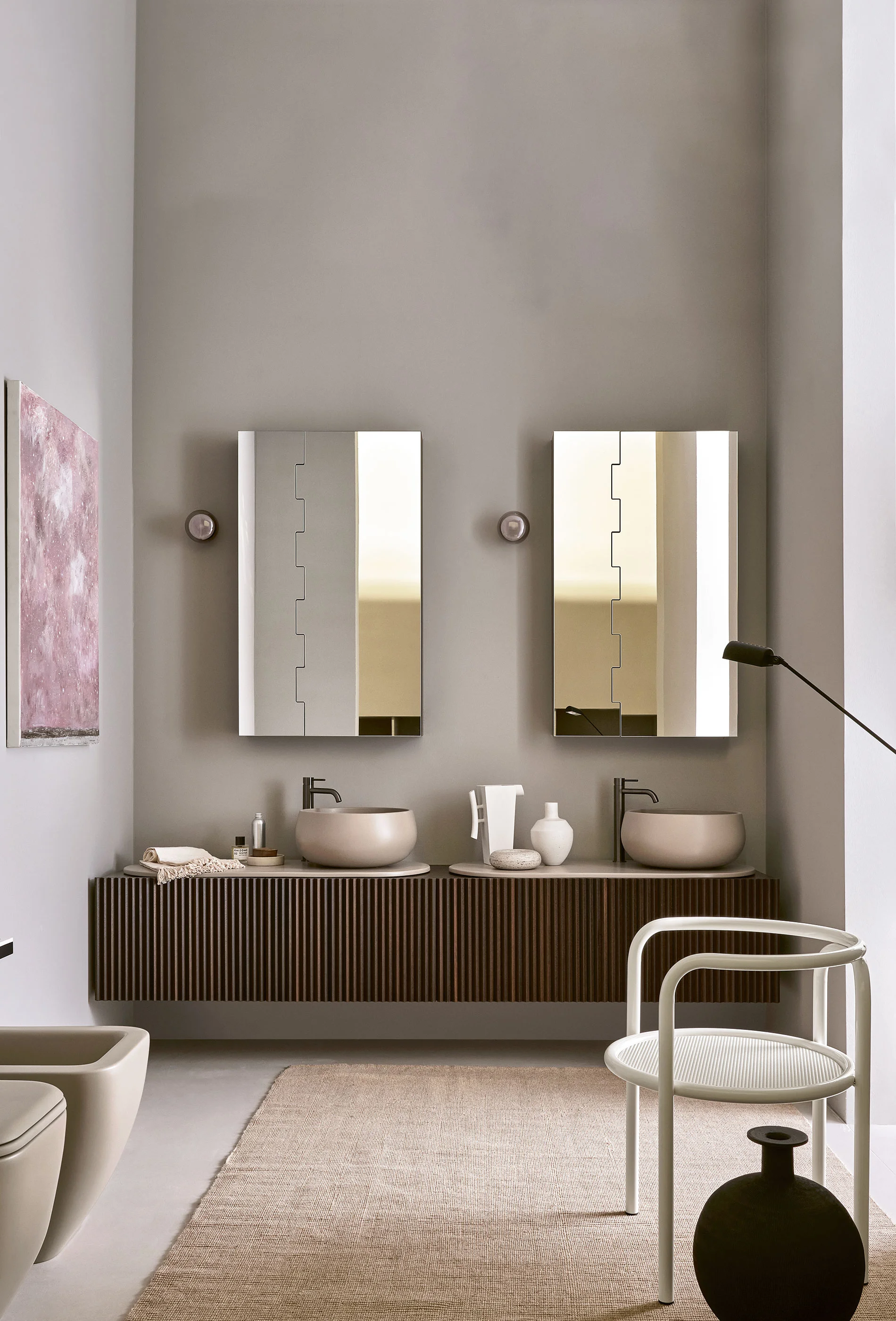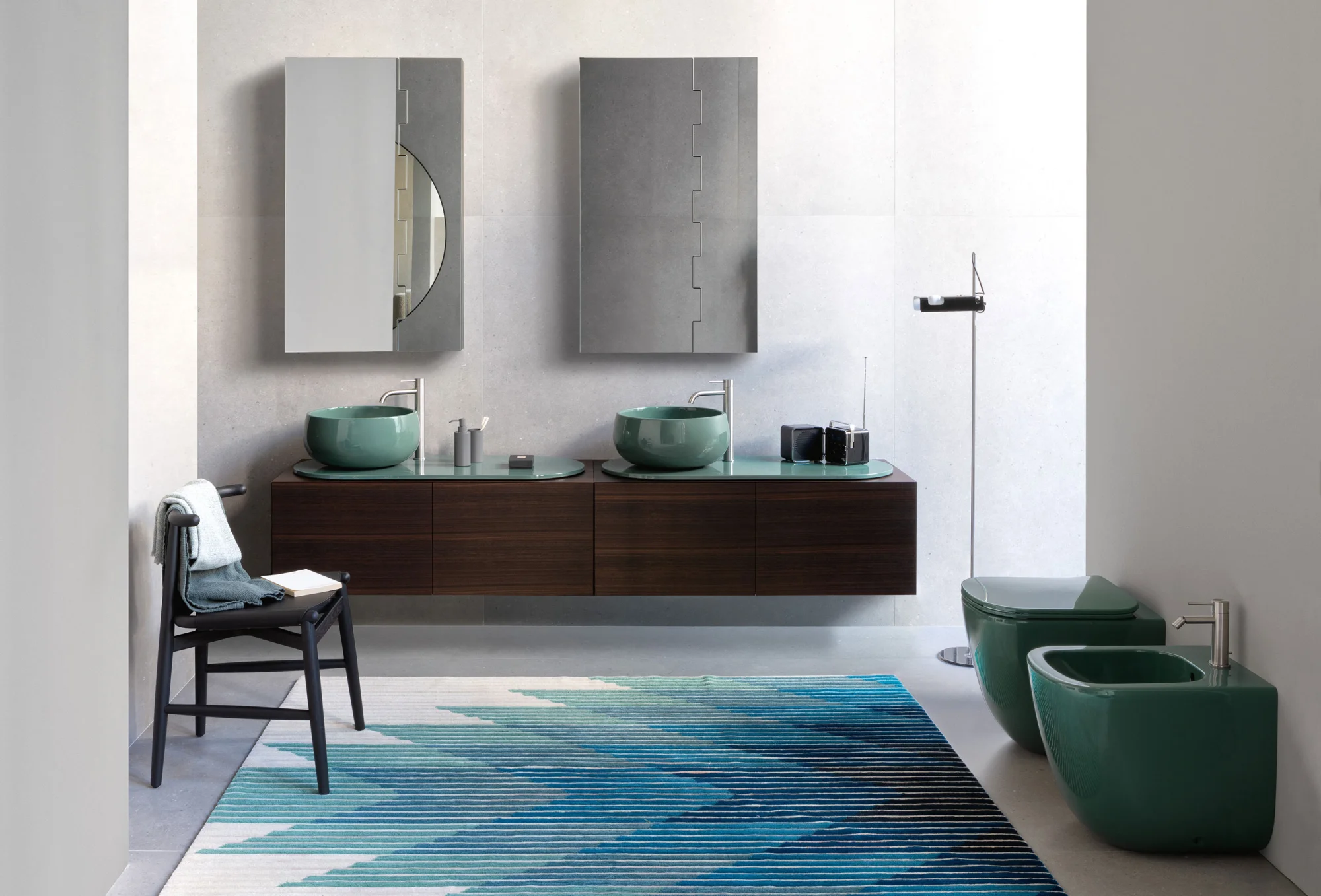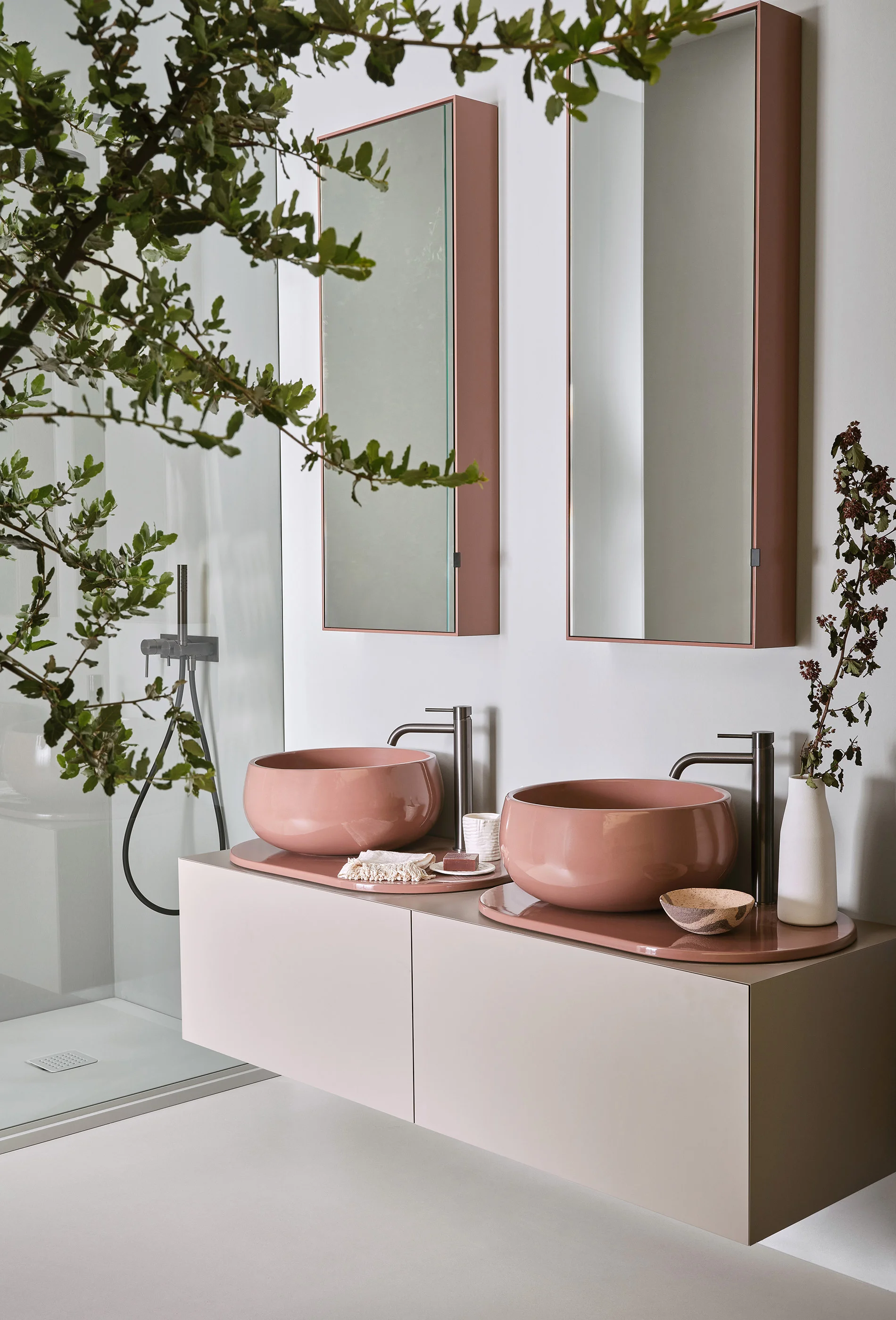 Il design di Delfo celebra l’incontro tra ceramica e legno, unendo rigore formale e calore materico. Il progetto si esprime attraverso due diverse interpretazioni del piano: l’iconico top ovale dal segno scultoreo e la soluzione con piano ceramico a filo mobile, caratterizzato da eleganti alzatine salvagoccia che incorniciano e proteggono le superfici.