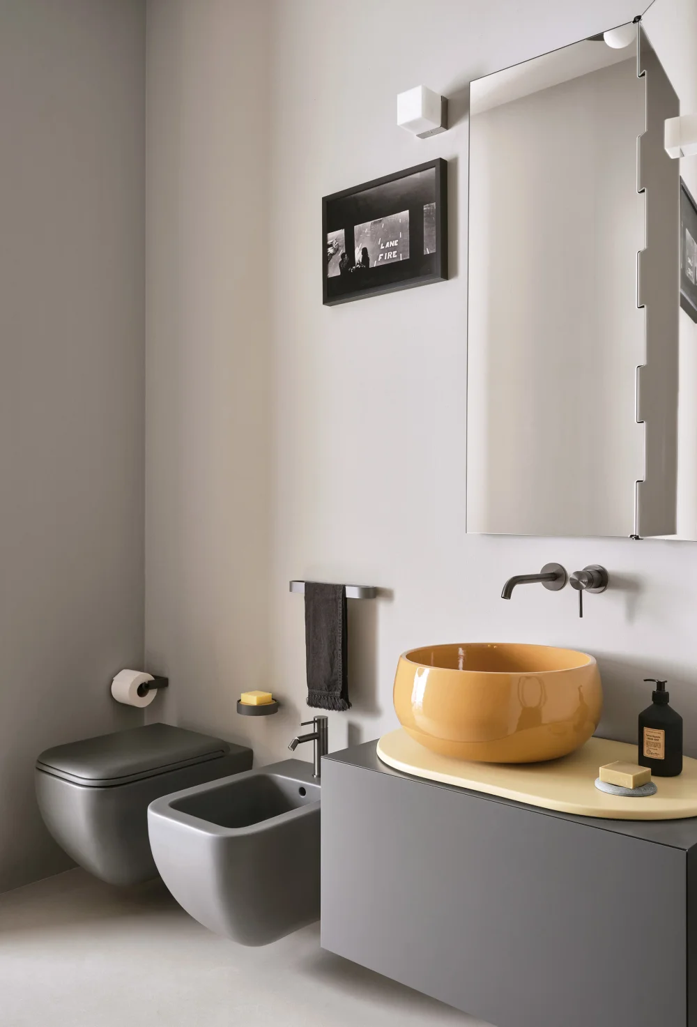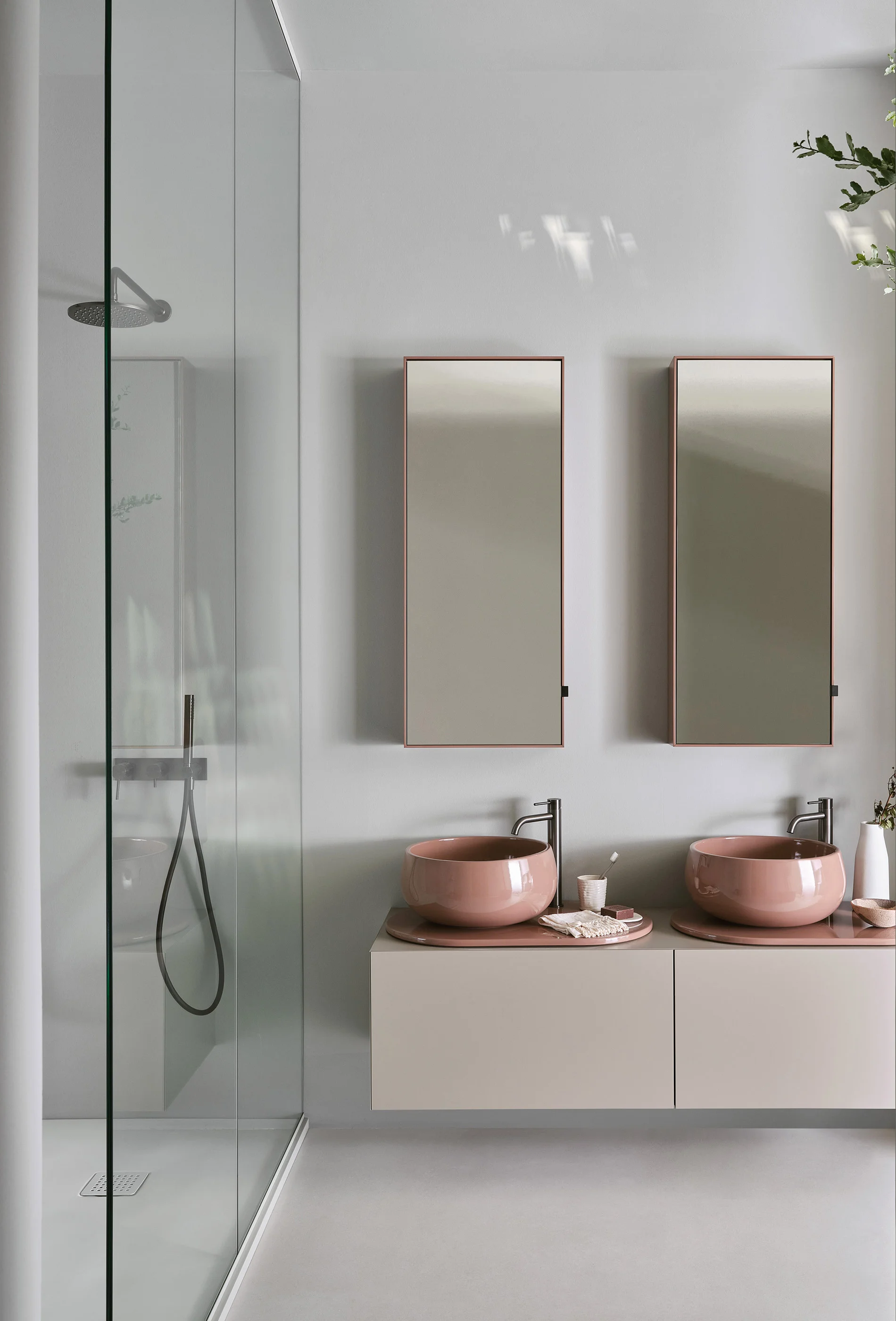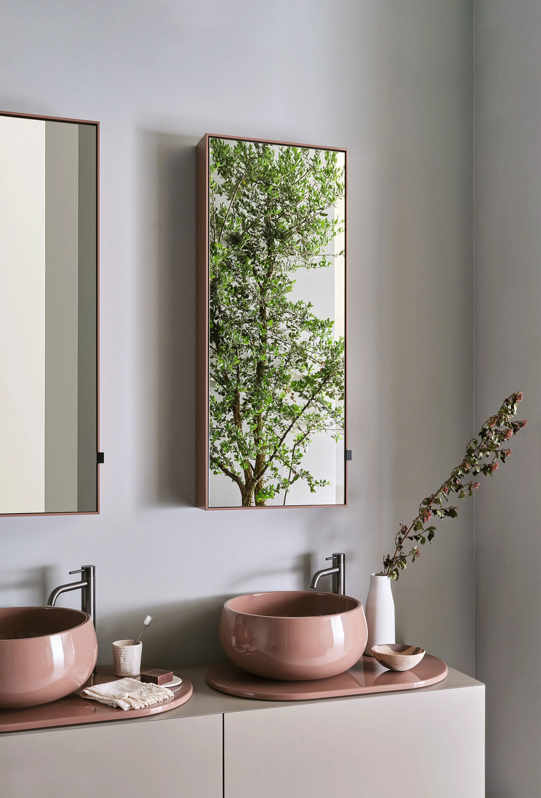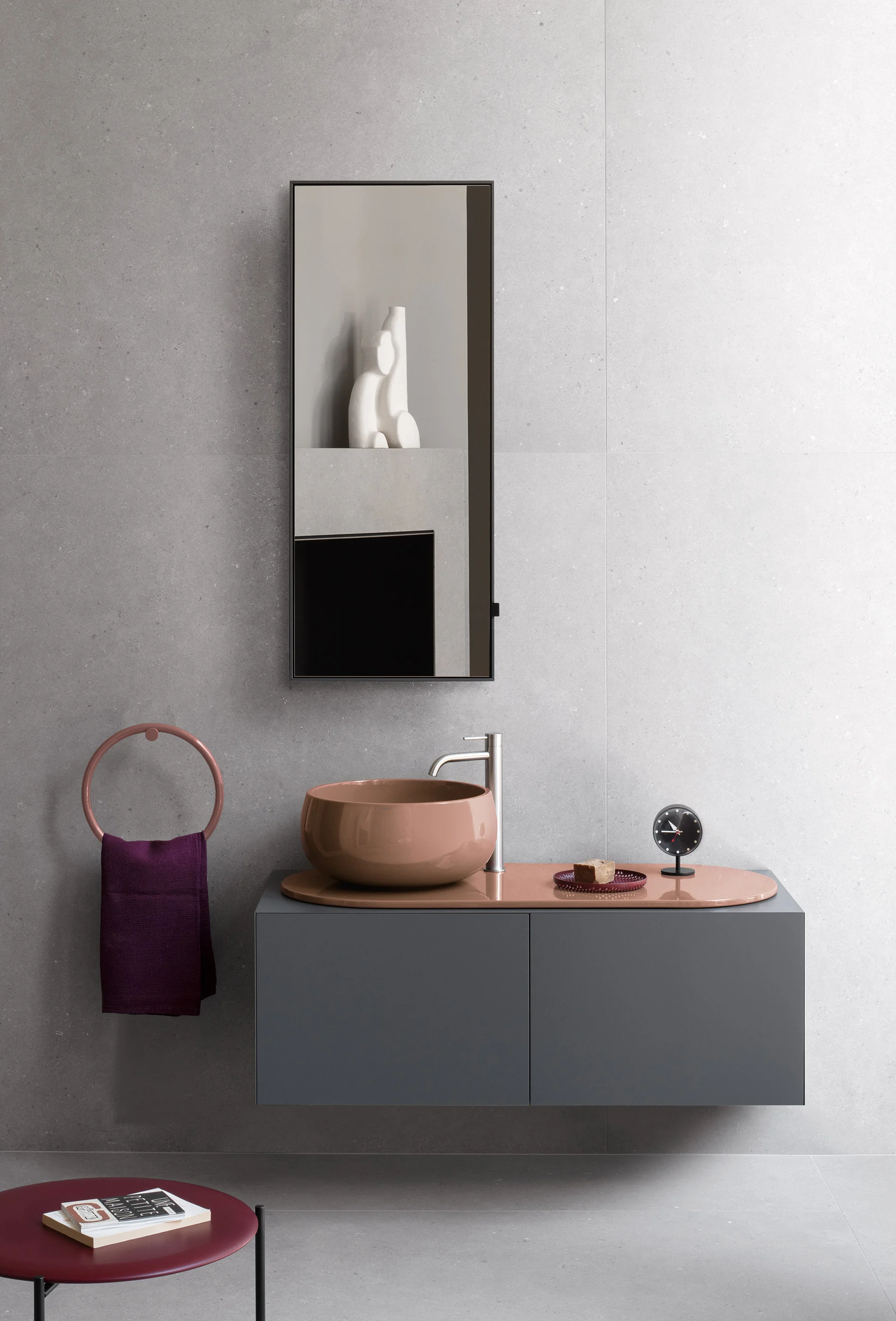 Il design di Delfo celebra l’incontro tra ceramica e legno, unendo rigore formale e calore materico. Il progetto si esprime attraverso due diverse interpretazioni del piano: l’iconico top ovale dal segno scultoreo e la soluzione con piano ceramico a filo mobile, caratterizzato da eleganti alzatine salvagoccia che incorniciano e proteggono le superfici.