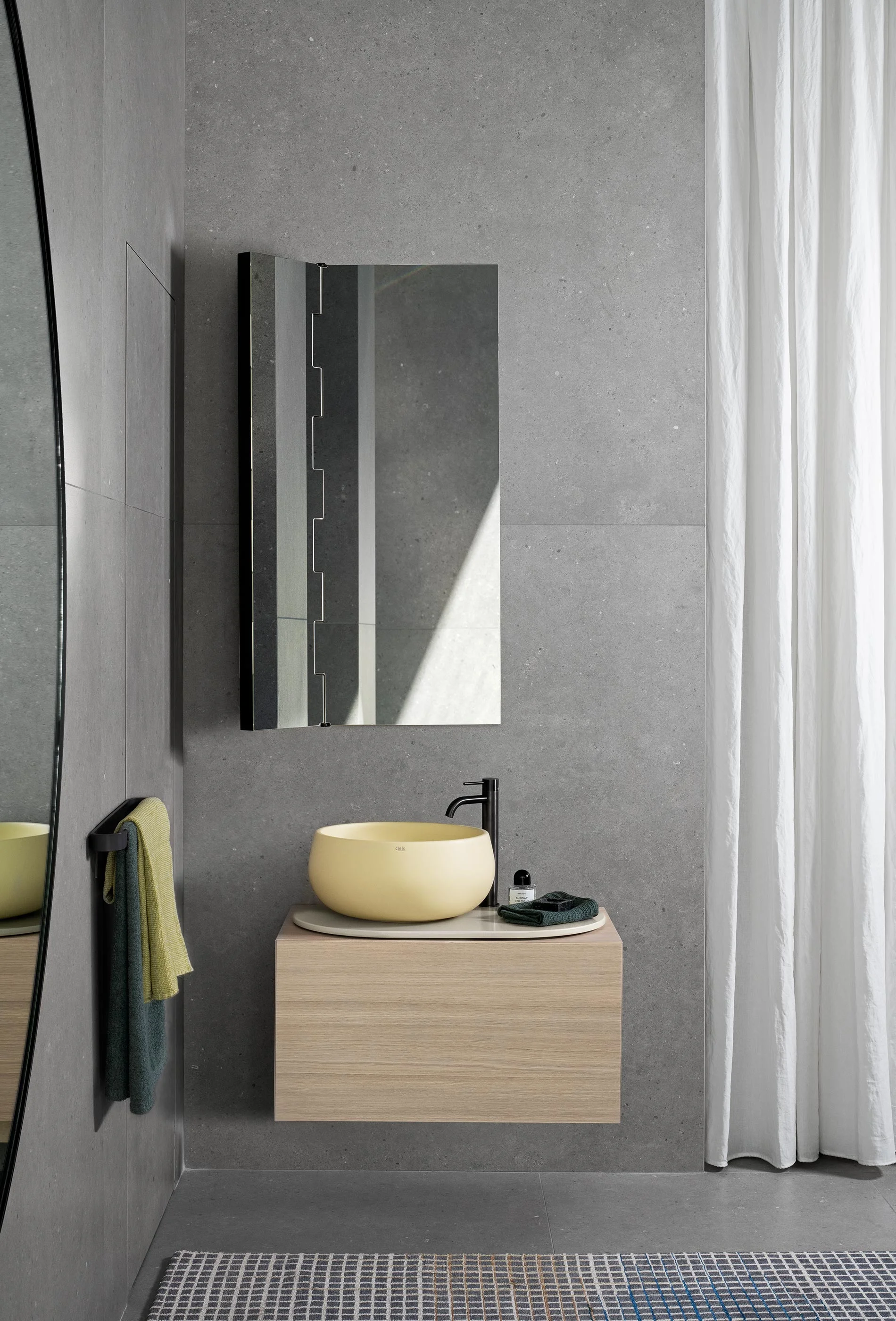 Entrambe le versioni sono disponibili in un'ampia scala dimensionale — dai 76 cm fino ai 226 cm — e vestite dalle finiture opache o lucide della gamma Cielo. Il mobile contenitore sospeso acquista una forza visiva unica nella variante con anta a listelli in massello triangolari, un dettaglio artigianale che genera suggestivi giochi di luci e ombre.