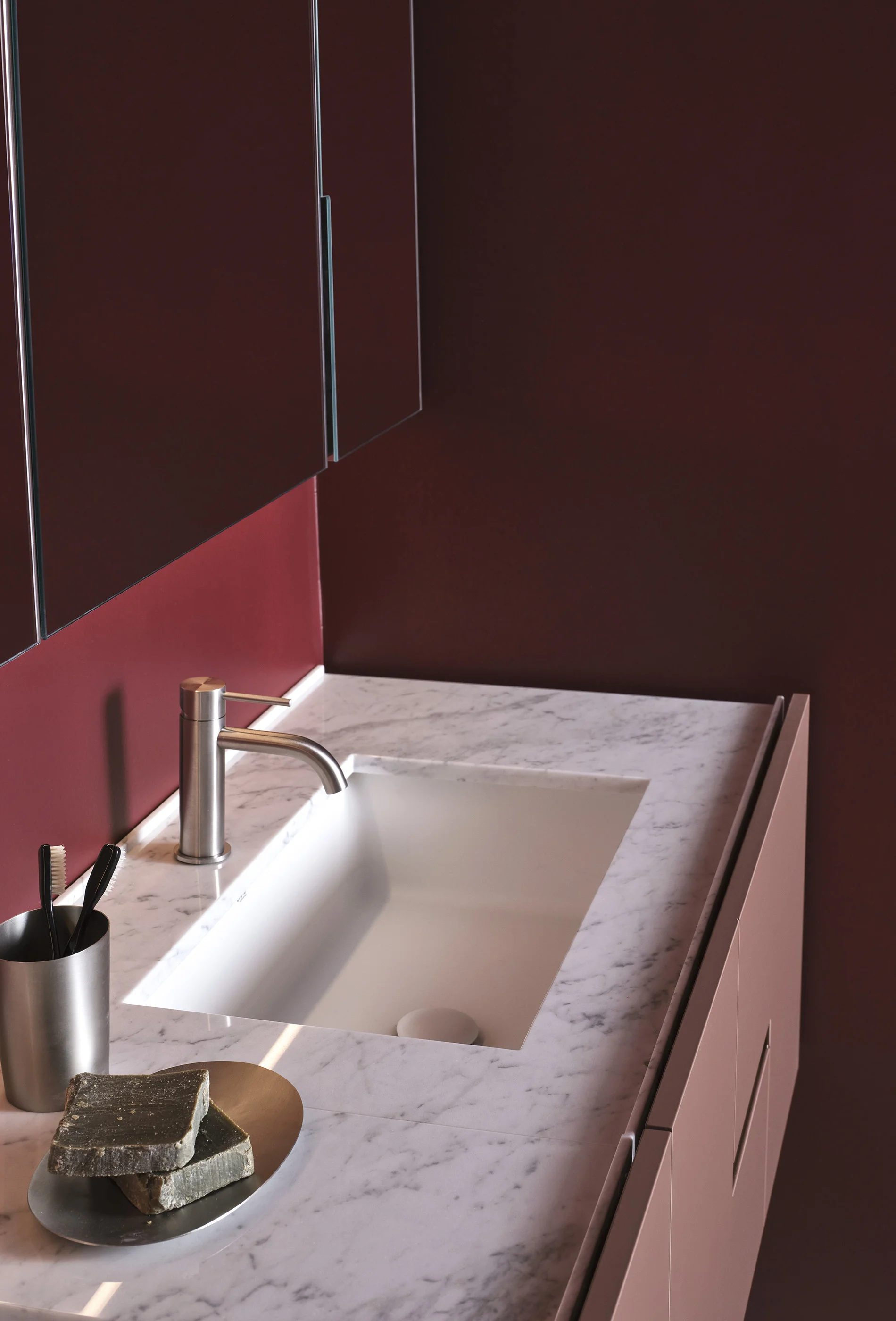 Filo è un sistema modulare per l’arredo bagno progettato per offrire funzionalità e purezza formale. La collezione comprende lavabi rettangolari da sottopiano integrati in superfici in ceramica o marmo, che si inseriscono con discrezione all’interno del progetto architettonico.