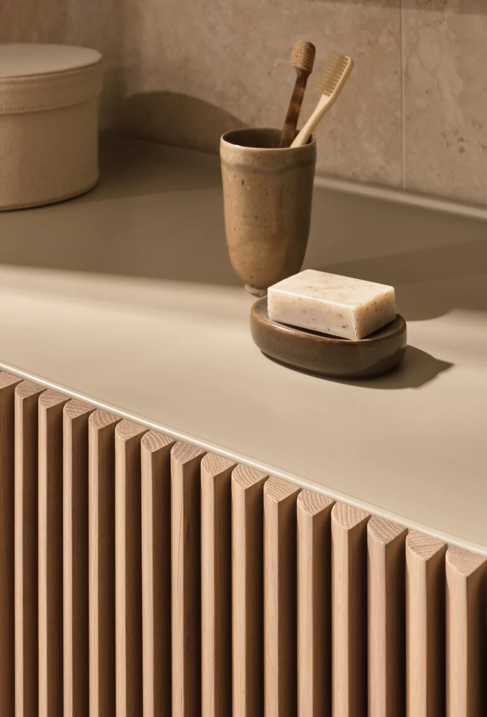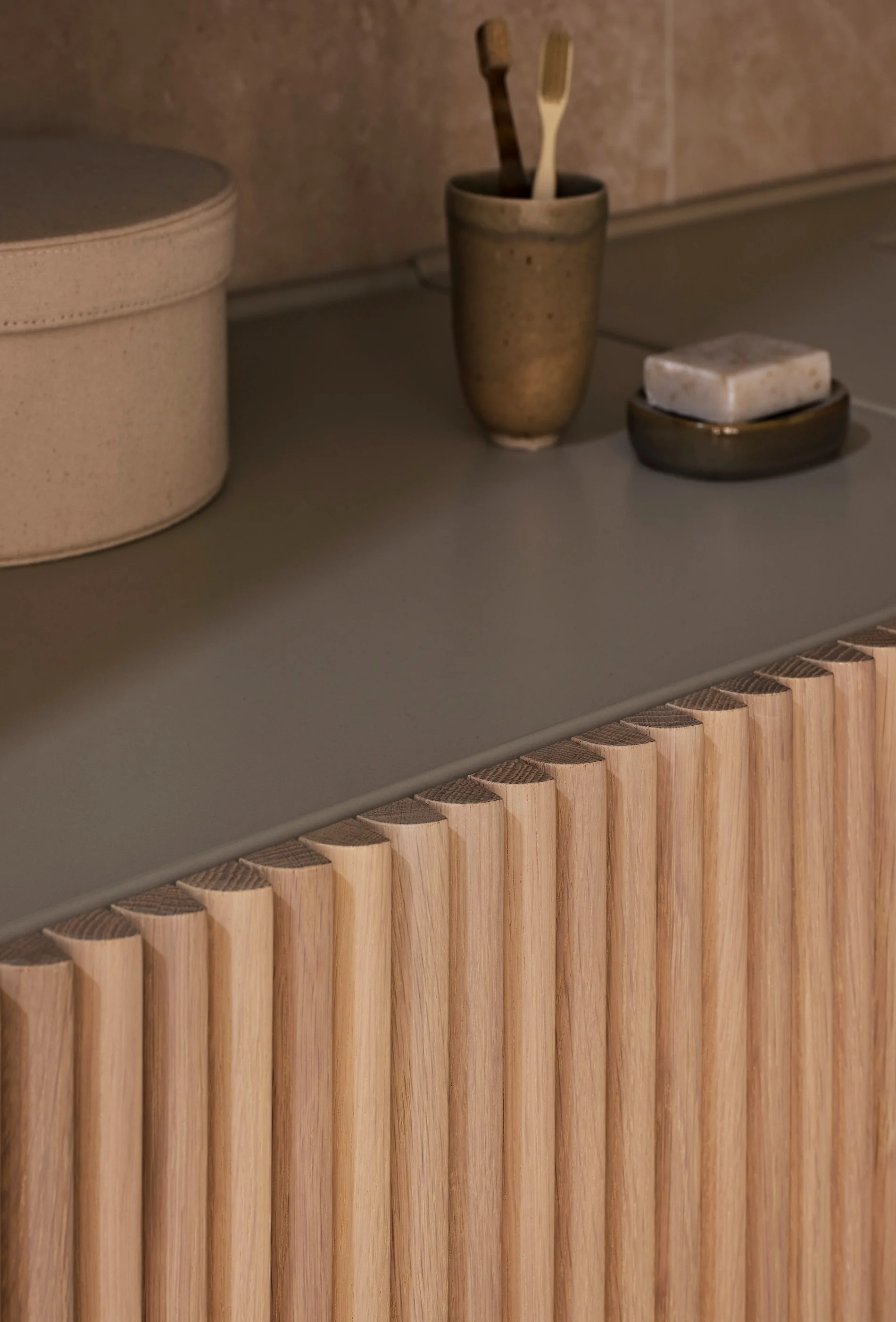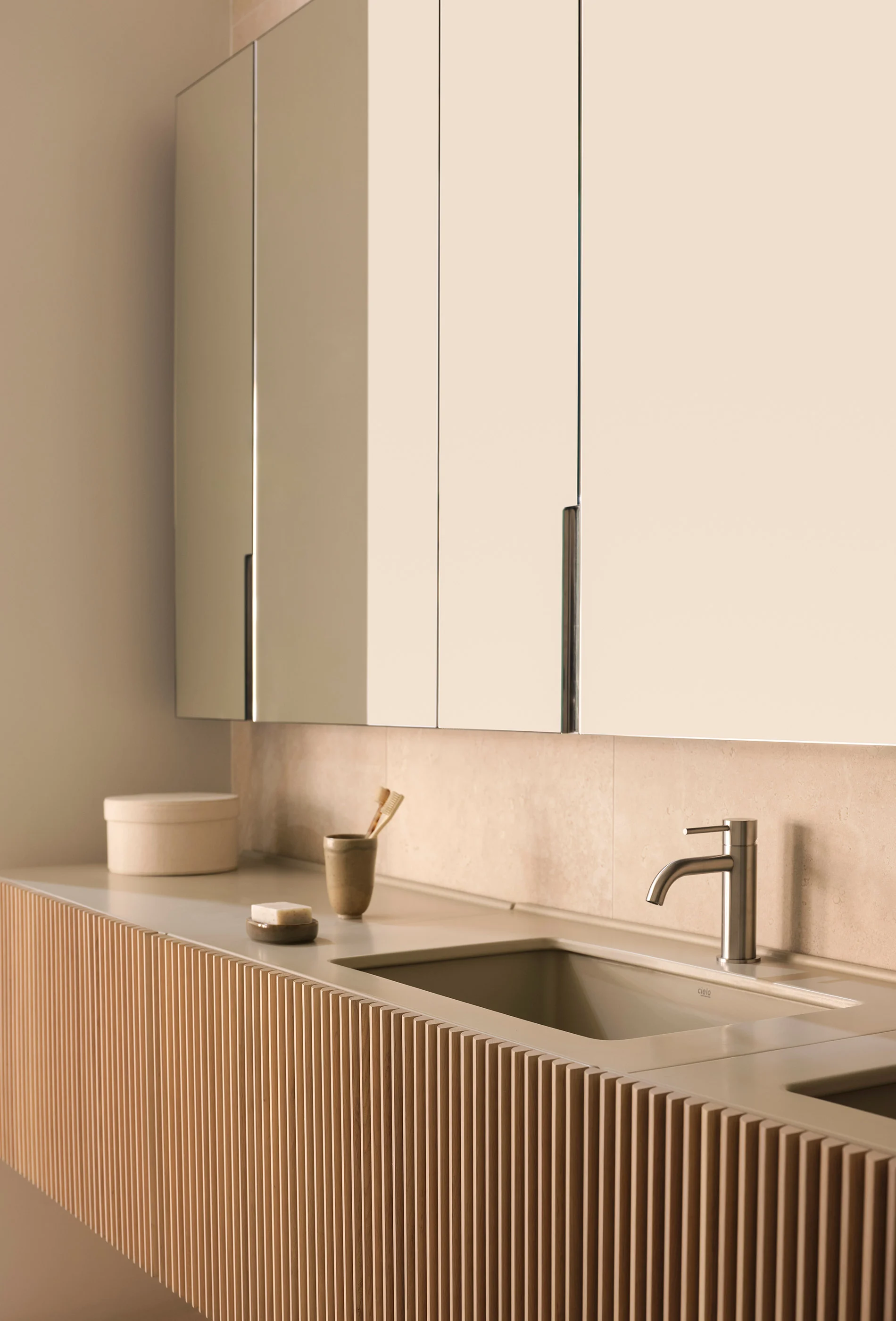 I mobili Filo, proposti nella misura da 90 cm, sono disponibili in diverse varianti: con maniglia orizzontale, verticale oppure con frontale a doghe. Ogni soluzione consente una lettura estetica diversa, mantenendo coerenza con il linguaggio essenziale della collezione.