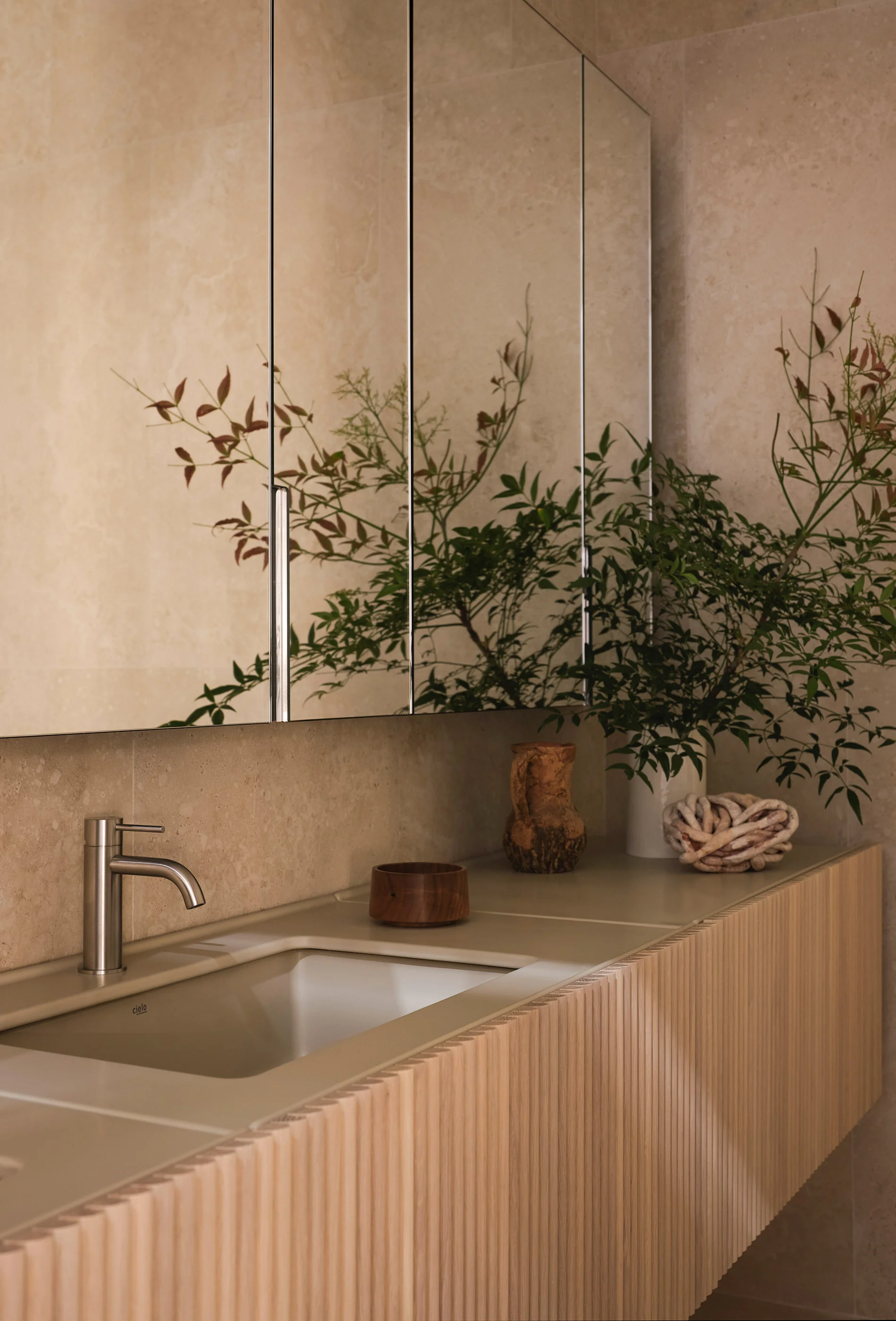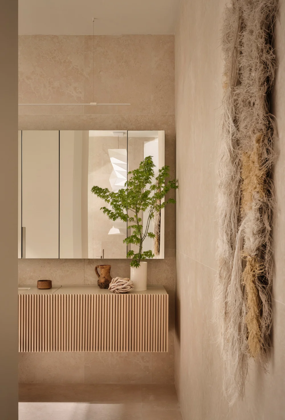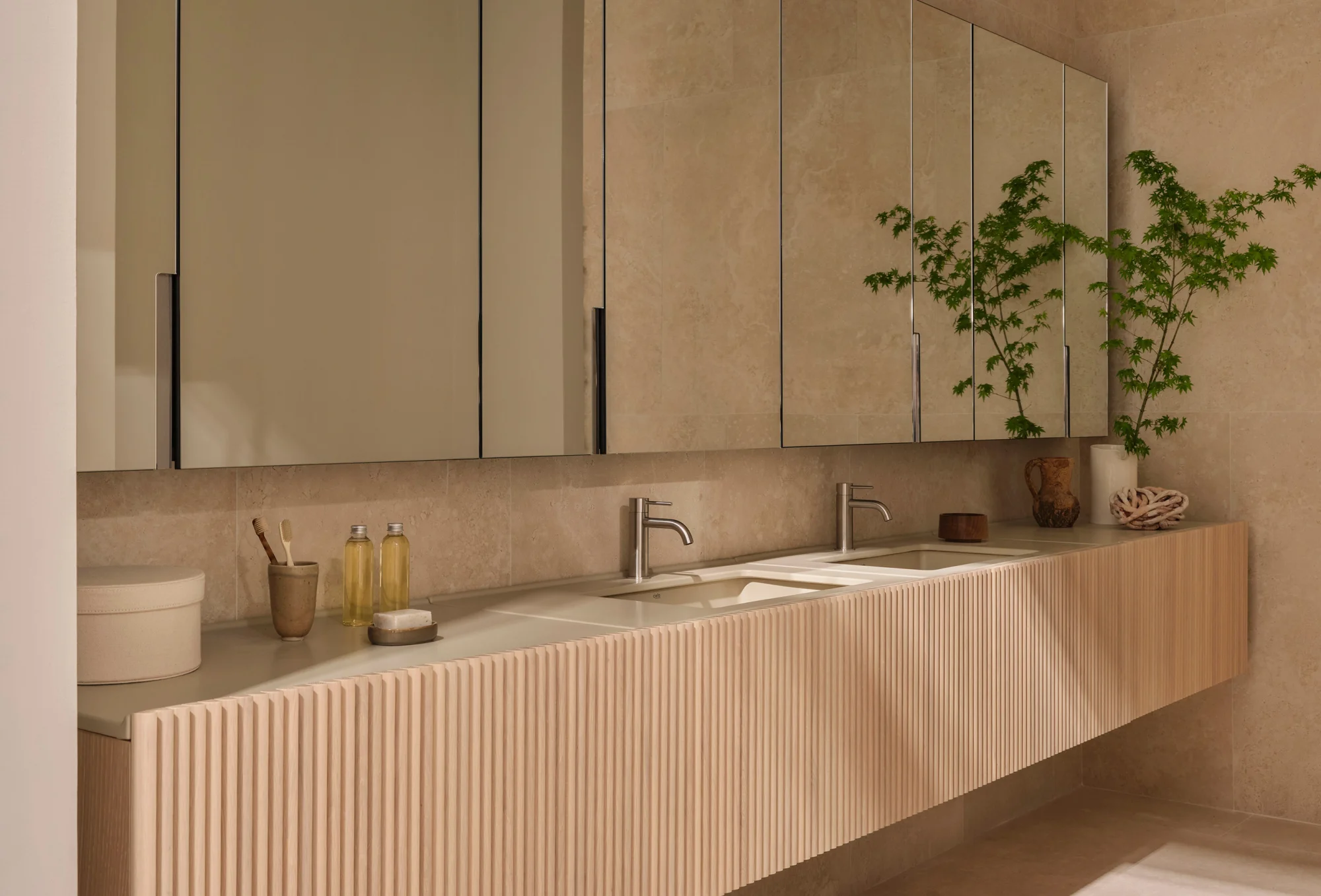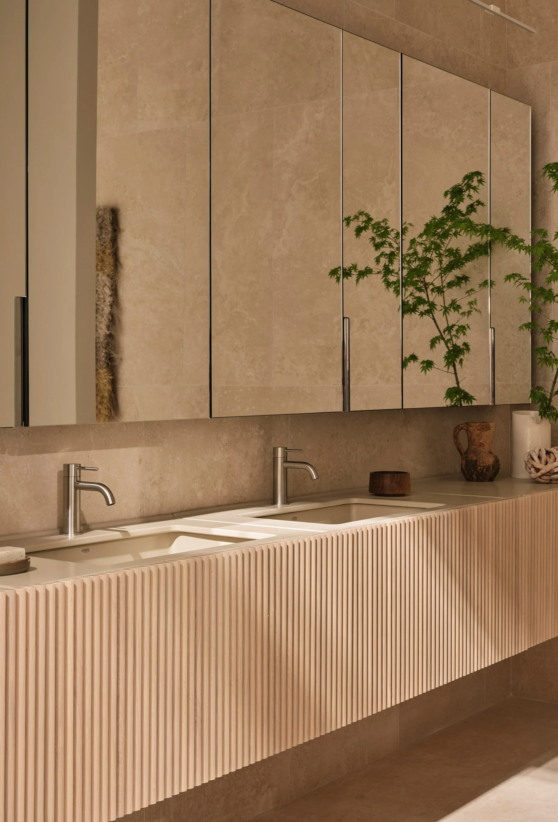 I mobili Filo, proposti nella misura da 90 cm, sono disponibili in diverse varianti: con maniglia orizzontale, verticale oppure con frontale a doghe. Ogni soluzione consente una lettura estetica diversa, mantenendo coerenza con il linguaggio essenziale della collezione.