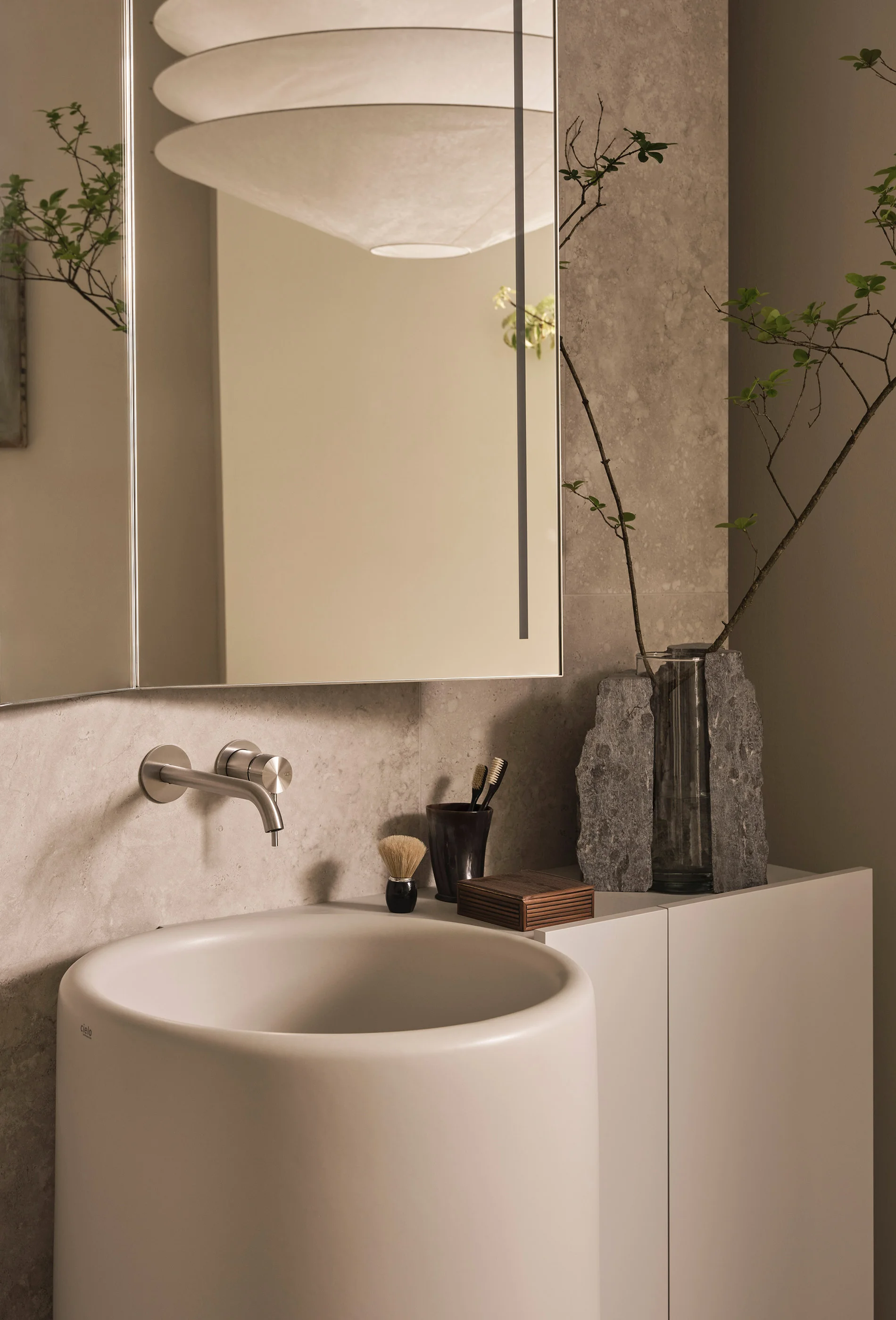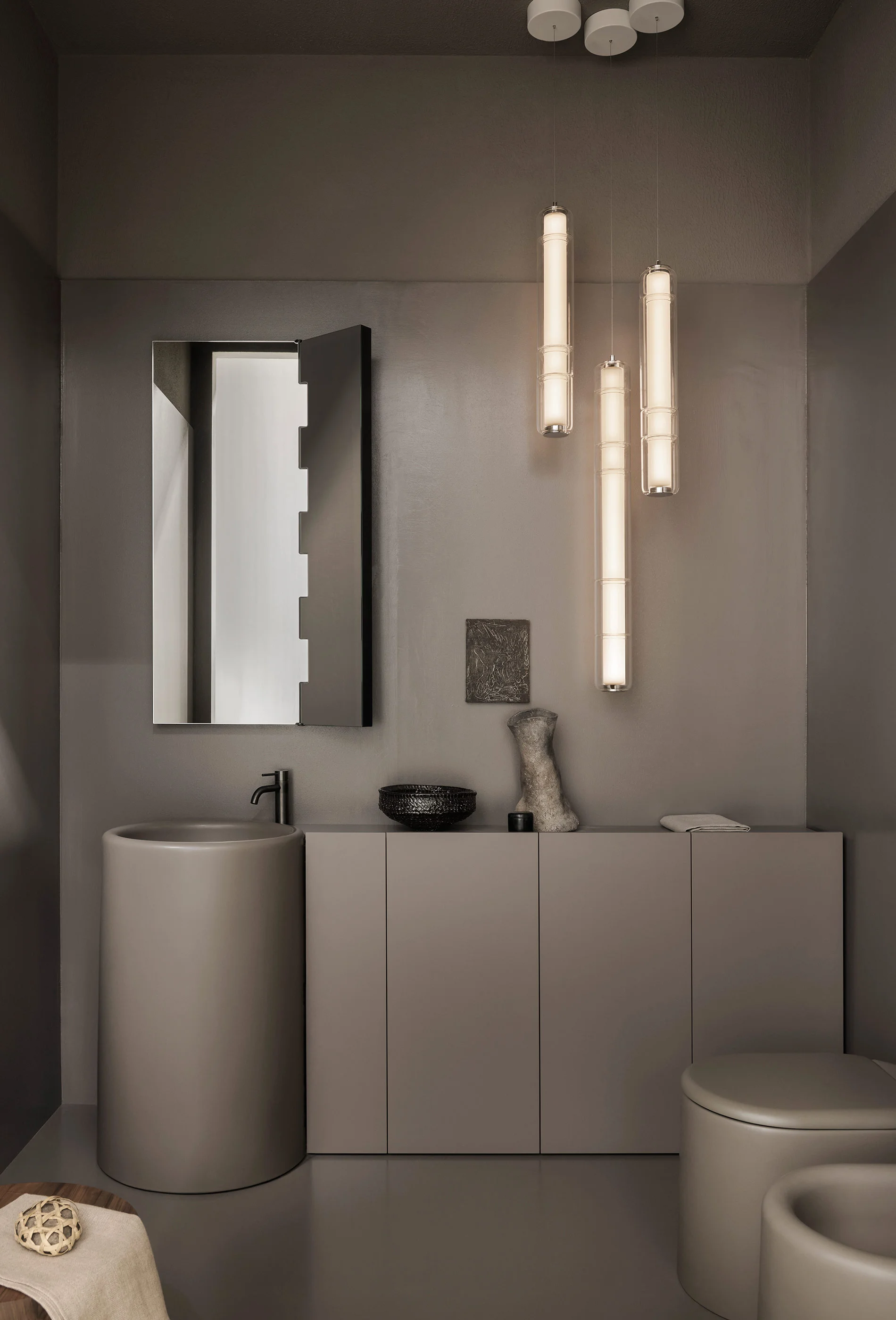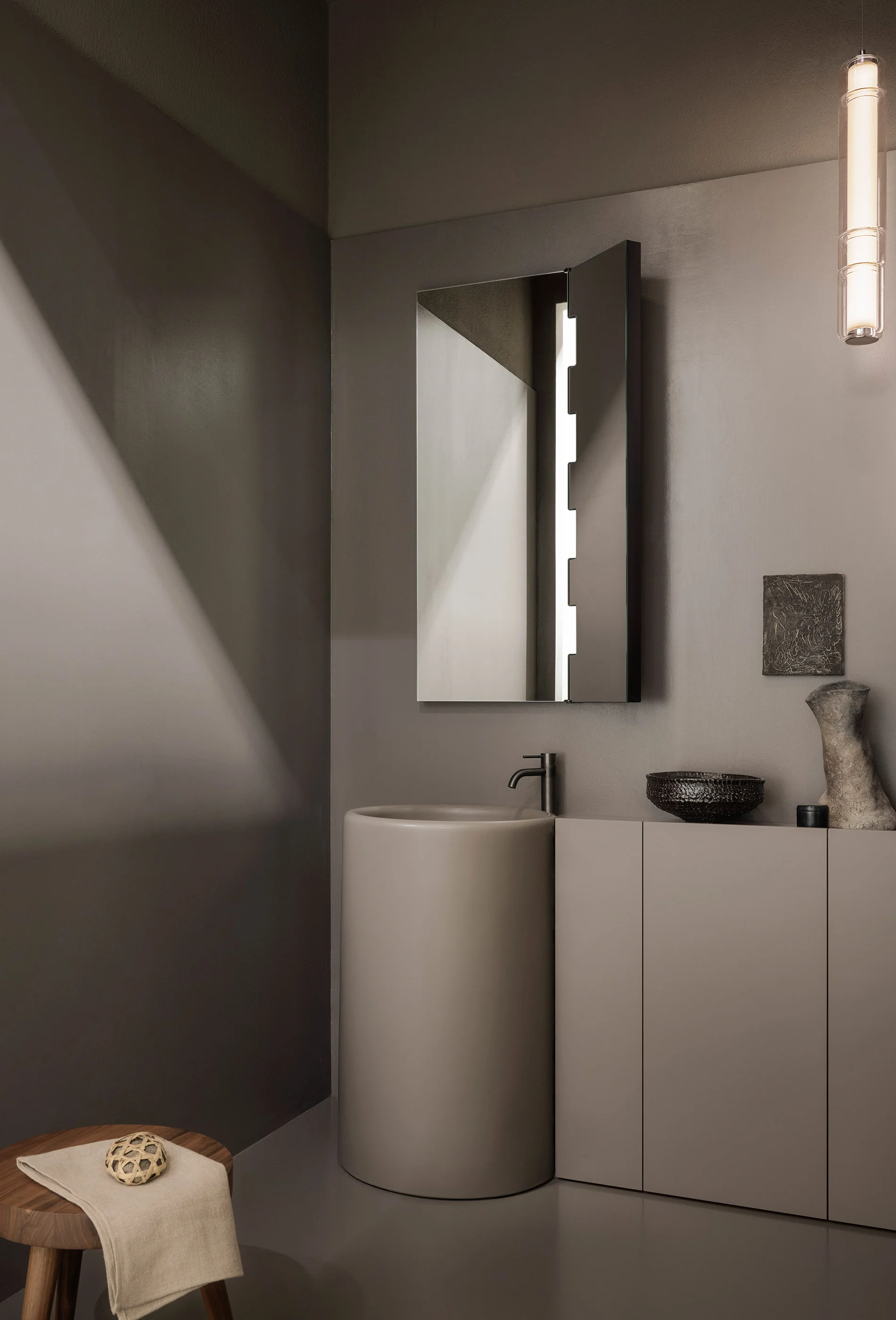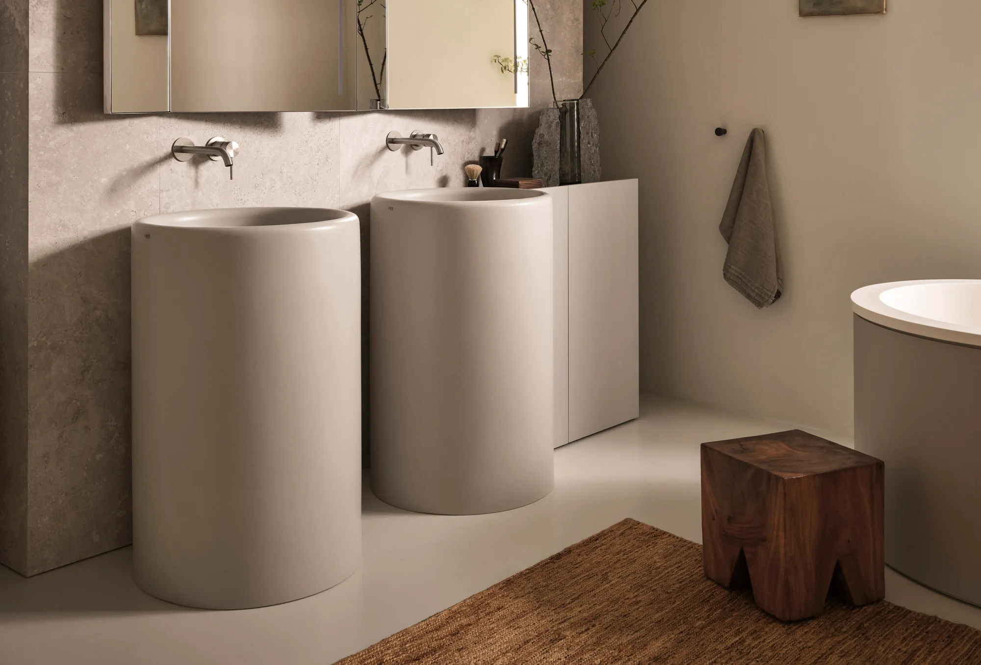 Lavabi e sanitari della collezione sono elementi ceramici dal grande impatto estetico. Monoliti distaccati dalle pareti ma al contempo armoniosamente integrati nell’architettura circostante. Al lavabo freestanding possono essere affiancati mobili contenitori dal design essenziale e funzionale.