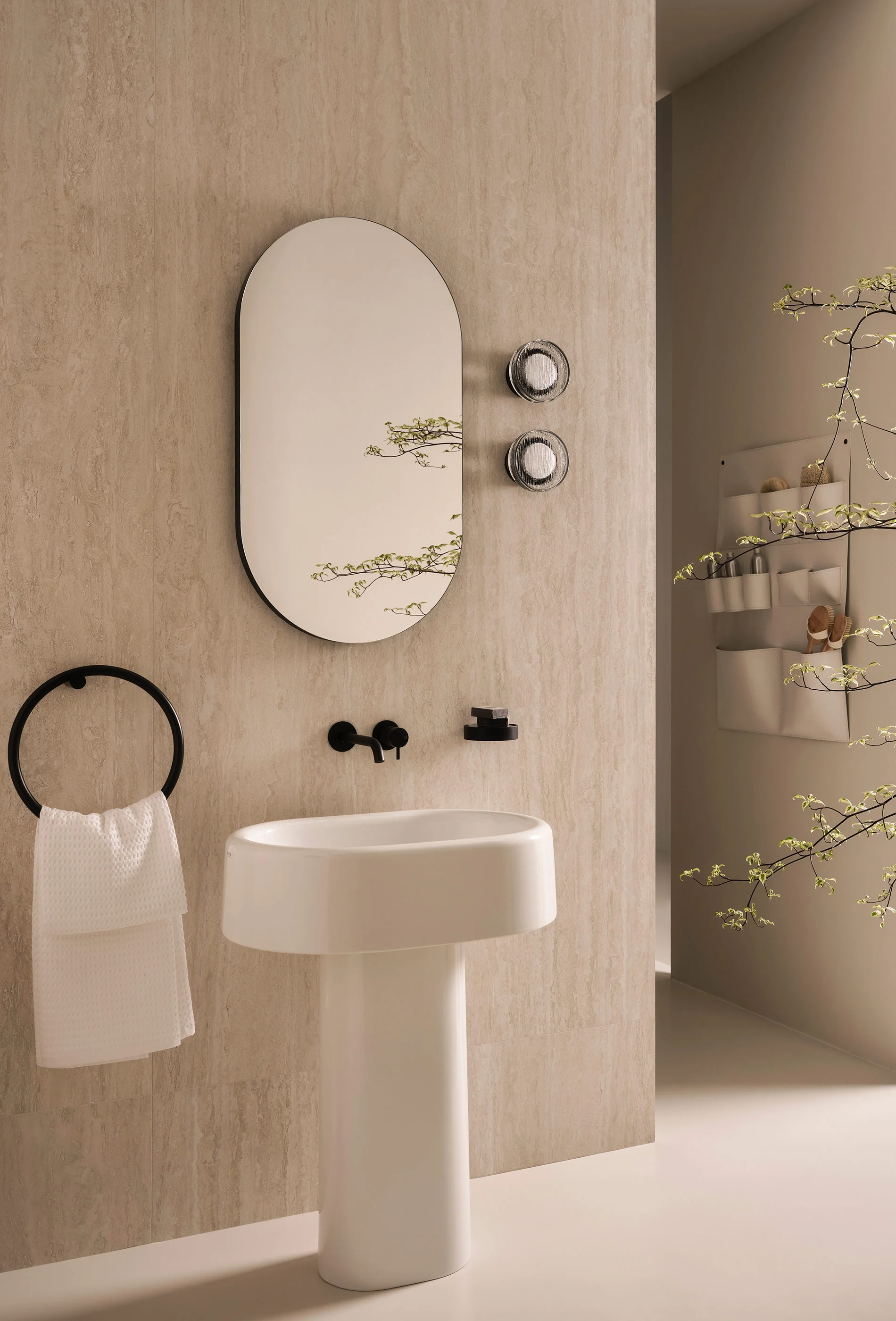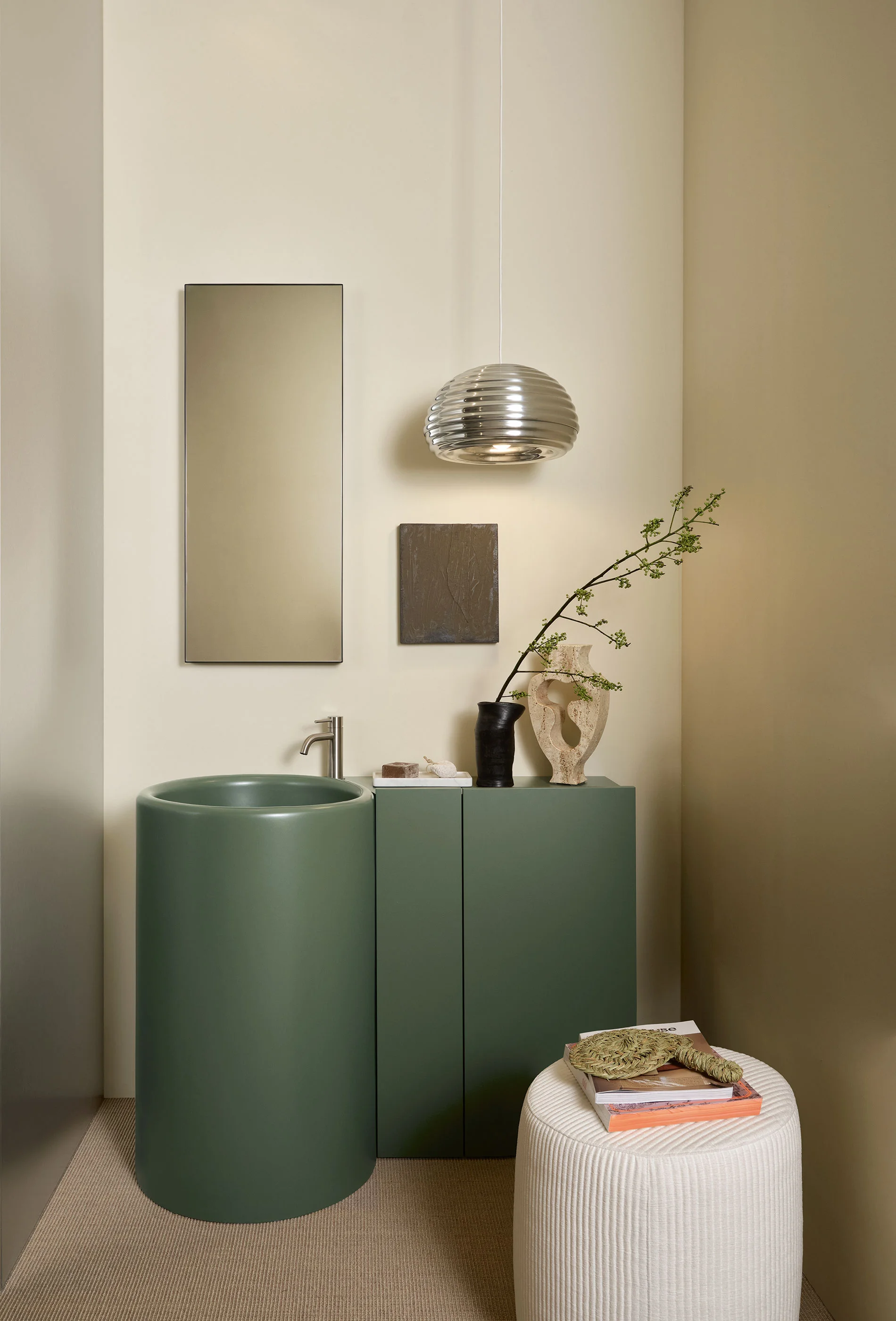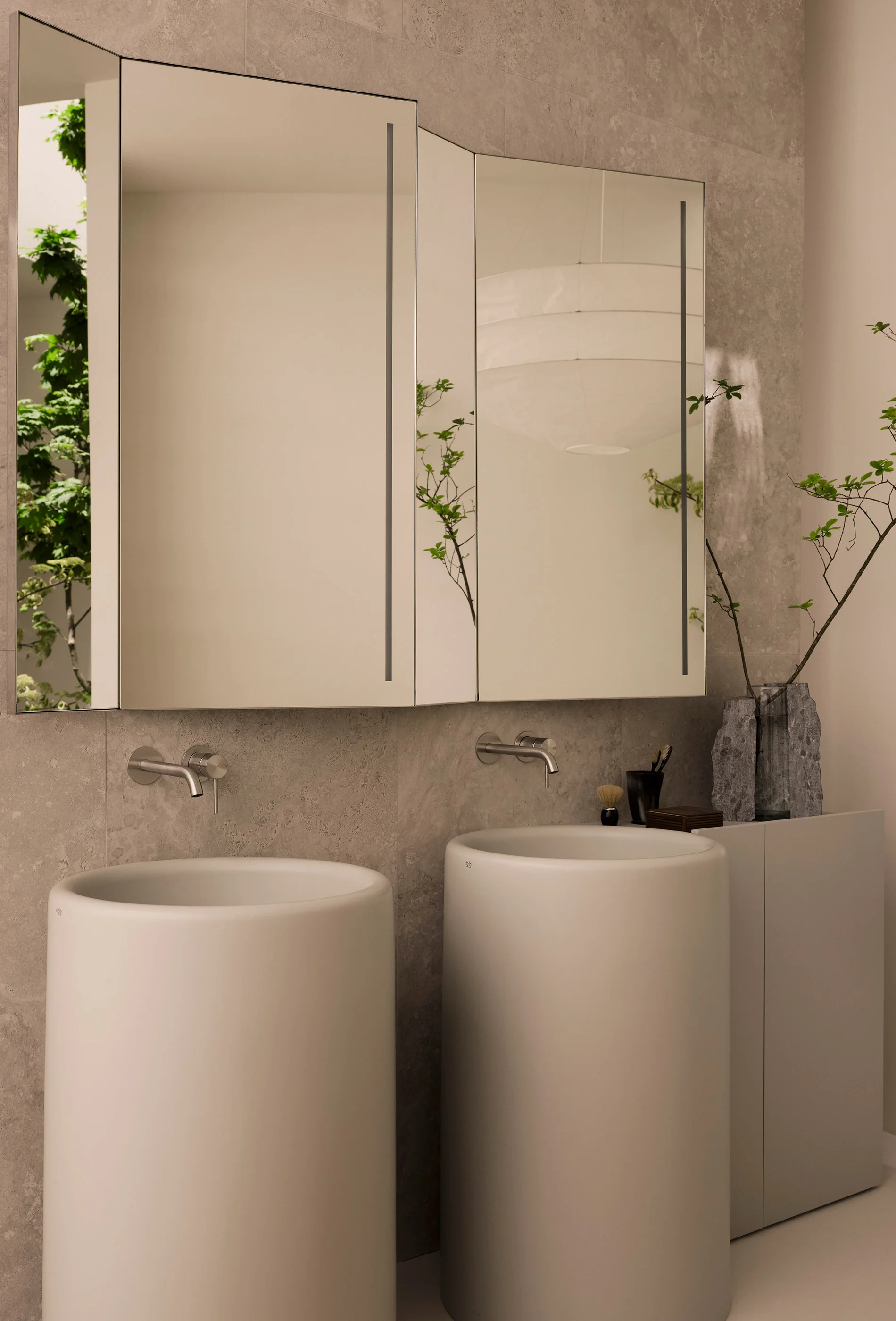 Lavabi e sanitari della collezione sono elementi ceramici dal grande impatto estetico. Monoliti distaccati dalle pareti ma al contempo armoniosamente integrati nell’architettura circostante. Al lavabo freestanding possono essere affiancati mobili contenitori dal design essenziale e funzionale.