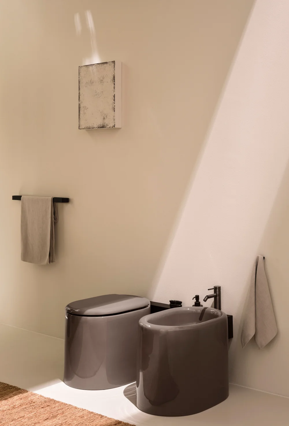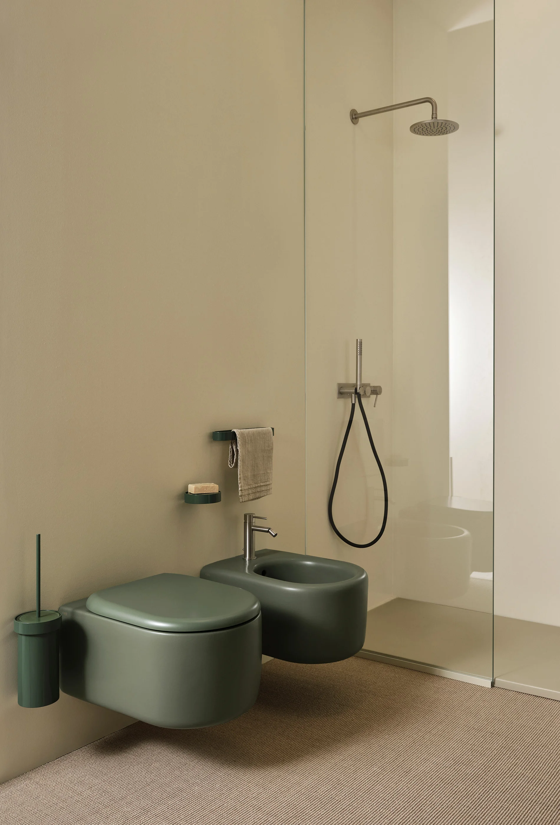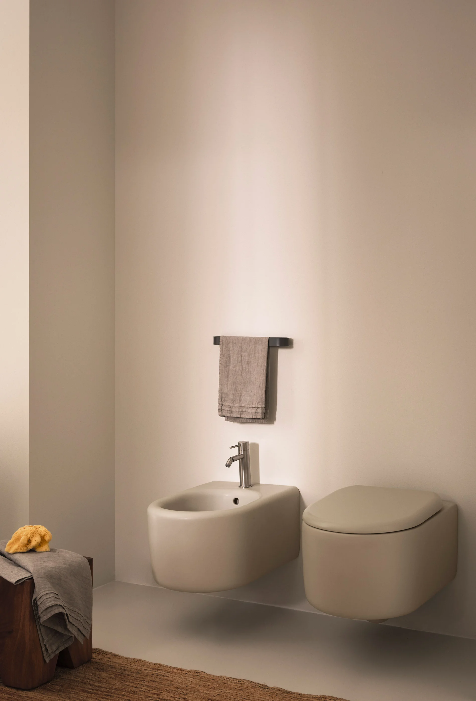 La collezione dalle forme geometriche elementari rese morbide dai bordi arrotondati, si completa con wc e bidet disponibili nelle versioni sospesa e terra. Quest’ultima ha la particolarità di staccarsi totalmente dalle pareti emergendo come forma pura e isolata. Il bidet a terra è unico nel suo genere essendo a tutta vasca, e può essere utilizzato sia con rubinetteria a parete che su piano grazie a delle comode mensole accessorie che possono integrare anche il wc.