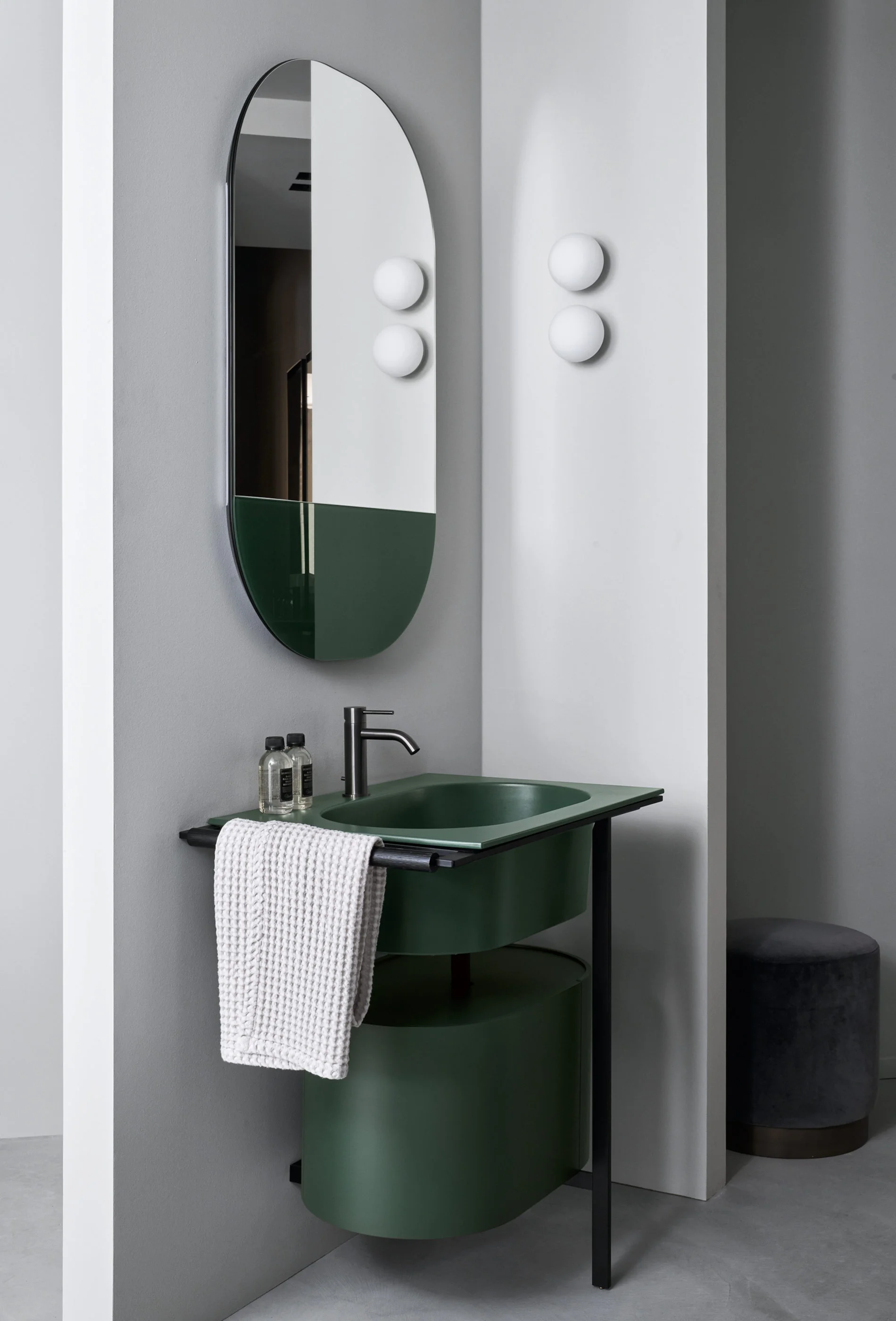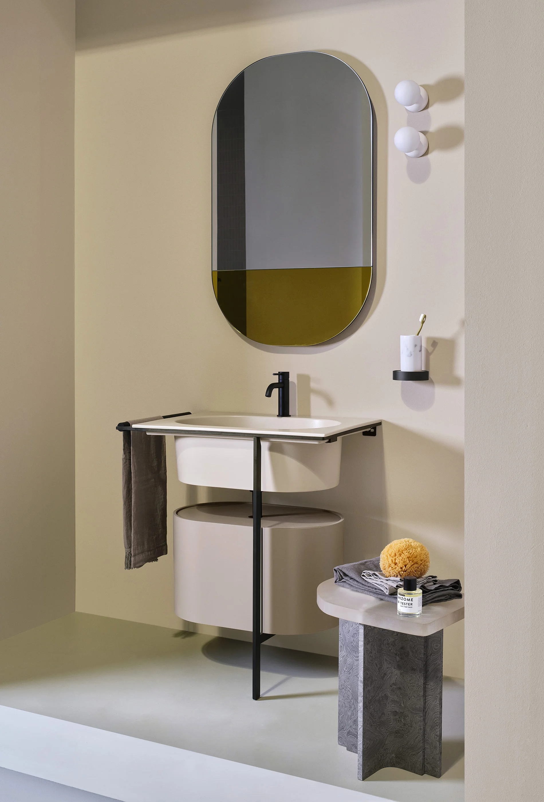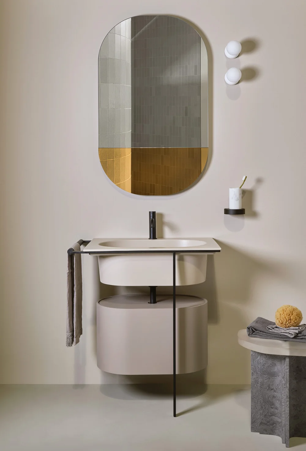 Il mobile Kyros conferisce leggerezza e personalità al bagno, puntando su volumi puri e geometrie decise. Protagonista del progetto è il bacino ovale in ceramica — disponibile in finiture opache o lucide — la cui profondità di 18 cm garantisce la praticità d'uso tipica di una piccola vasca.