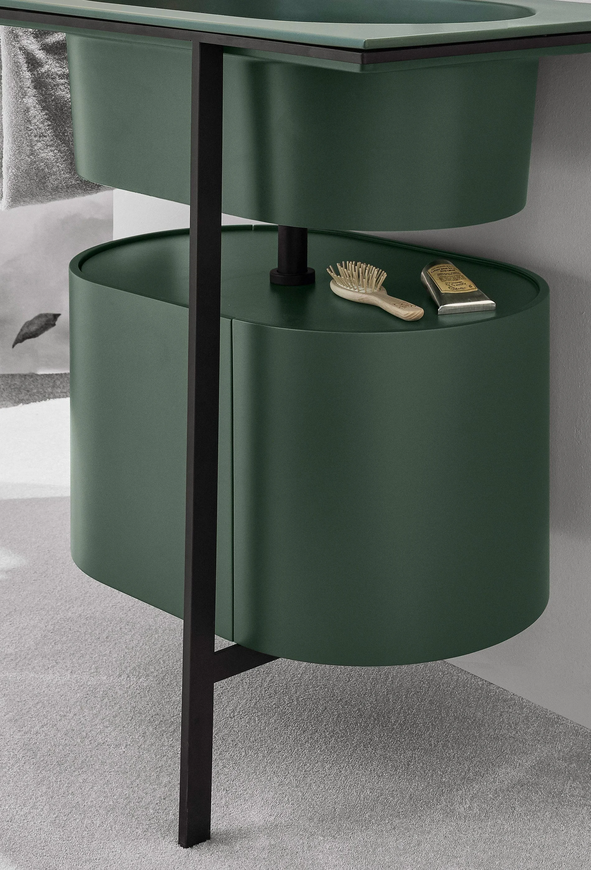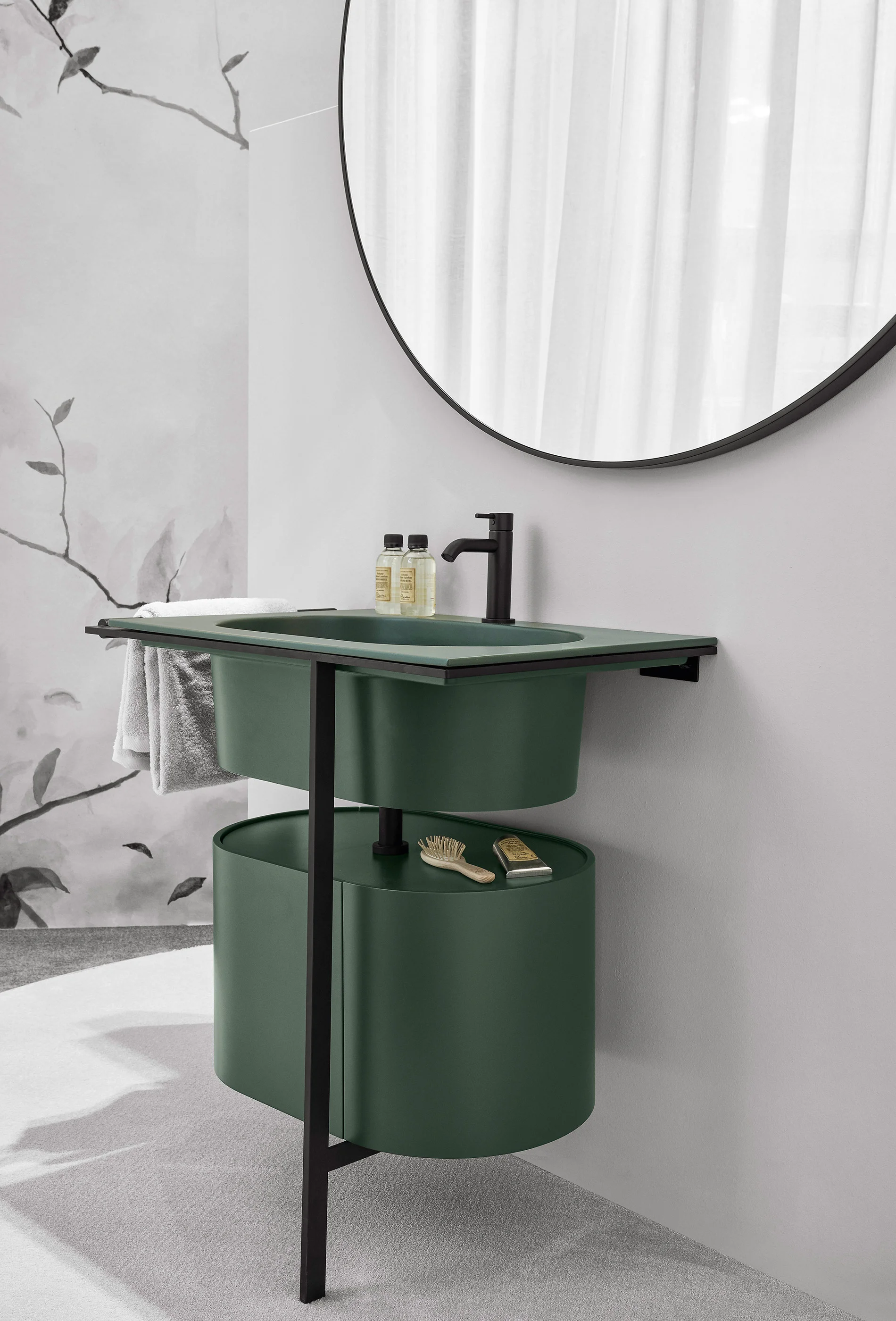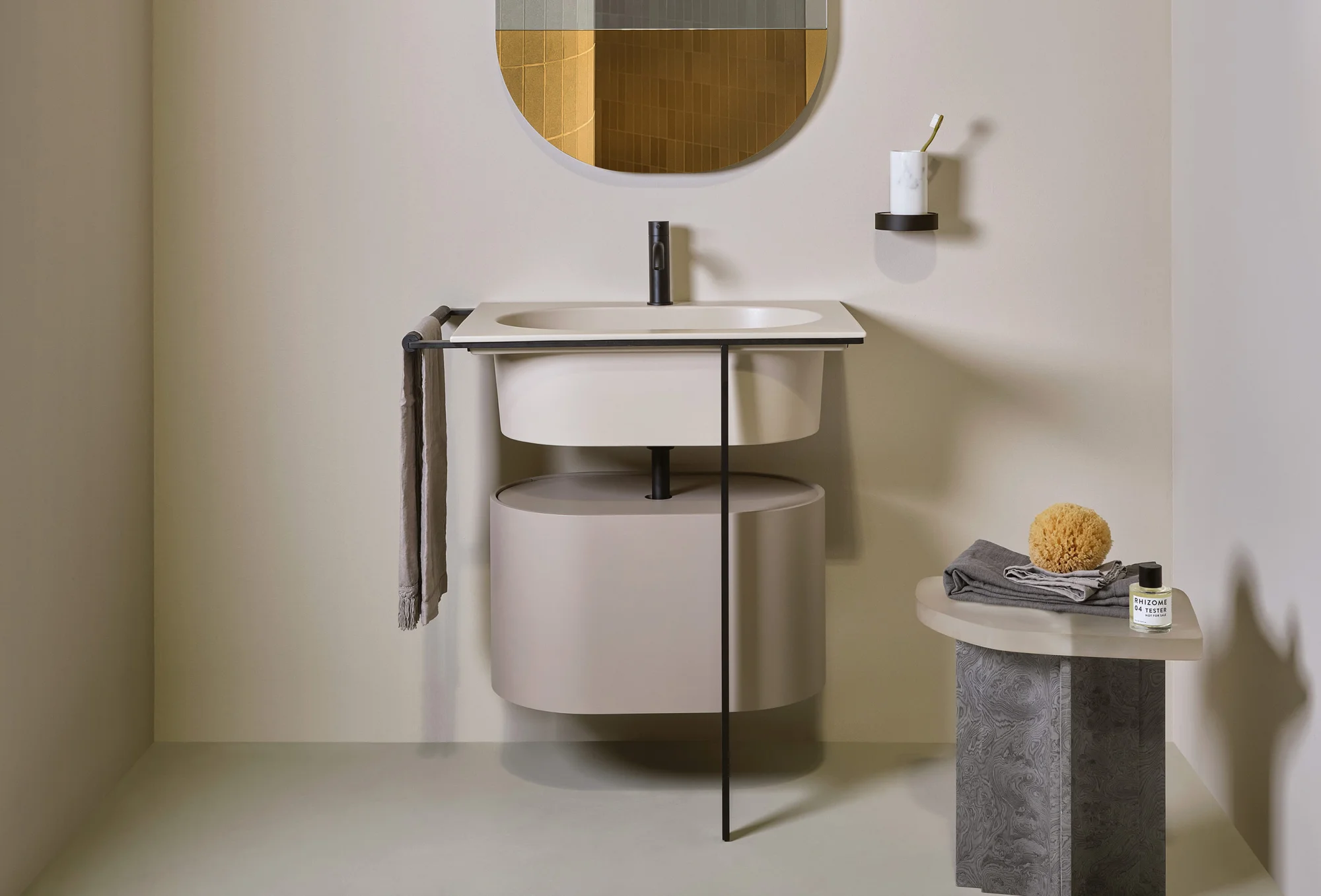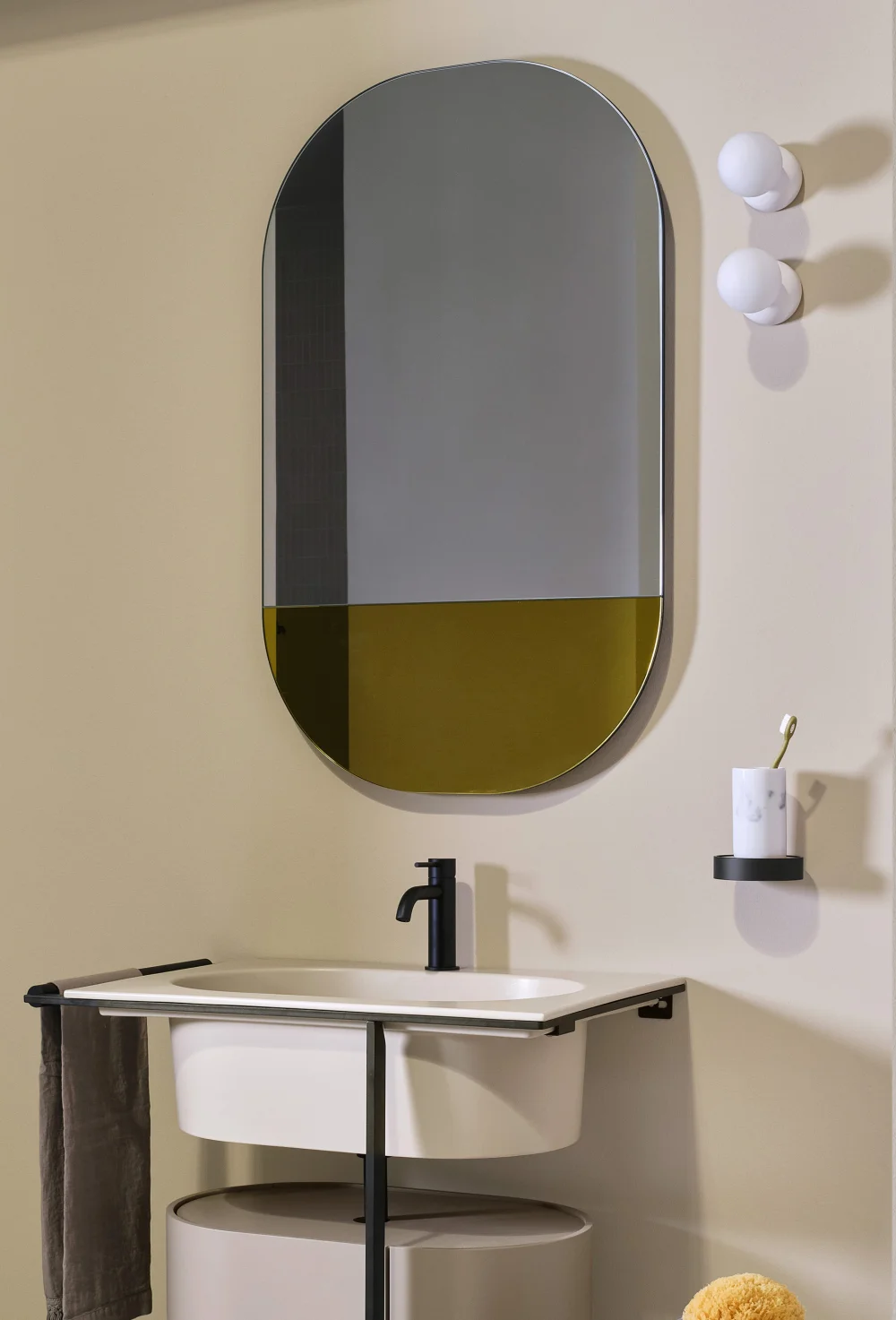 Il mobile Kyros conferisce leggerezza e personalità al bagno, puntando su volumi puri e geometrie decise. Protagonista del progetto è il bacino ovale in ceramica — disponibile in finiture opache o lucide — la cui profondità di 18 cm garantisce la praticità d'uso tipica di una piccola vasca.