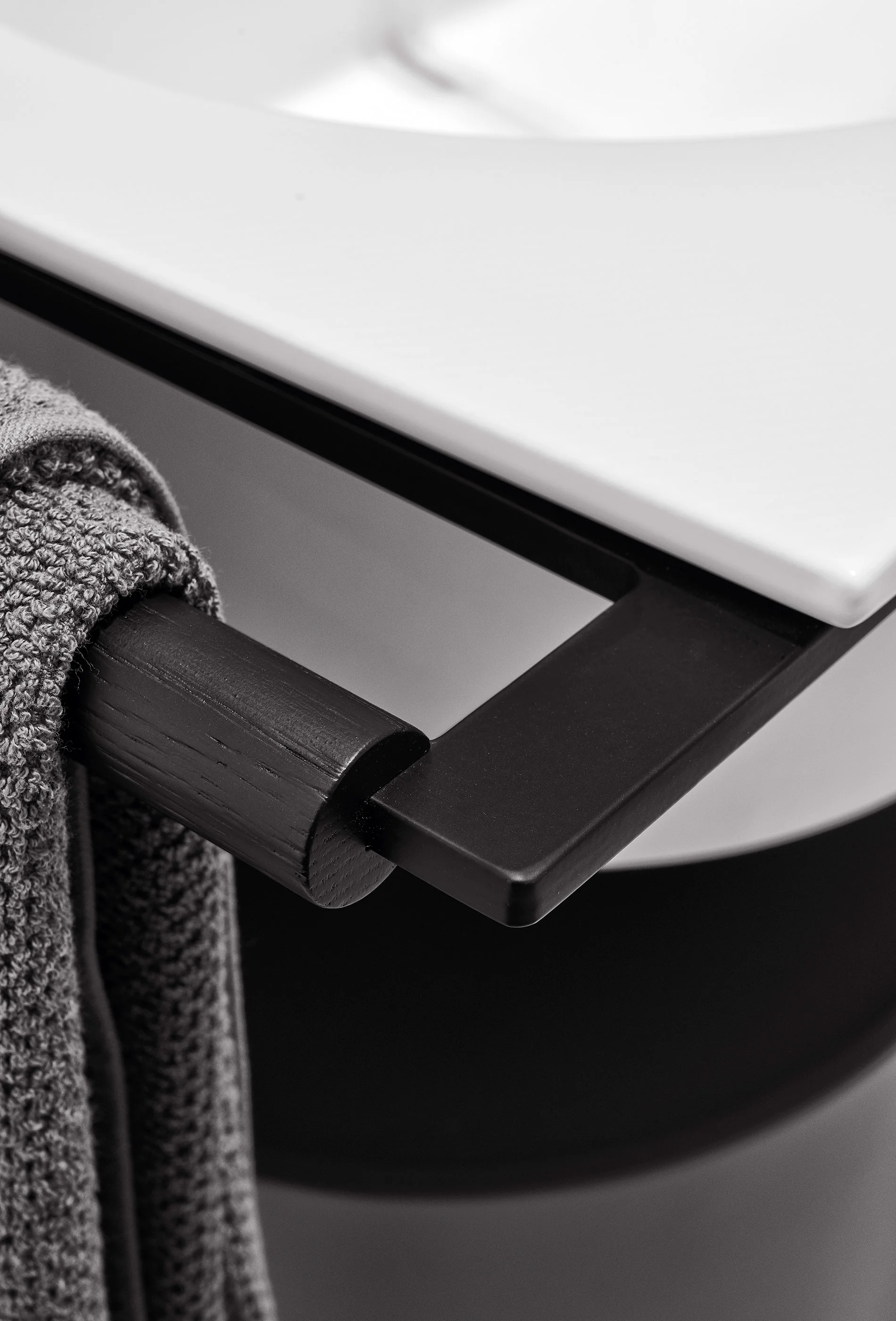 L'armonia formale si estende al contenitore sottostante, personalizzabile con laccature o essenze legno che richiamano cromaticamente il porta asciugamani integrato nella struttura. A sostenere l'insieme, un telaio metallico nelle varianti Nero Matt, Bronzo Spazzolato o Cemento dialoga con i materiali in un gioco di proporzioni impeccabili. Kyros rappresenta una soluzione d'arredo concreta che non rinuncia a un segno estetico forte e riconoscibile.