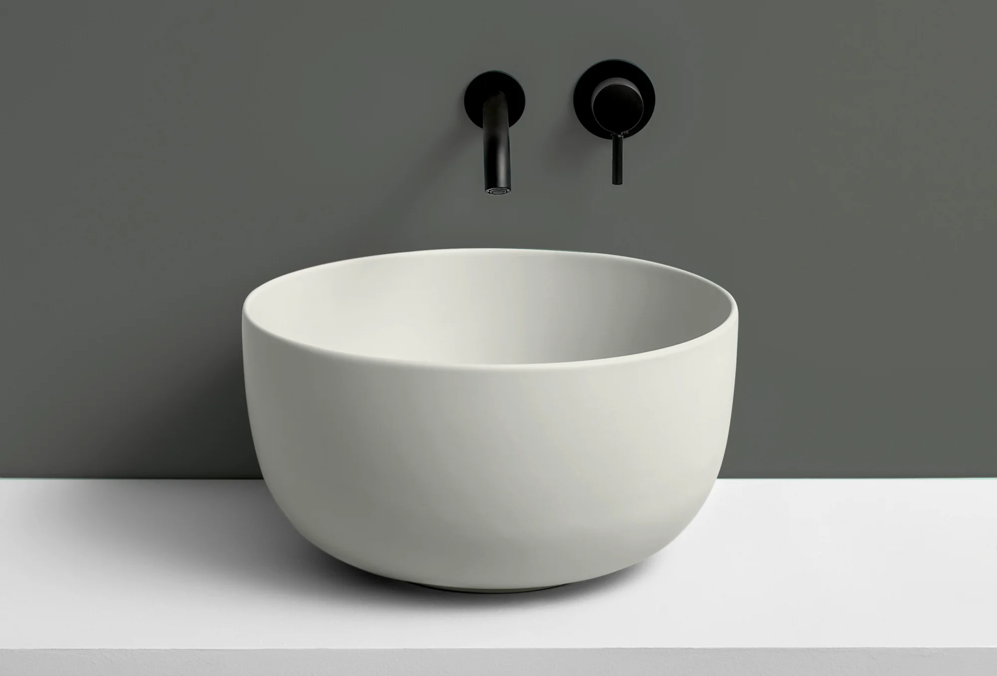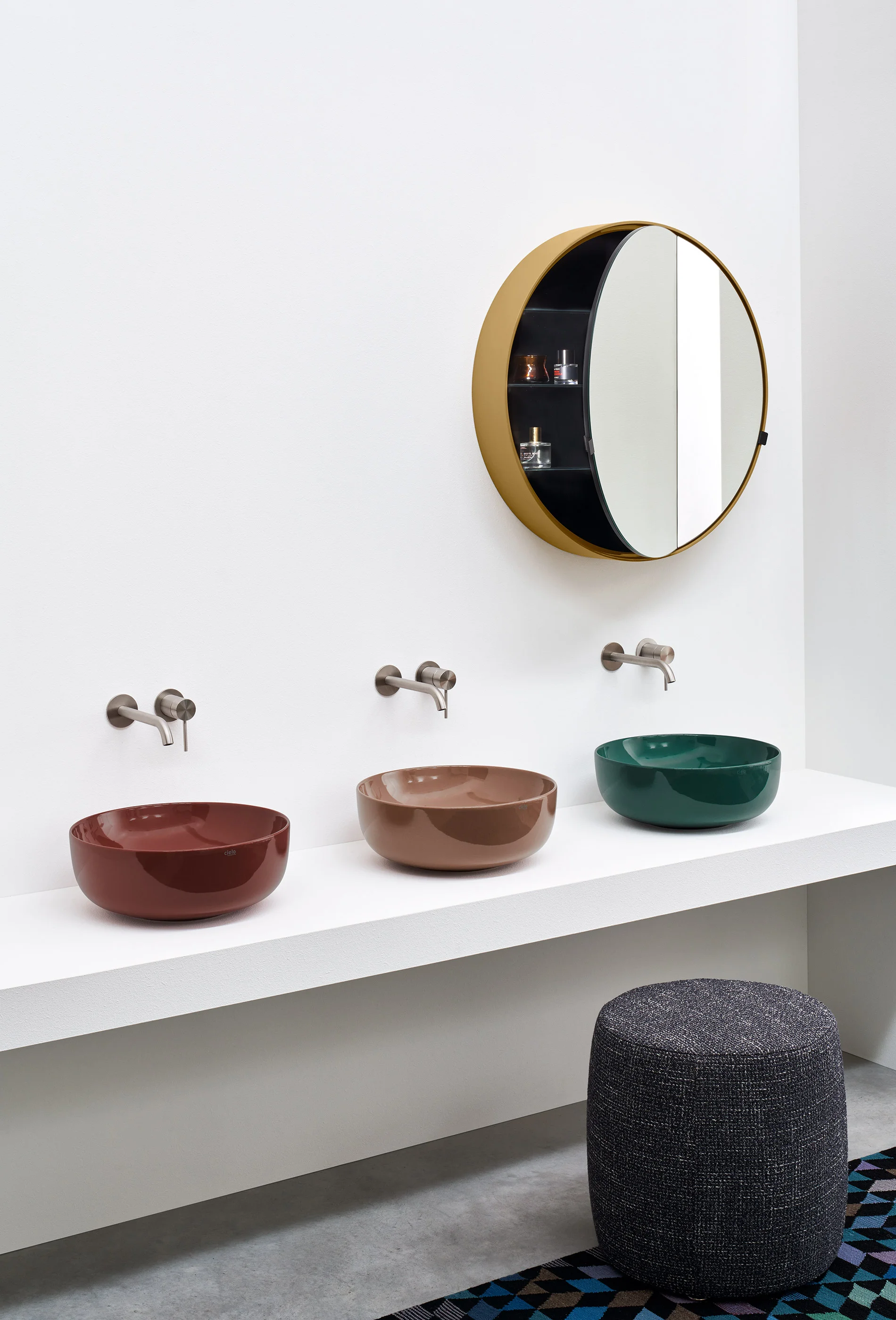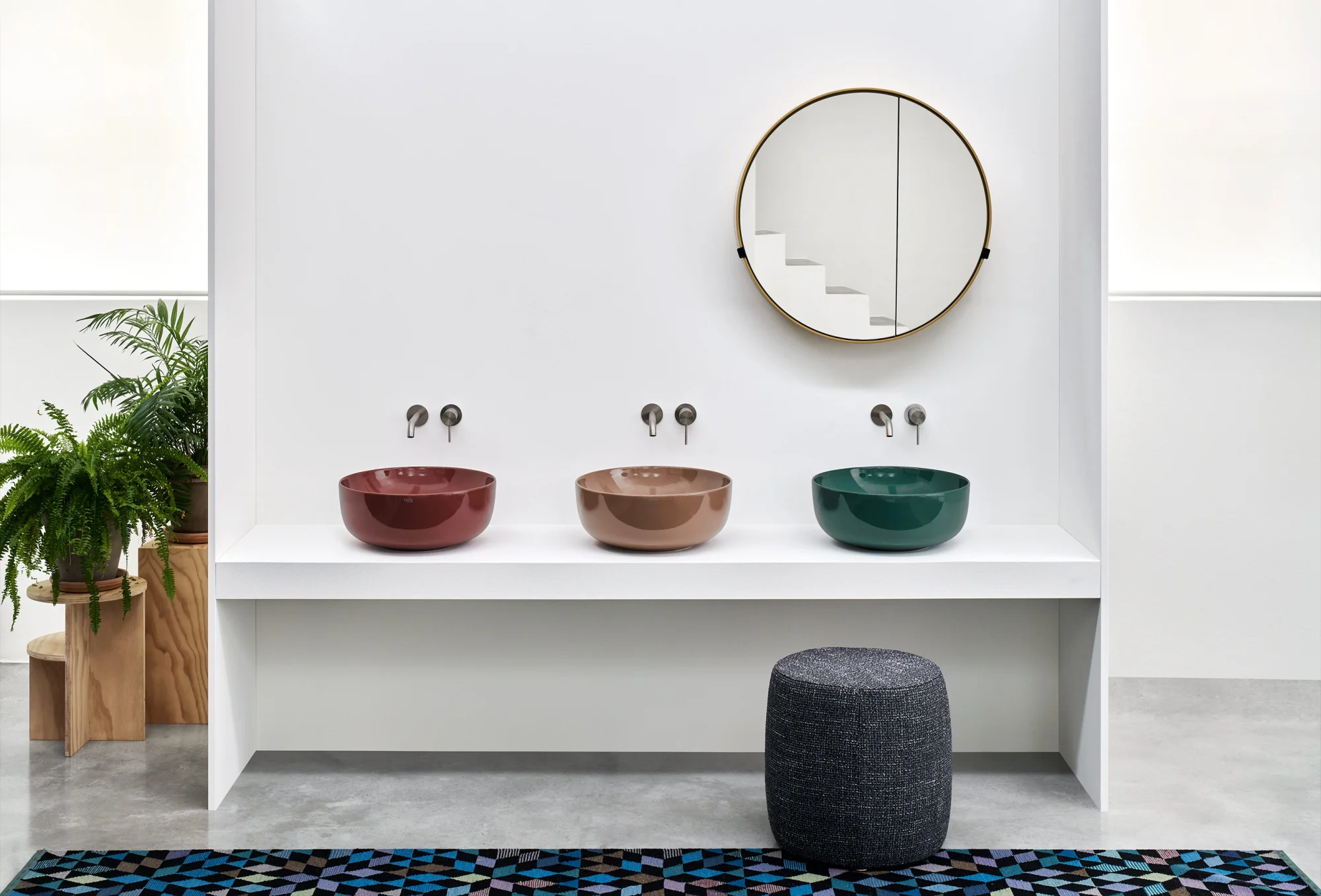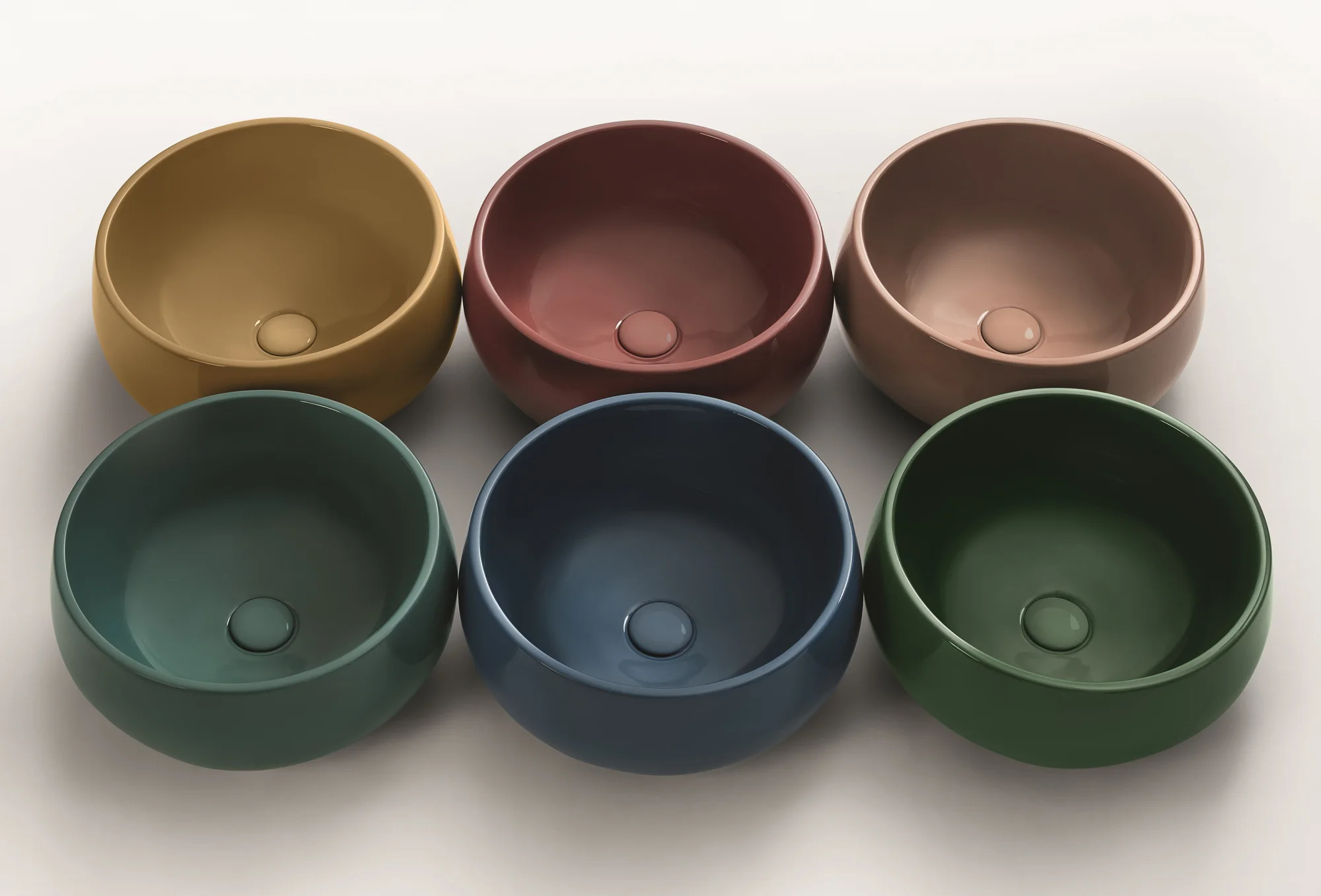 Il design spazia dal cerchio all’ellisse, con linee avvolgenti che esaltano la plasticità della materia ceramica. Il gioco di luci e ombre valorizza le curve generose di questi lavabi, trasformandoli in elementi scultorei per il bagno moderno.