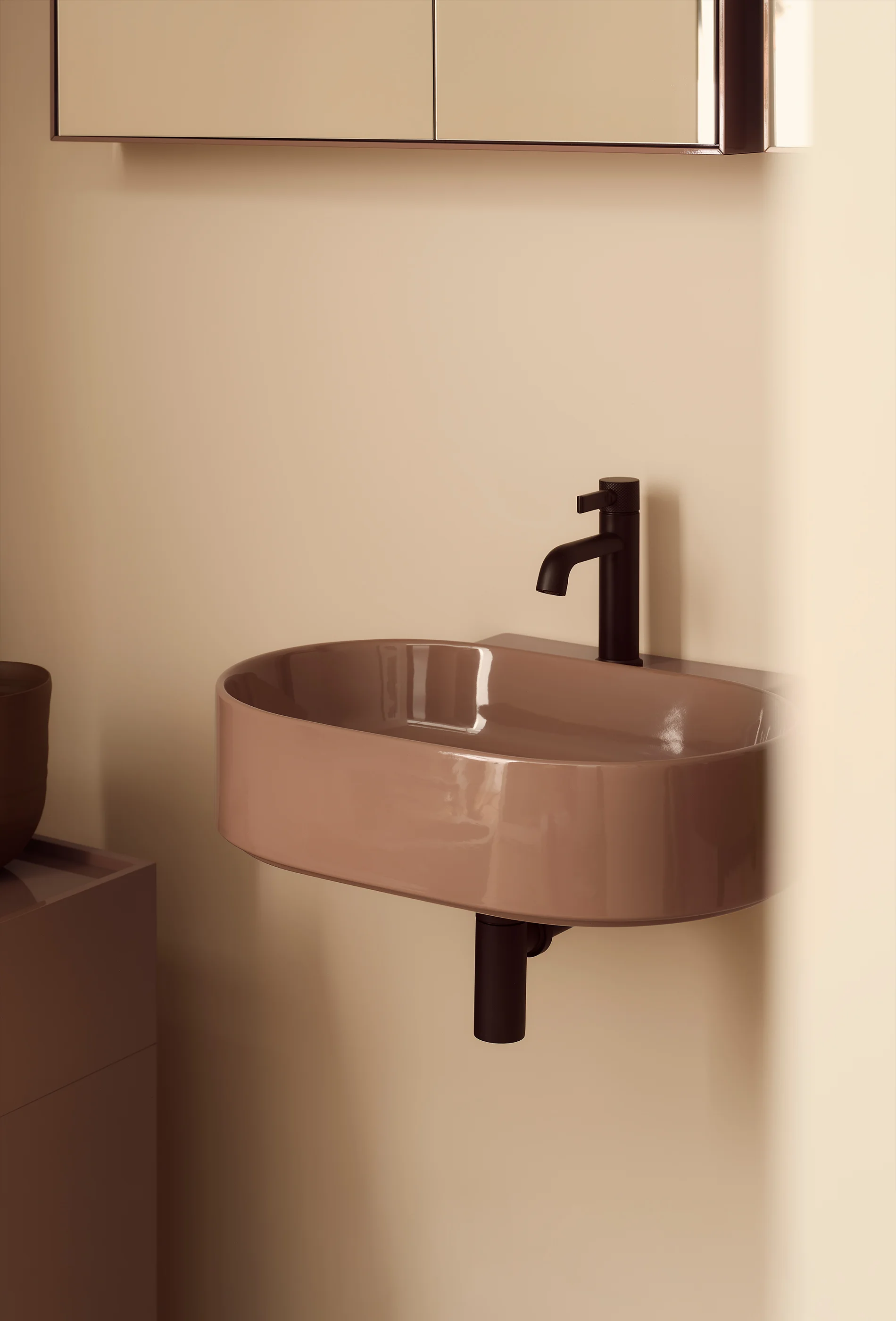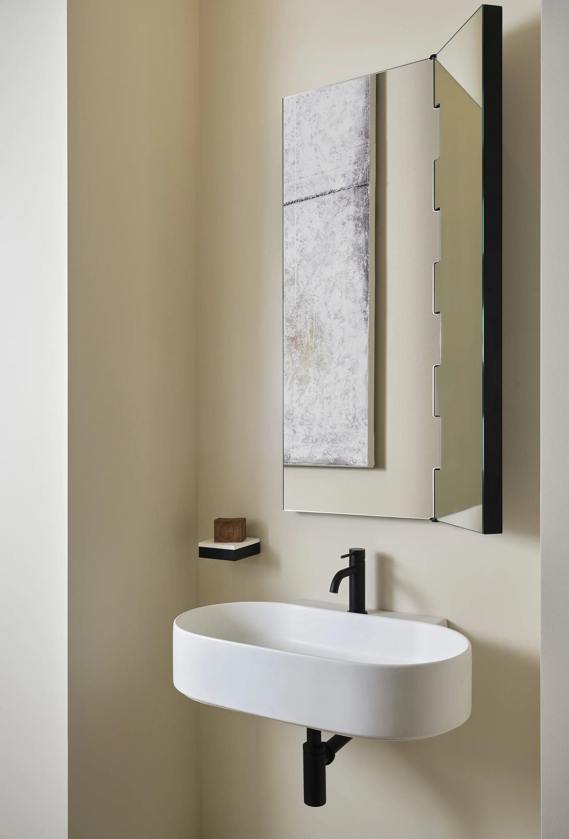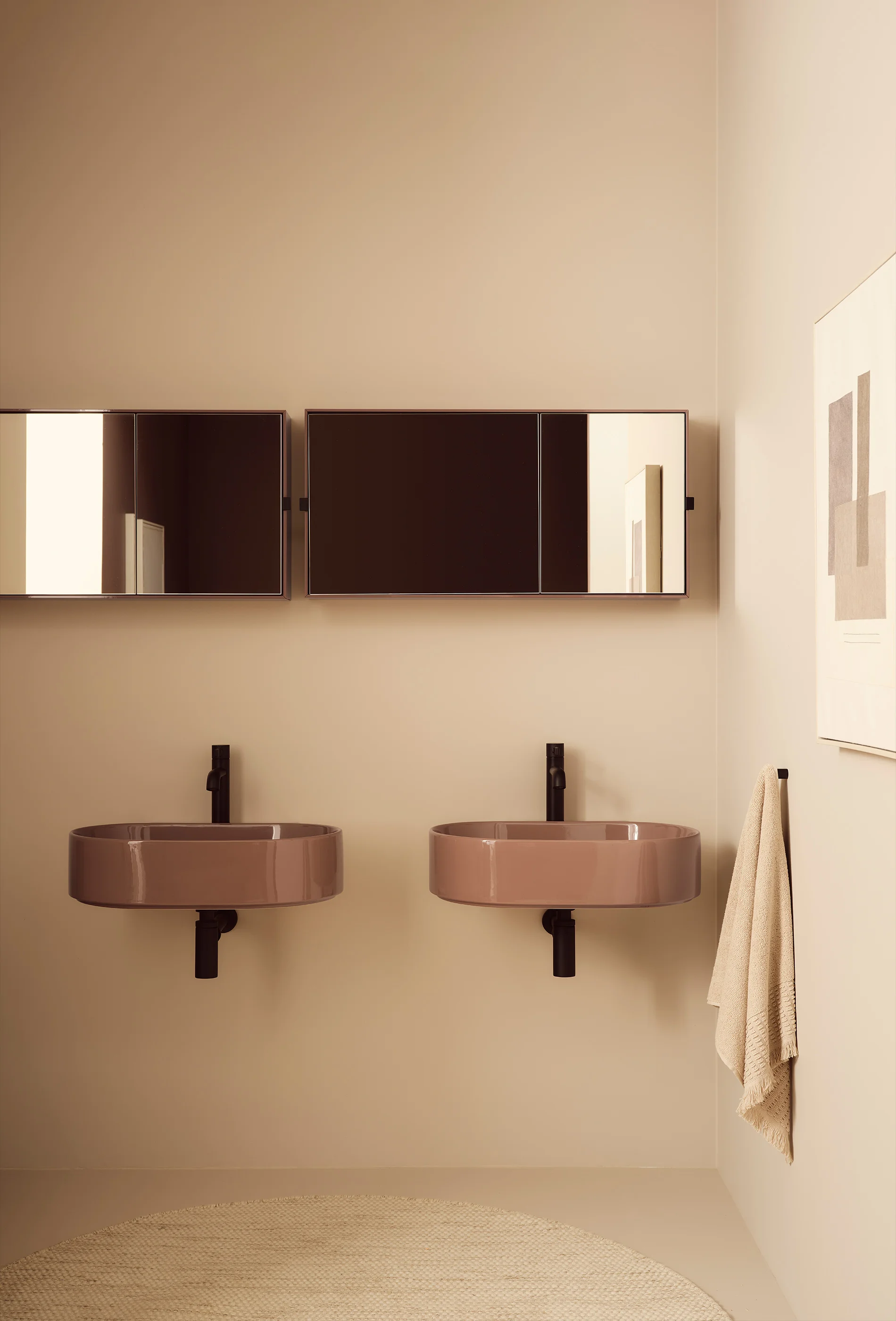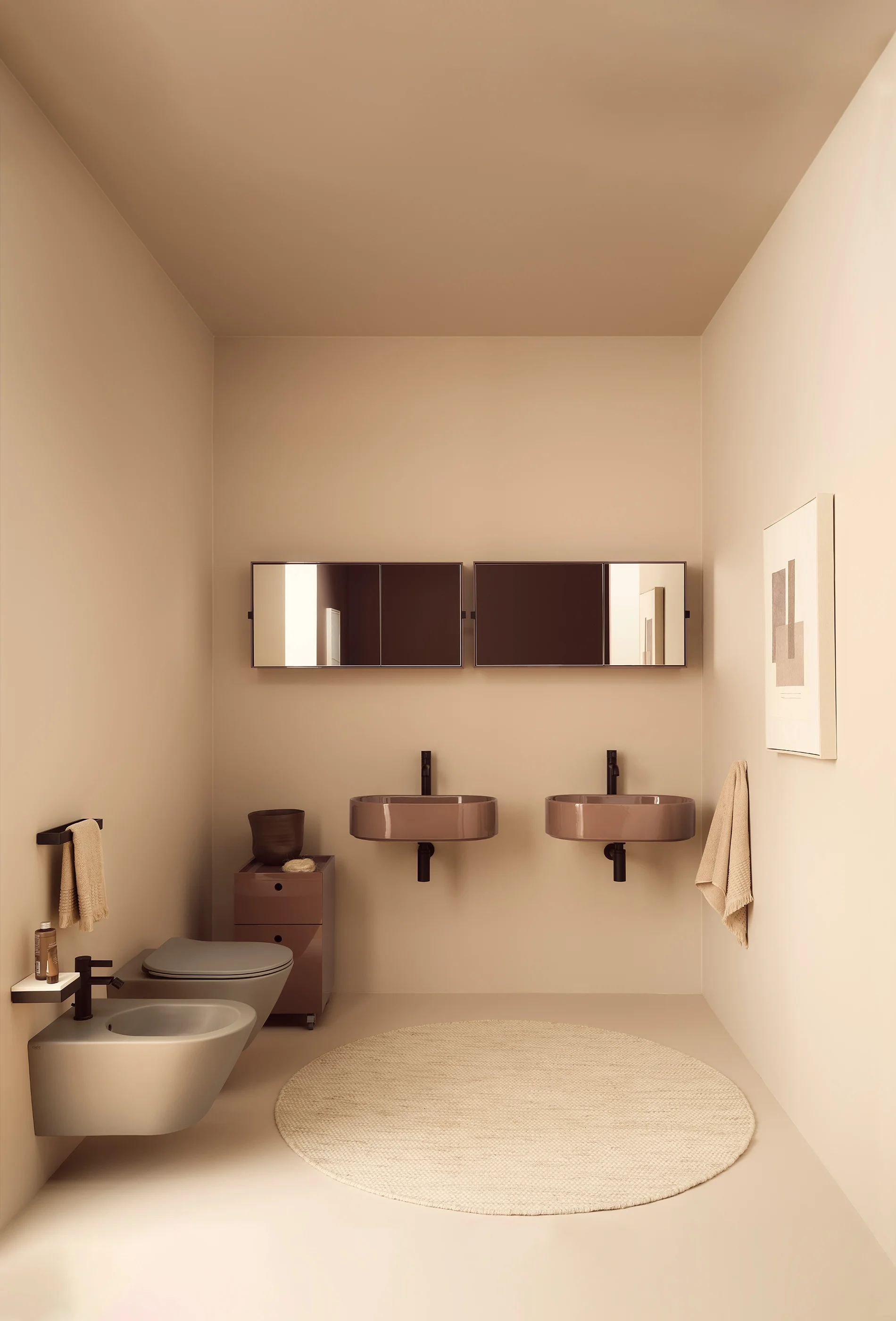 Mare definisce lo spazio attraverso linee pure e volumi essenziali, ricercando un punto d’incontro tra segno grafico e utilità quotidiana. La collezione propone un’ampia libertà compositiva attraverso tre lavabi ovali sospesi e tre bacinelle (tonde, ovali e rettangolari), che interpretano con discrezione il bagno contemporaneo.