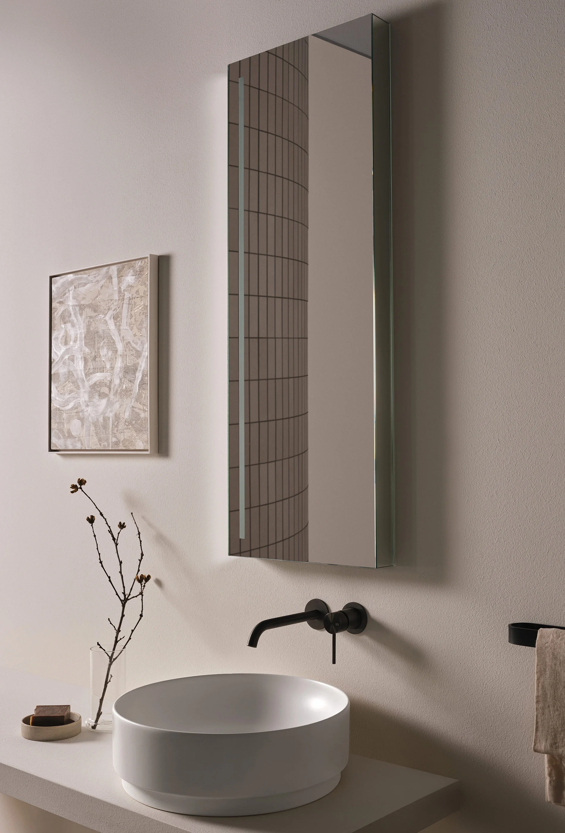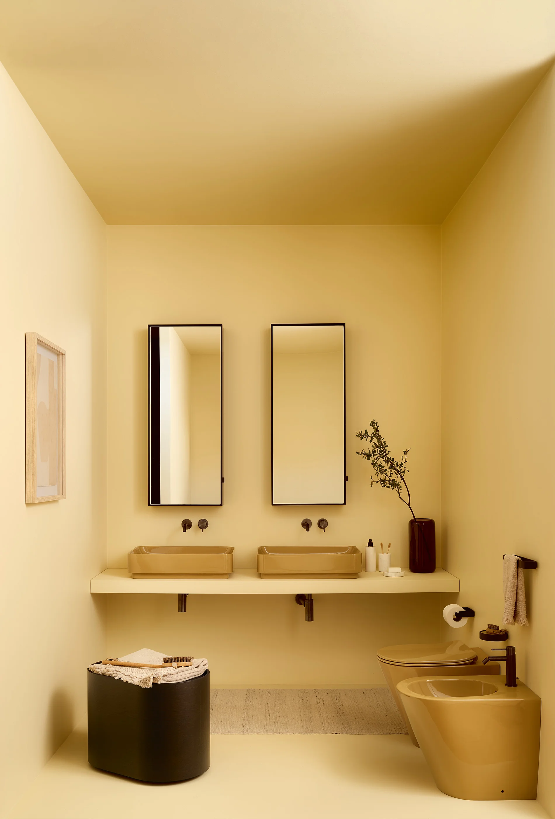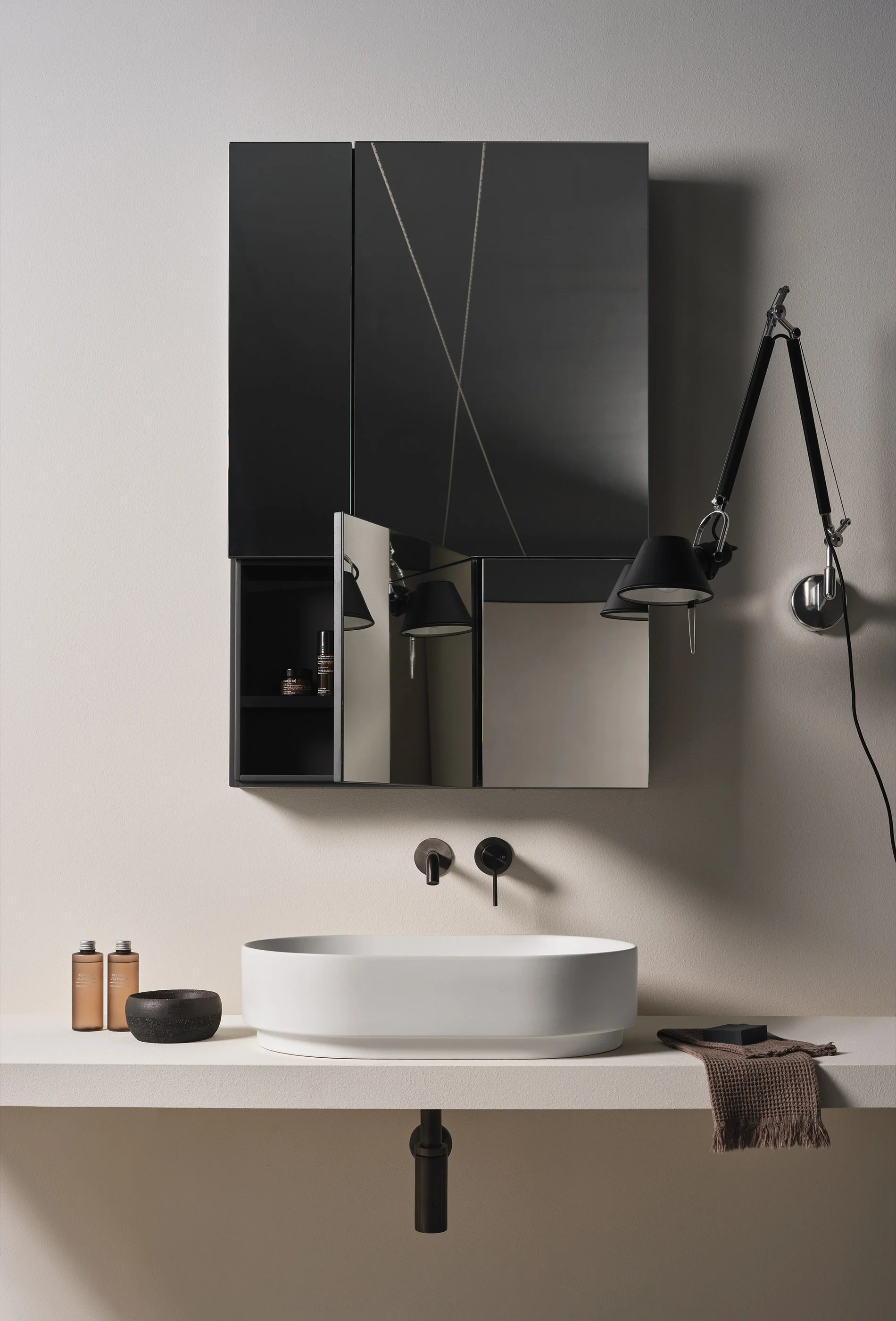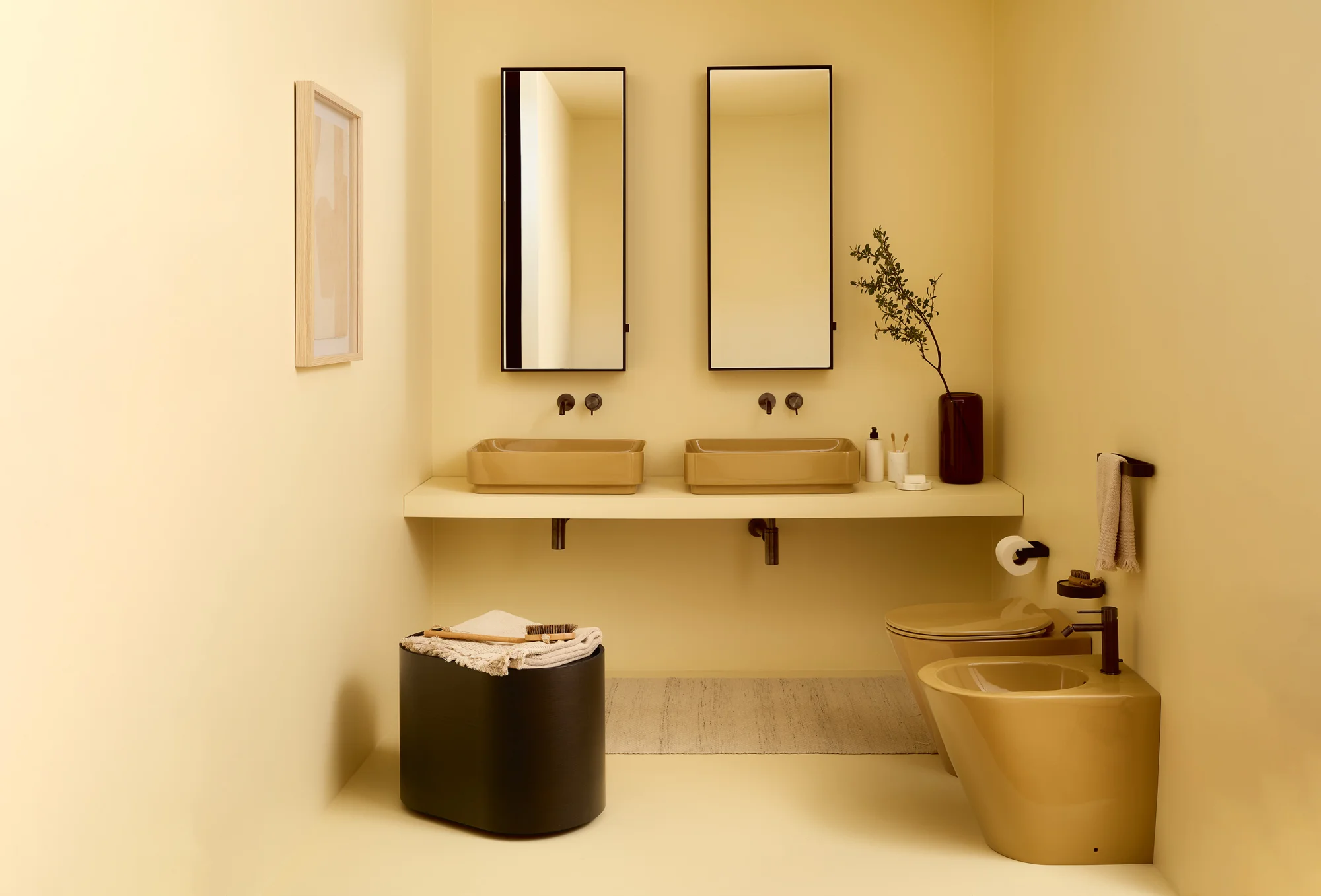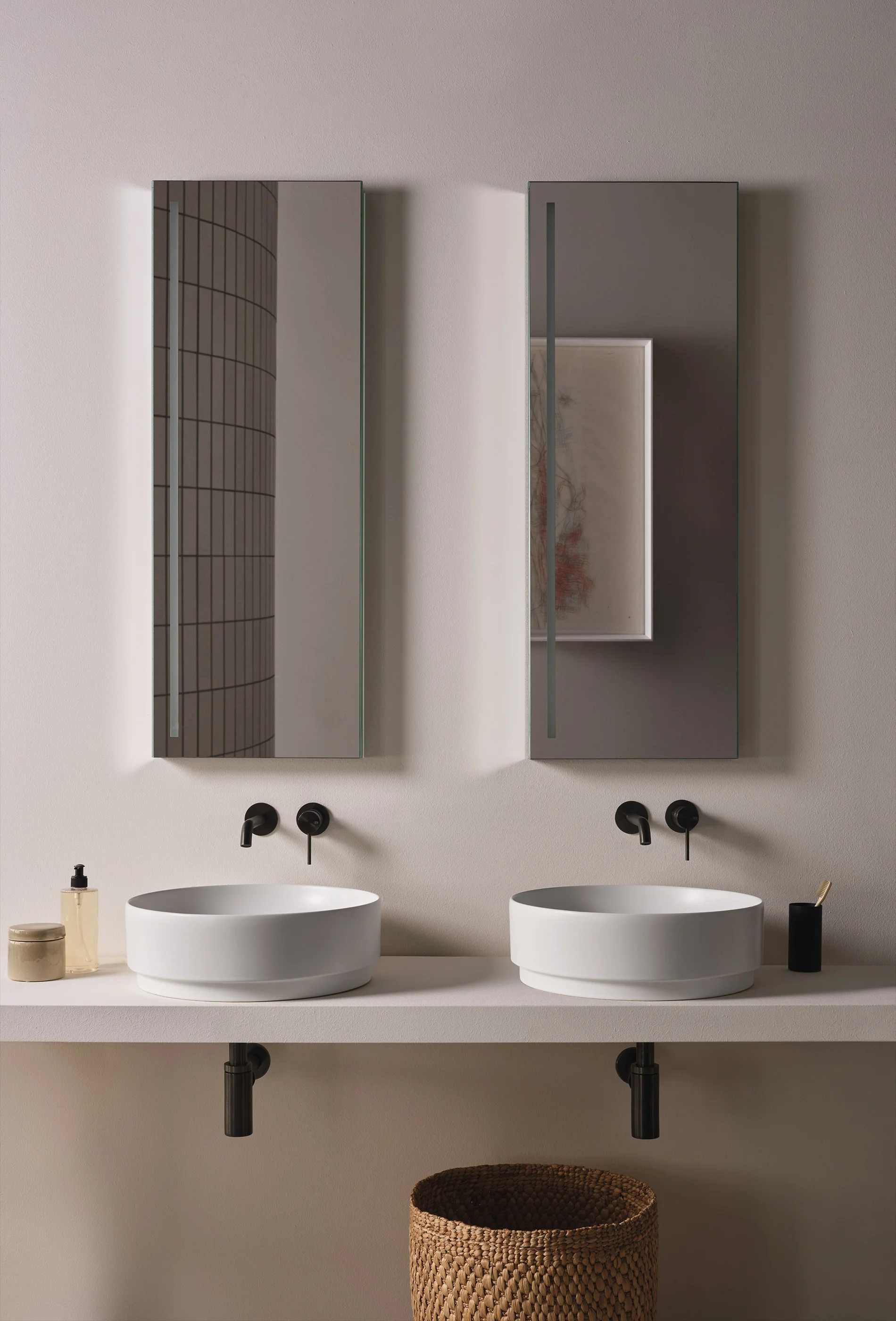 Mare definisce lo spazio attraverso linee pure e volumi essenziali, ricercando un punto d’incontro tra segno grafico e utilità quotidiana. La collezione propone un’ampia libertà compositiva attraverso tre lavabi ovali sospesi e tre bacinelle (tonde, ovali e rettangolari), che interpretano con discrezione il bagno contemporaneo.