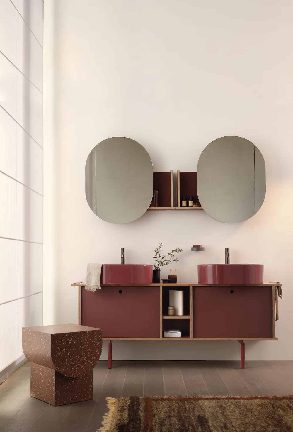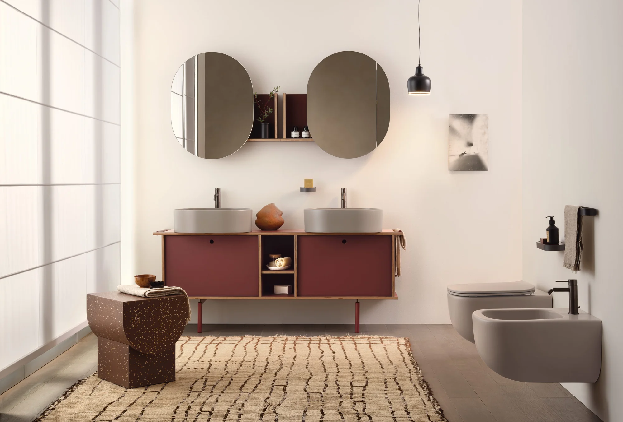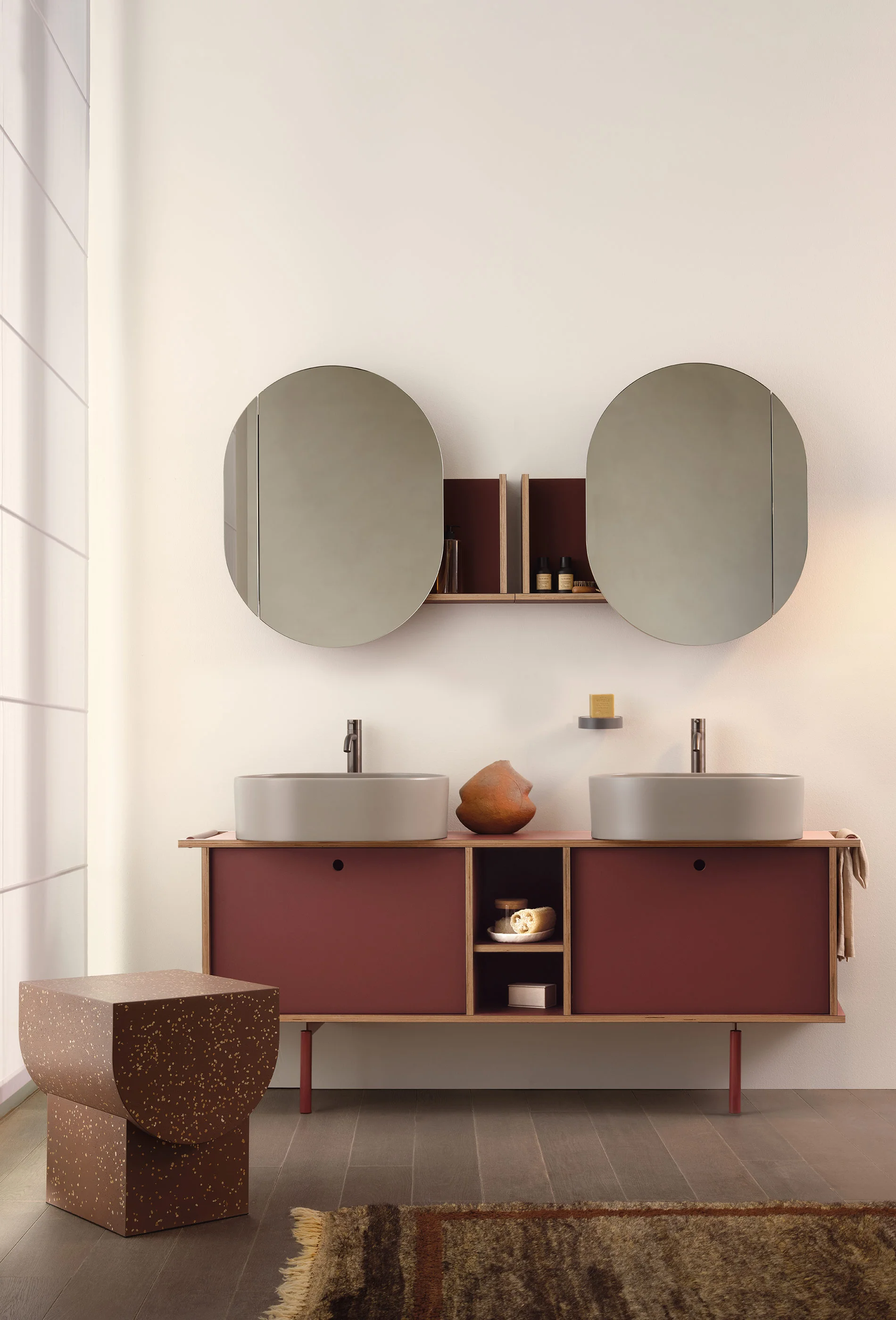 I mobili si declinano in sette modelli — sospesi o con piedini, con ante o cassettoni — e sono personalizzabili in otto diverse tonalità di Fenix per dare vita a configurazioni modulari dinamiche. Completa il progetto lo specchio contenitore Theo, disponibile nelle versioni Ovale, Rettangolare e Circolare, sigillando un sistema che unisce minimalismo cromatico e flessibilità progettuale.
