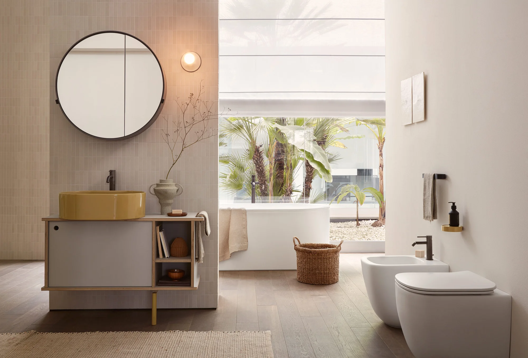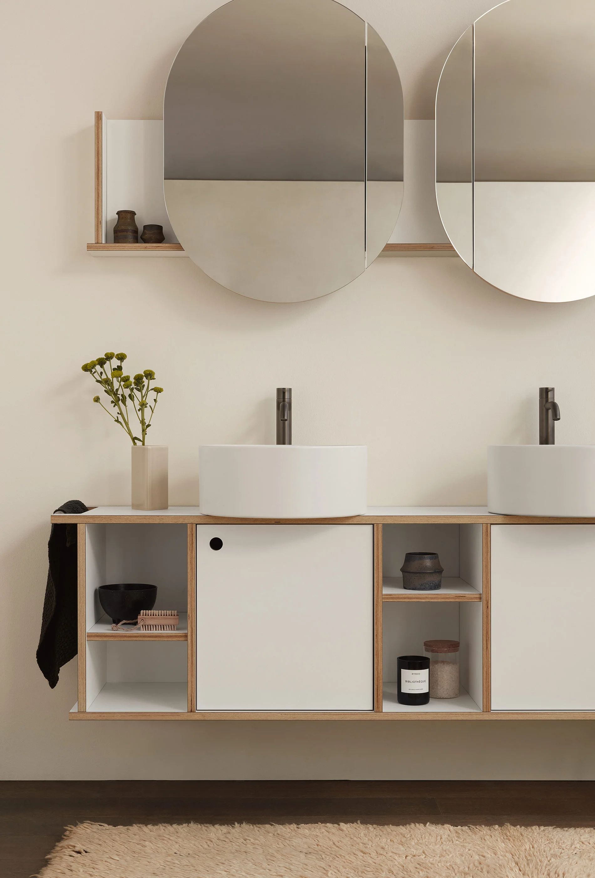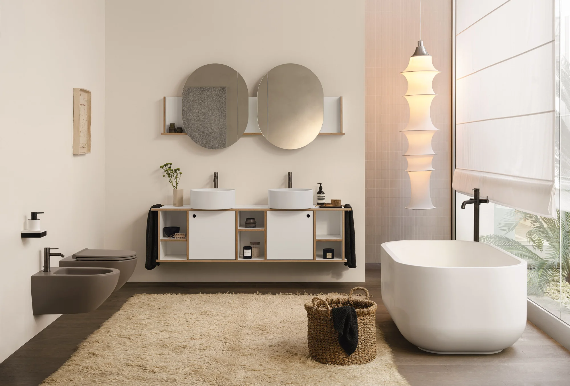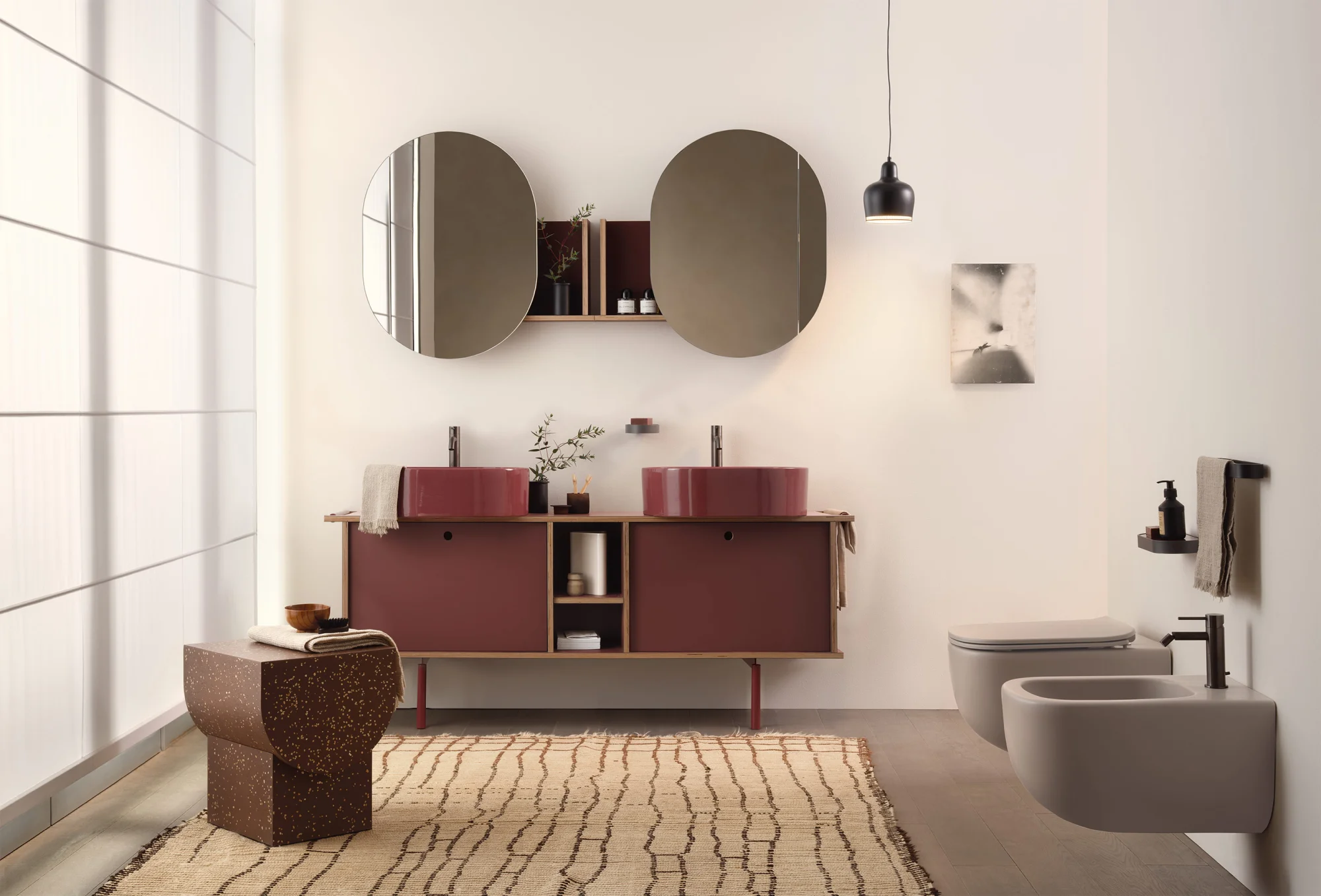 I mobili si declinano in sette modelli — sospesi o con piedini, con ante o cassettoni — e sono personalizzabili in otto diverse tonalità di Fenix per dare vita a configurazioni modulari dinamiche. Completa il progetto lo specchio contenitore Theo, disponibile nelle versioni Ovale, Rettangolare e Circolare, sigillando un sistema che unisce minimalismo cromatico e flessibilità progettuale.