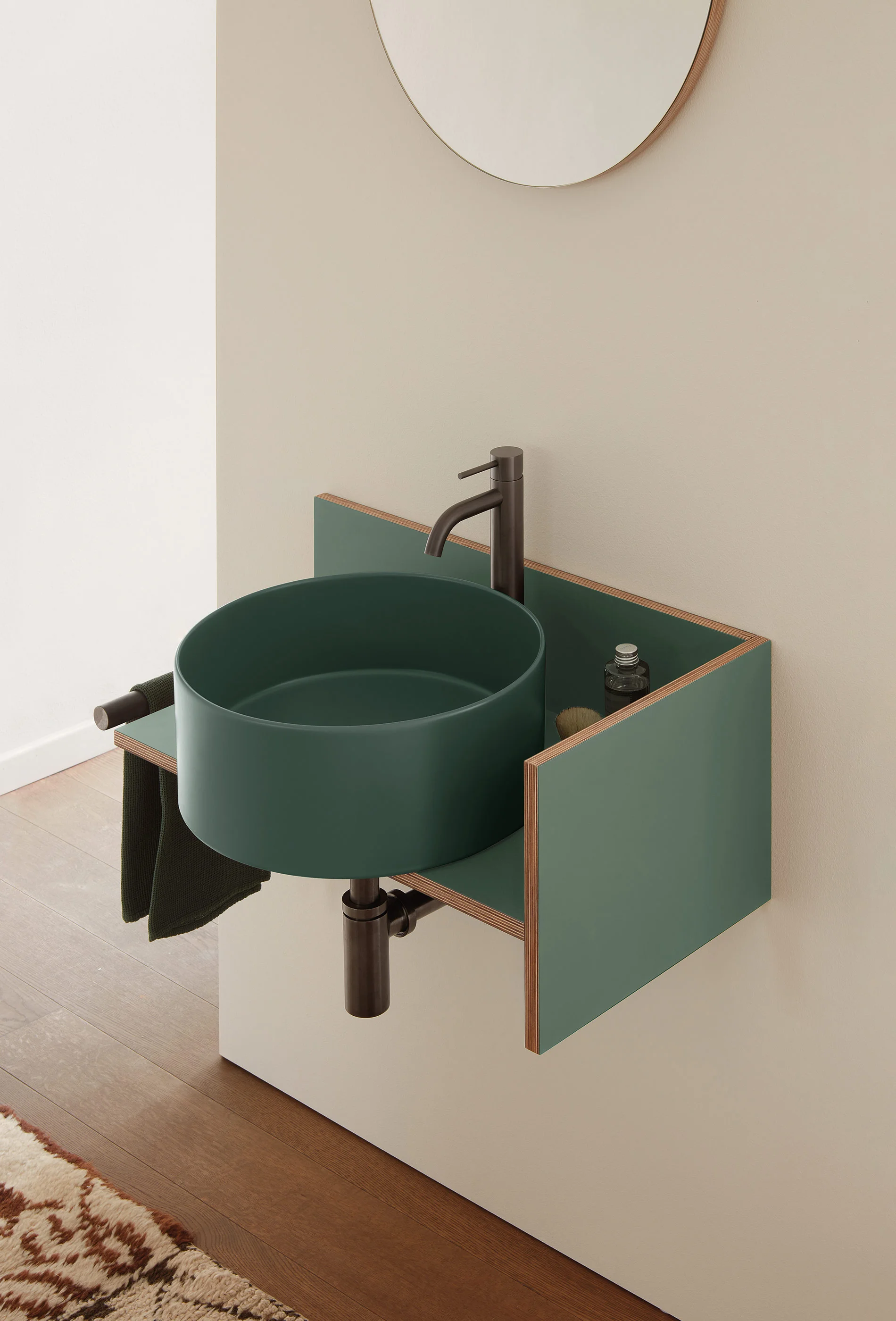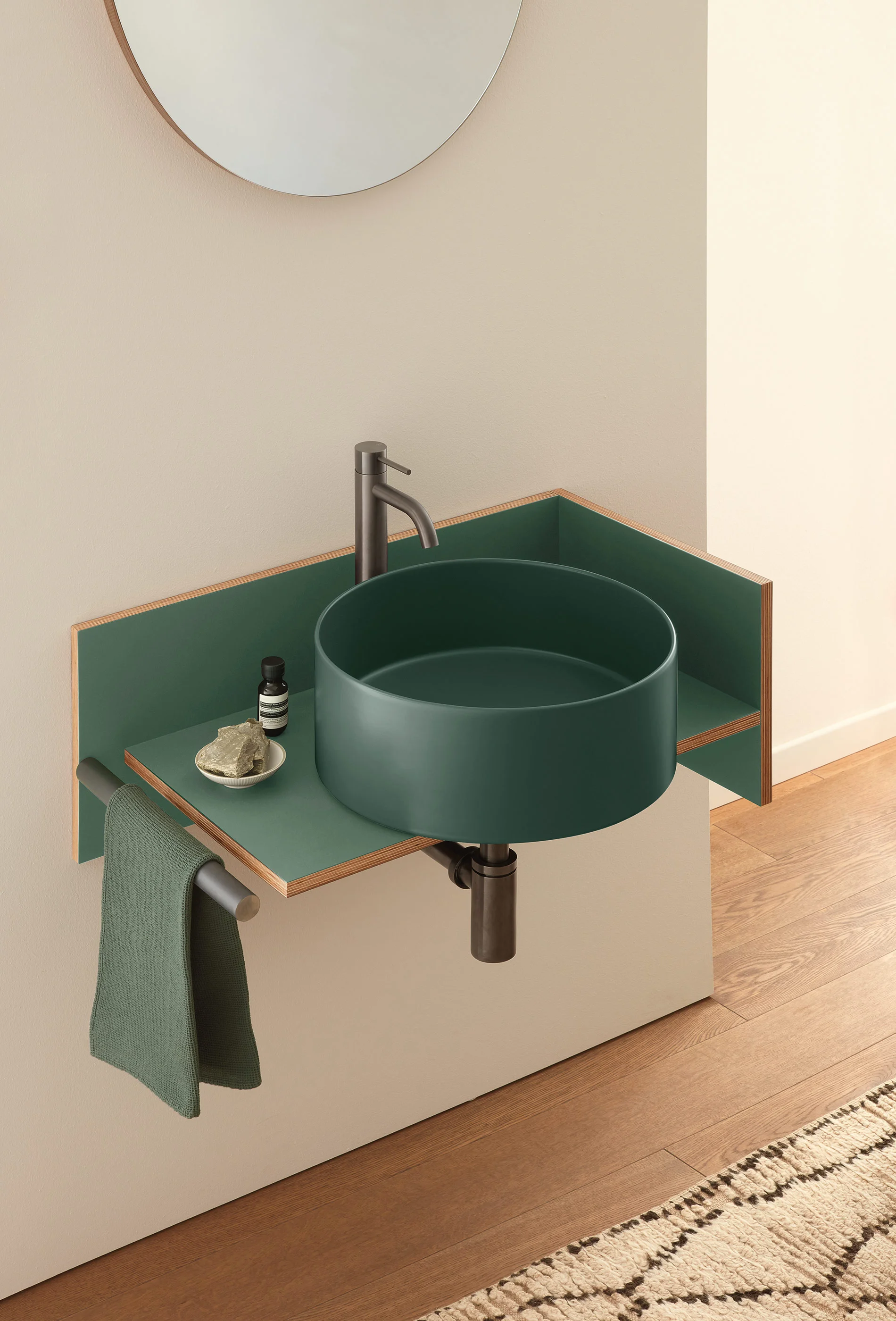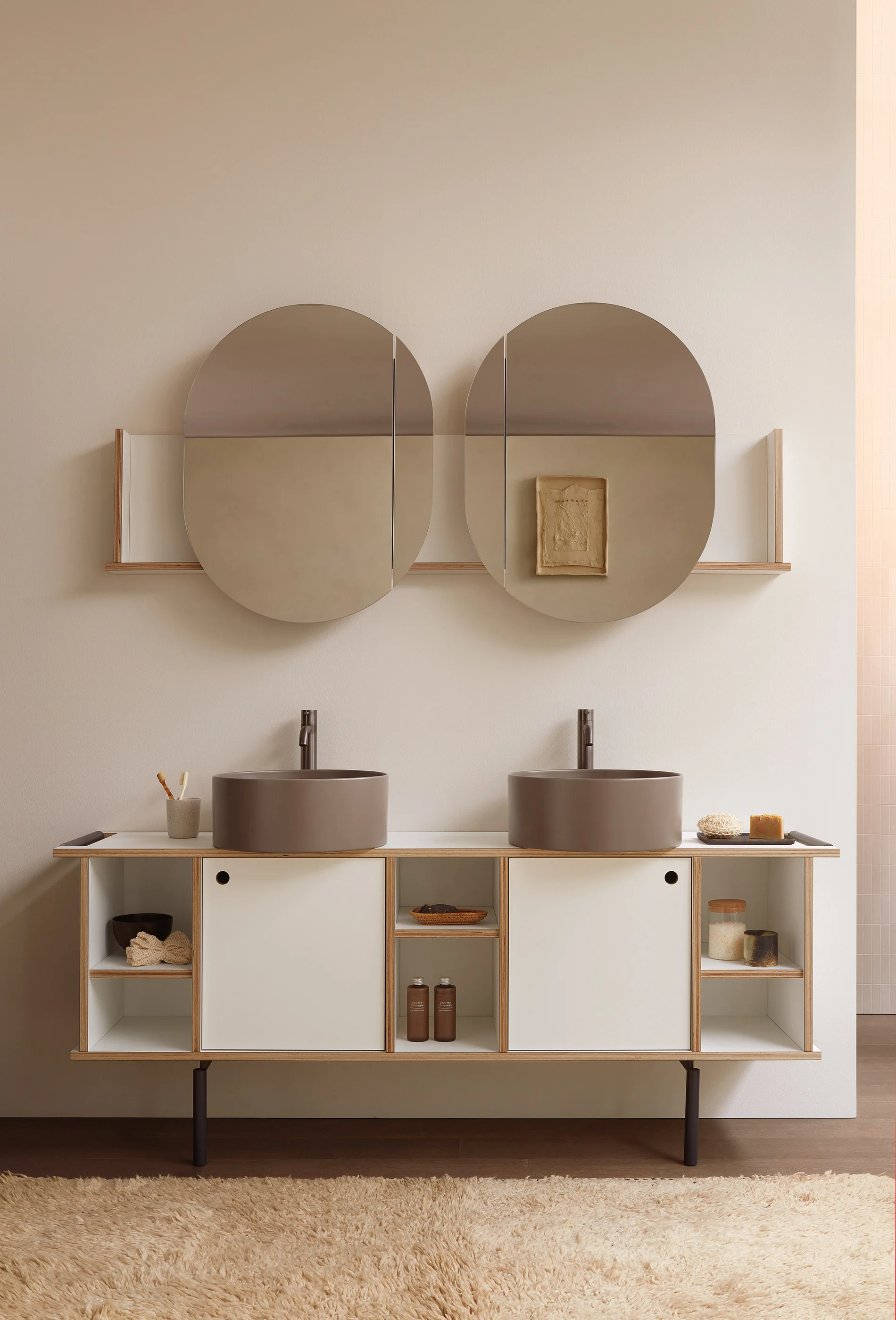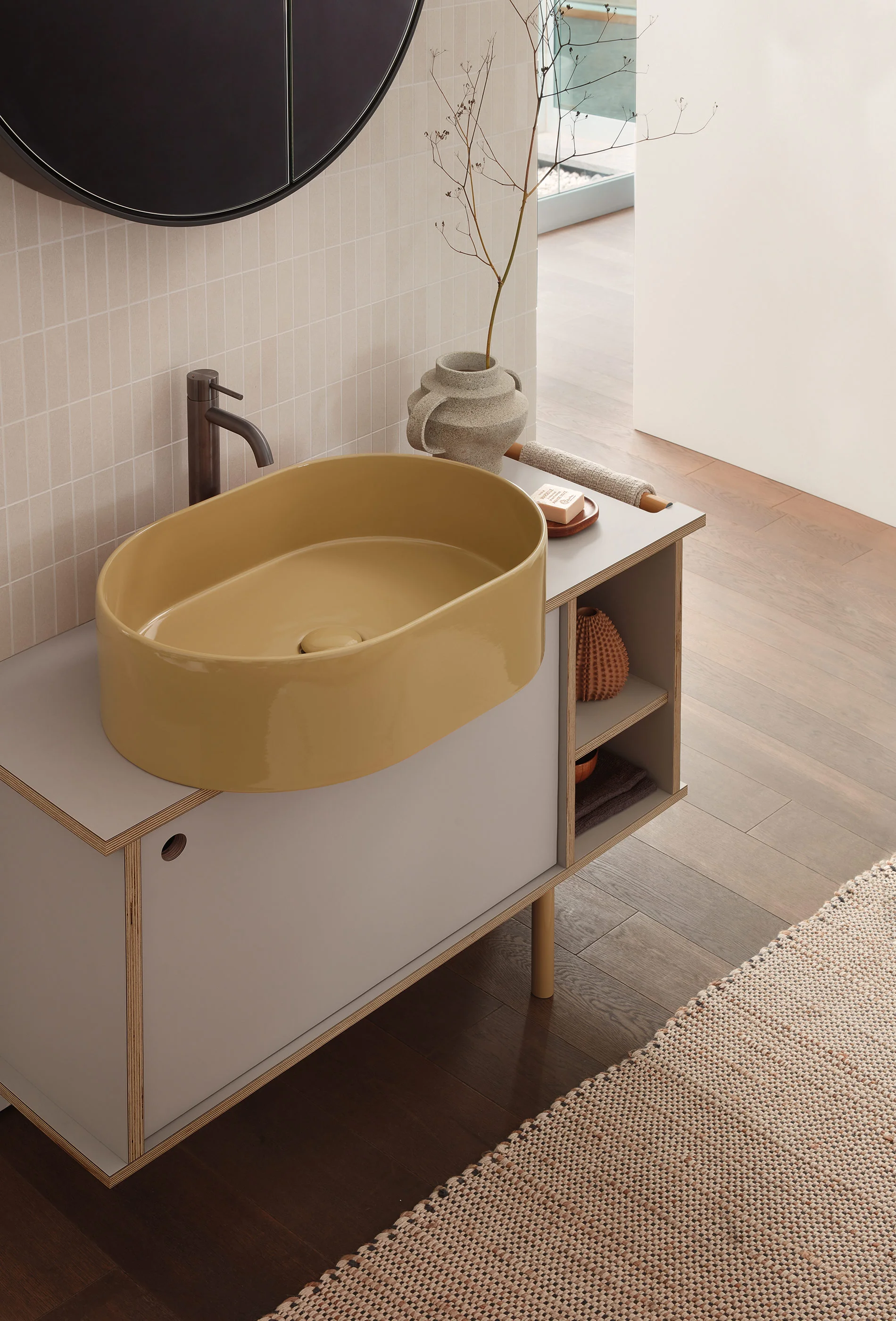 La collezione accosta il lavabo in ceramica a un mobile in Fenix su legno multistrato con bordatura a vista, sorretto da elementi tubolari in metallo. Il lavabo è disponibile nelle versioni Tonda e Ovale, in bianco lucido o nelle sfumature delle palette Terre e Acque di Cielo.