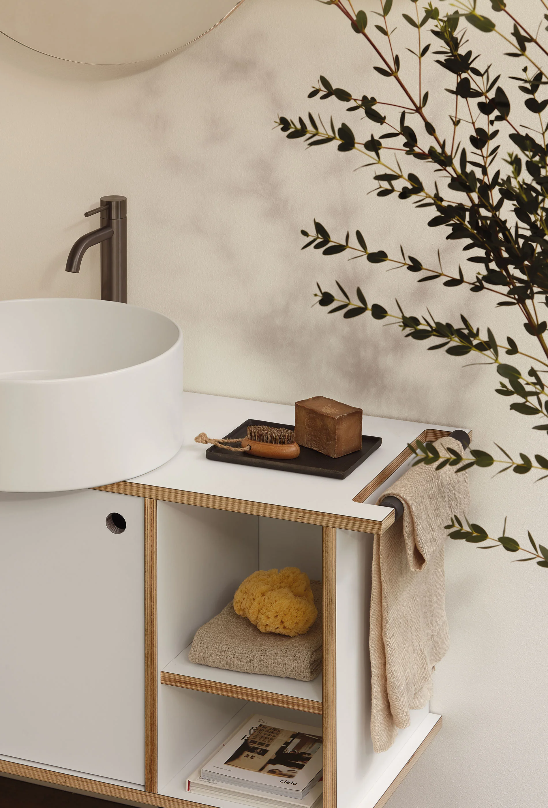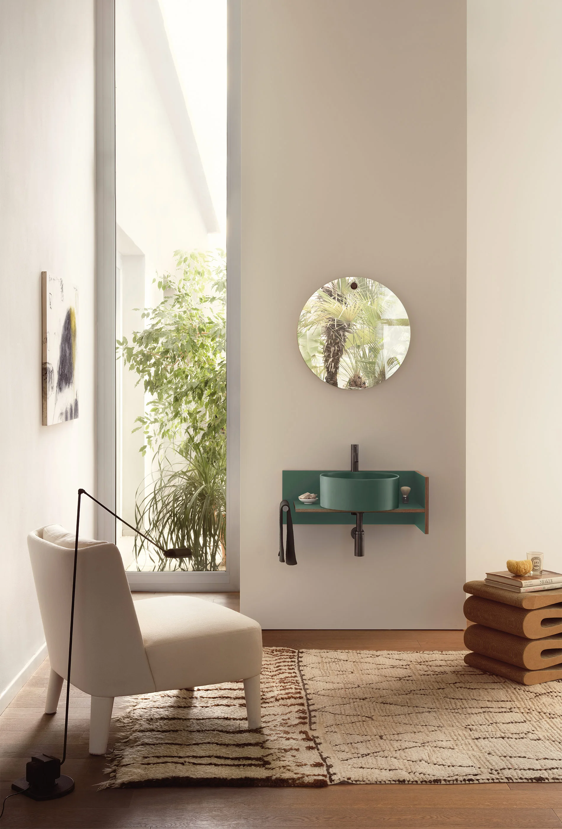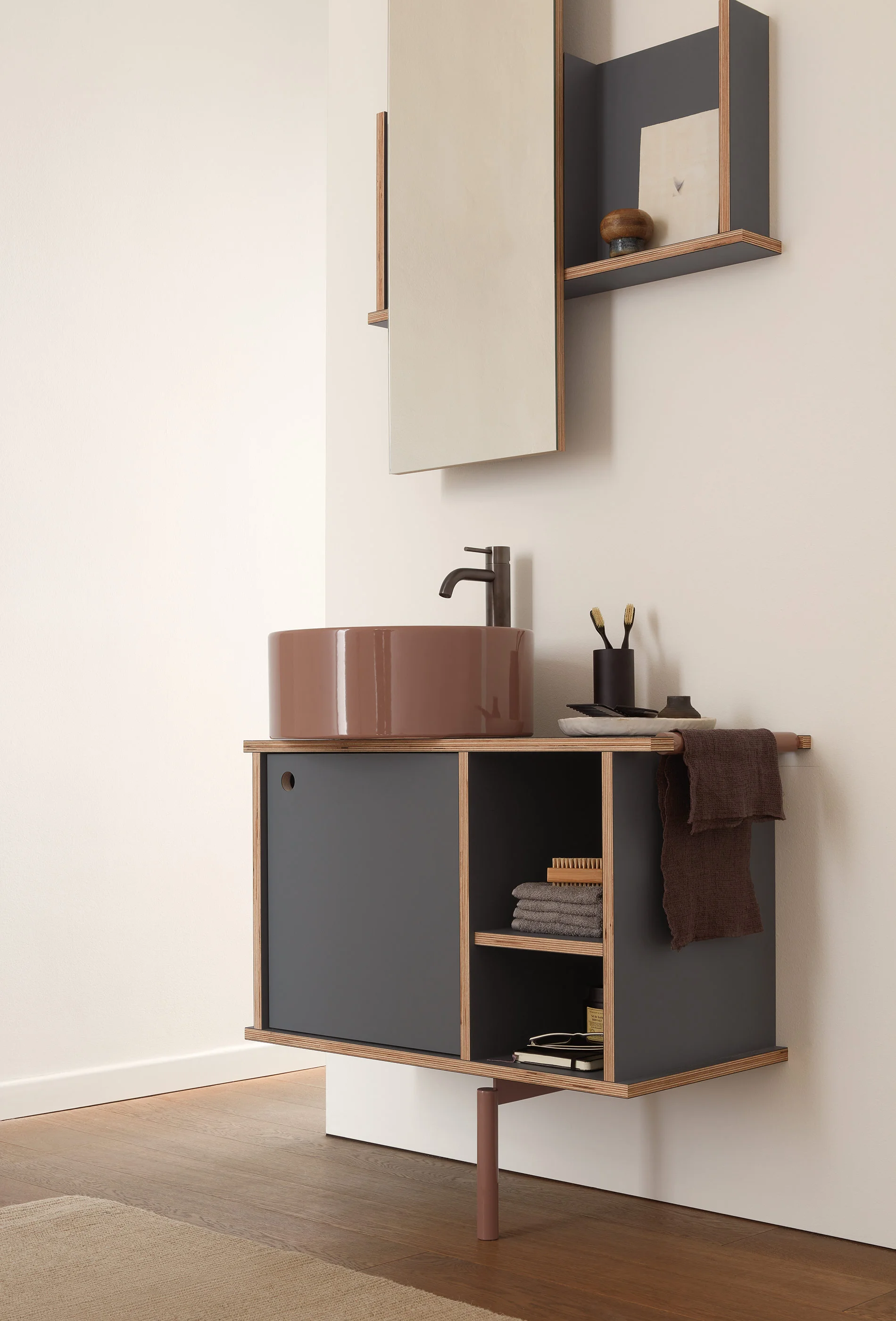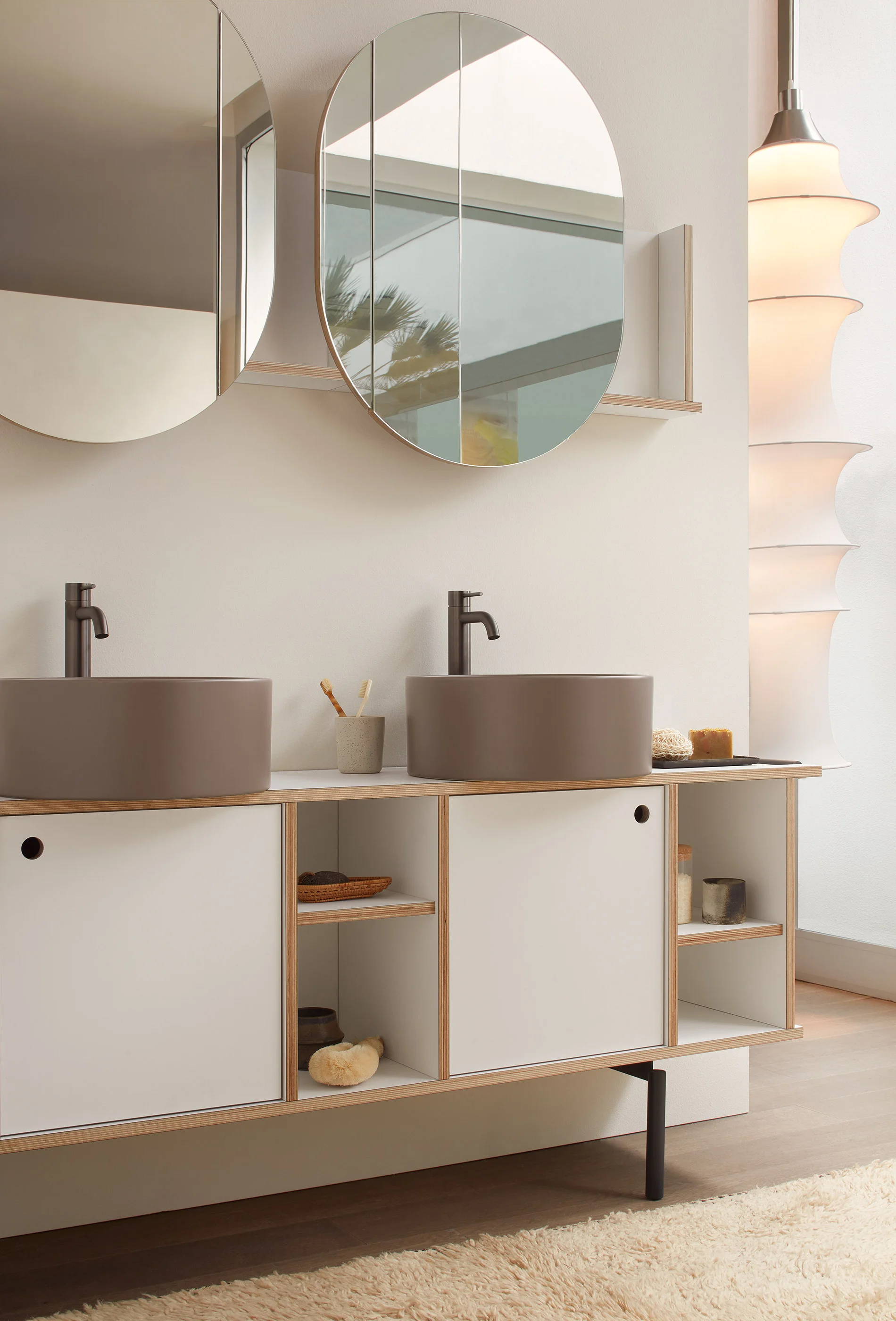 La collezione accosta il lavabo in ceramica a un mobile in Fenix su legno multistrato con bordatura a vista, sorretto da elementi tubolari in metallo. Il lavabo è disponibile nelle versioni Tonda e Ovale, in bianco lucido o nelle sfumature delle palette Terre e Acque di Cielo.