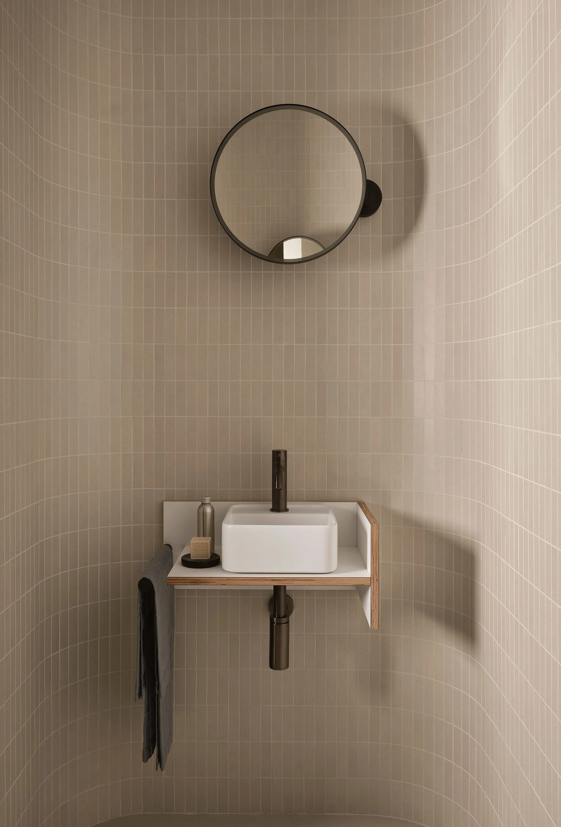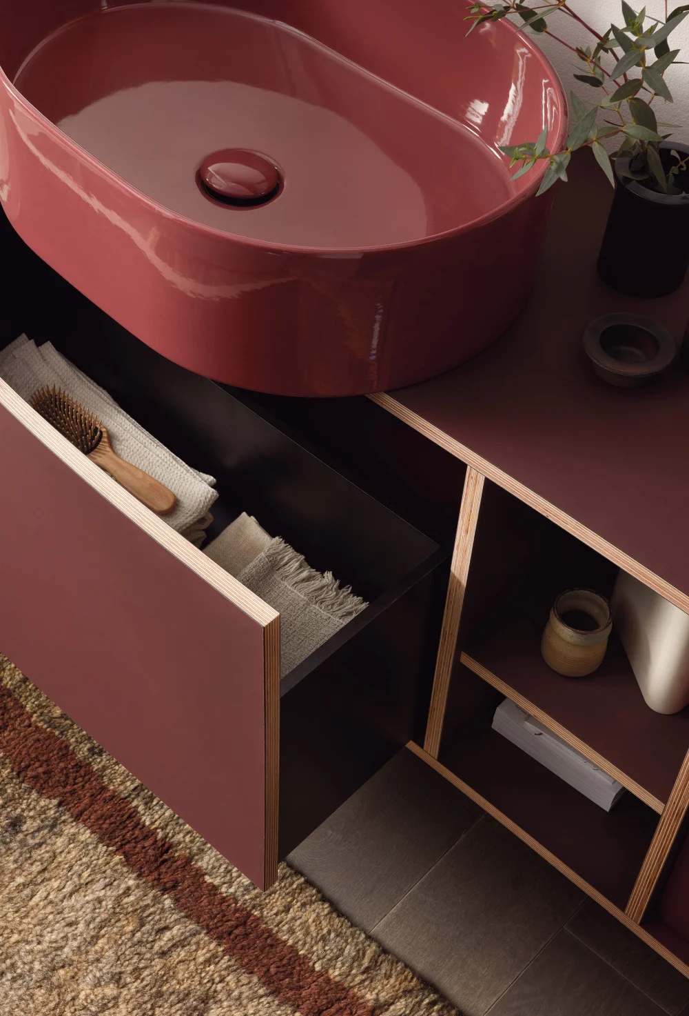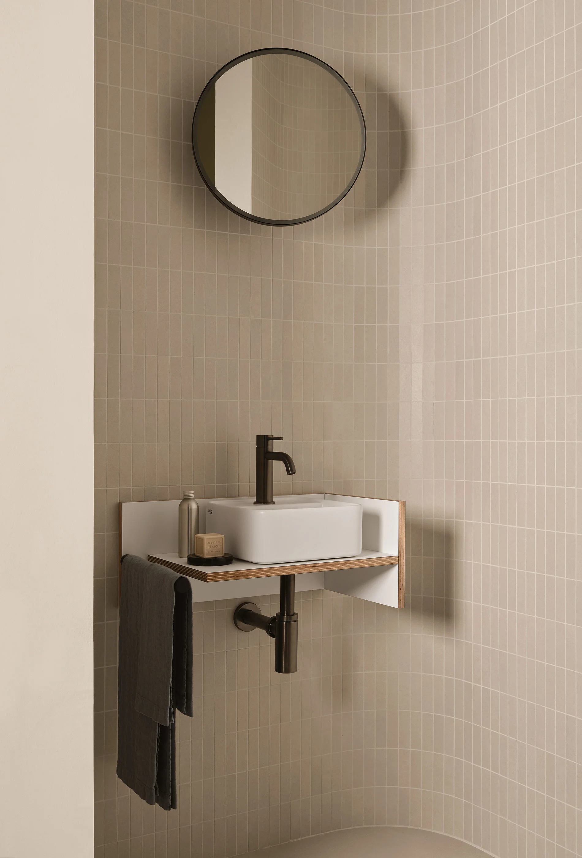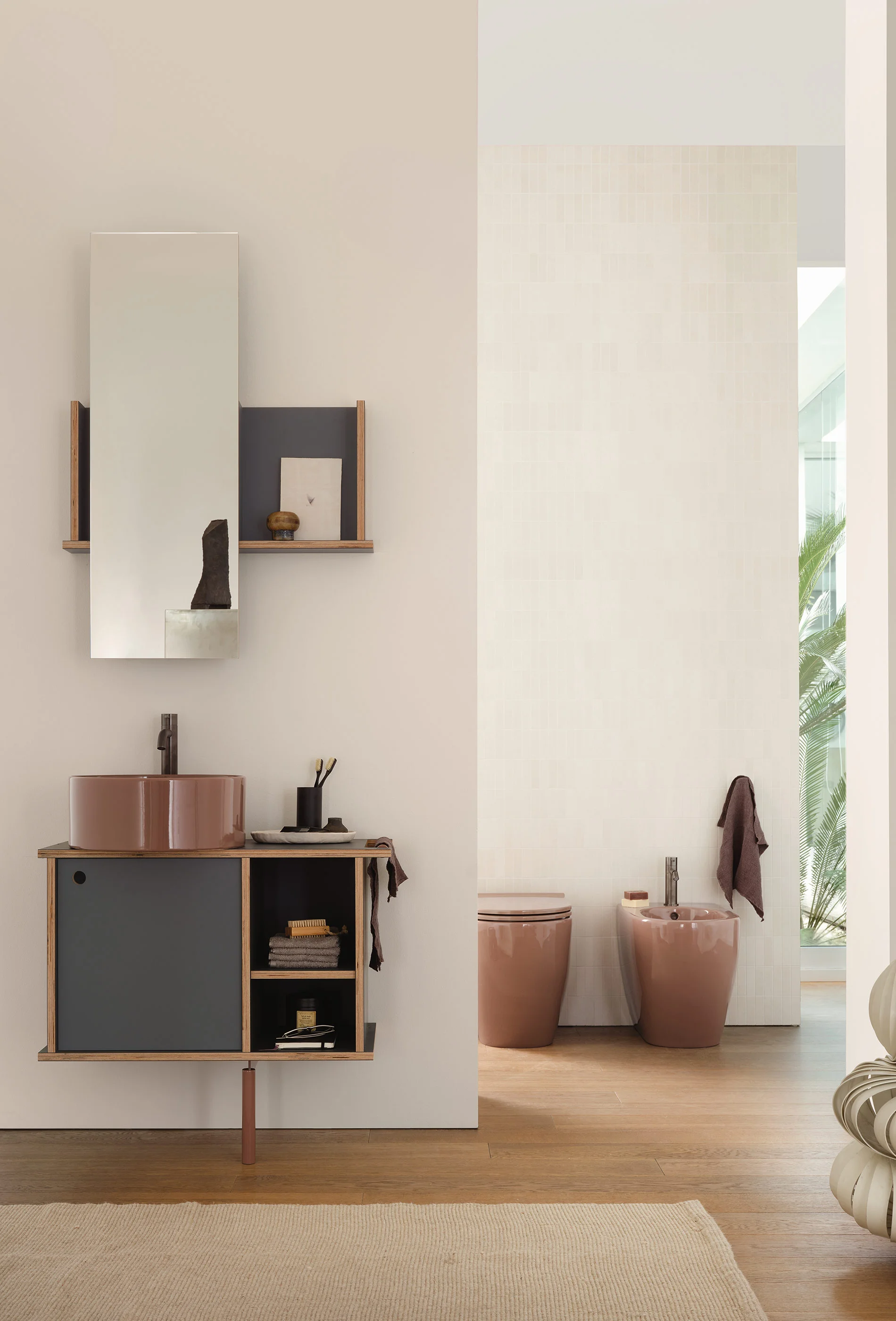 La collezione accosta il lavabo in ceramica a un mobile in Fenix su legno multistrato con bordatura a vista, sorretto da elementi tubolari in metallo. Il lavabo è disponibile nelle versioni Tonda e Ovale, in bianco lucido o nelle sfumature delle palette Terre e Acque di Cielo.