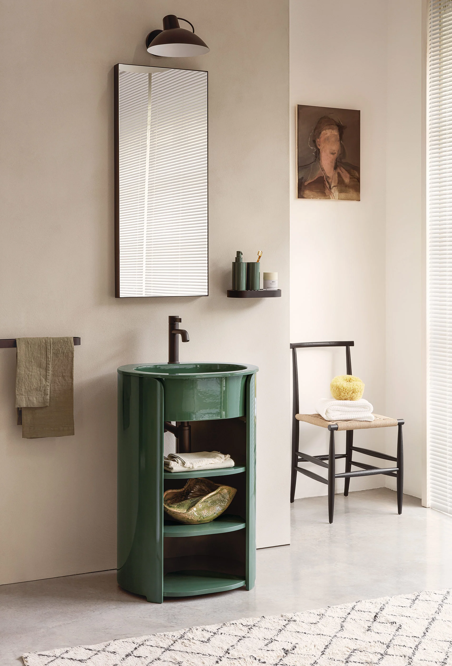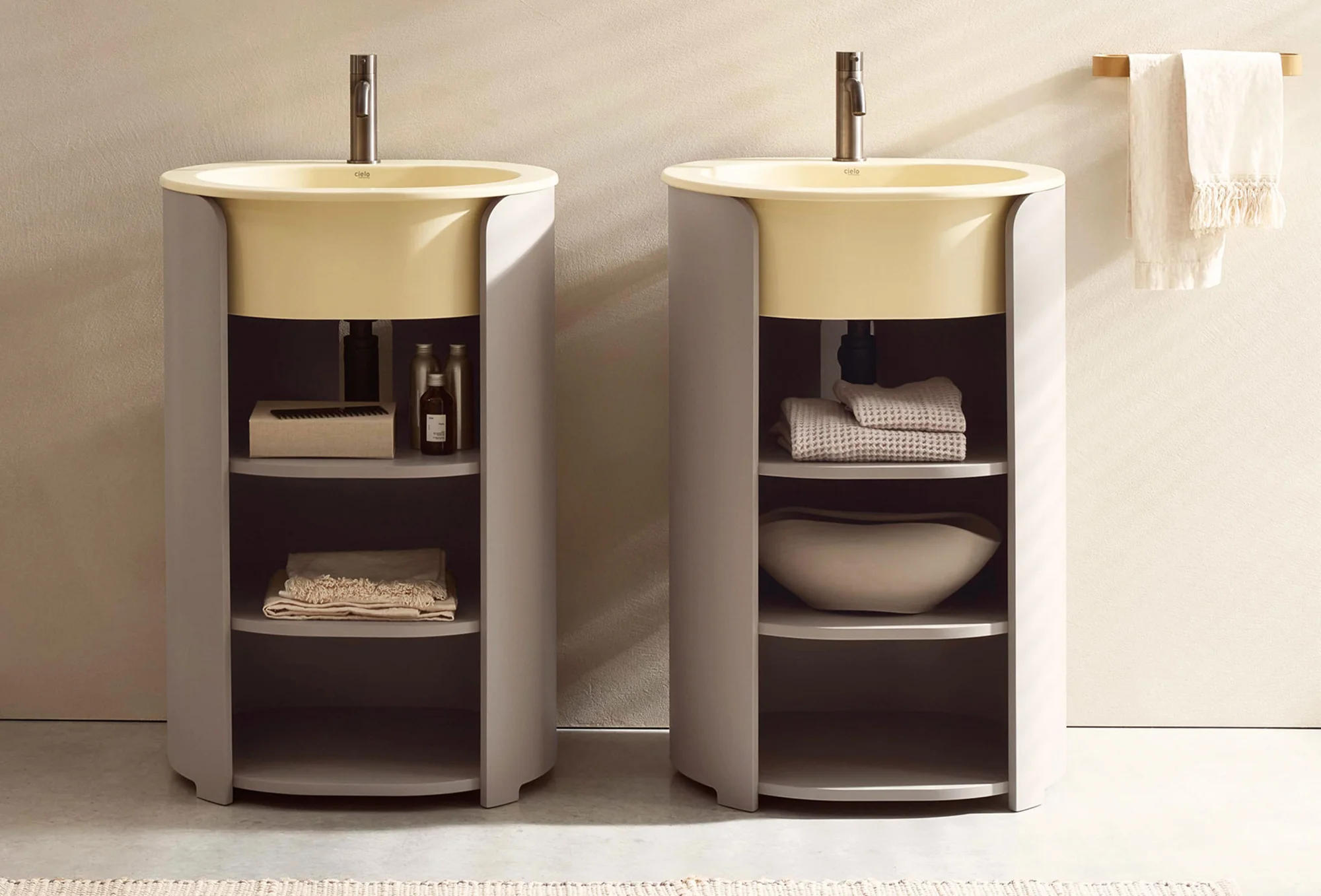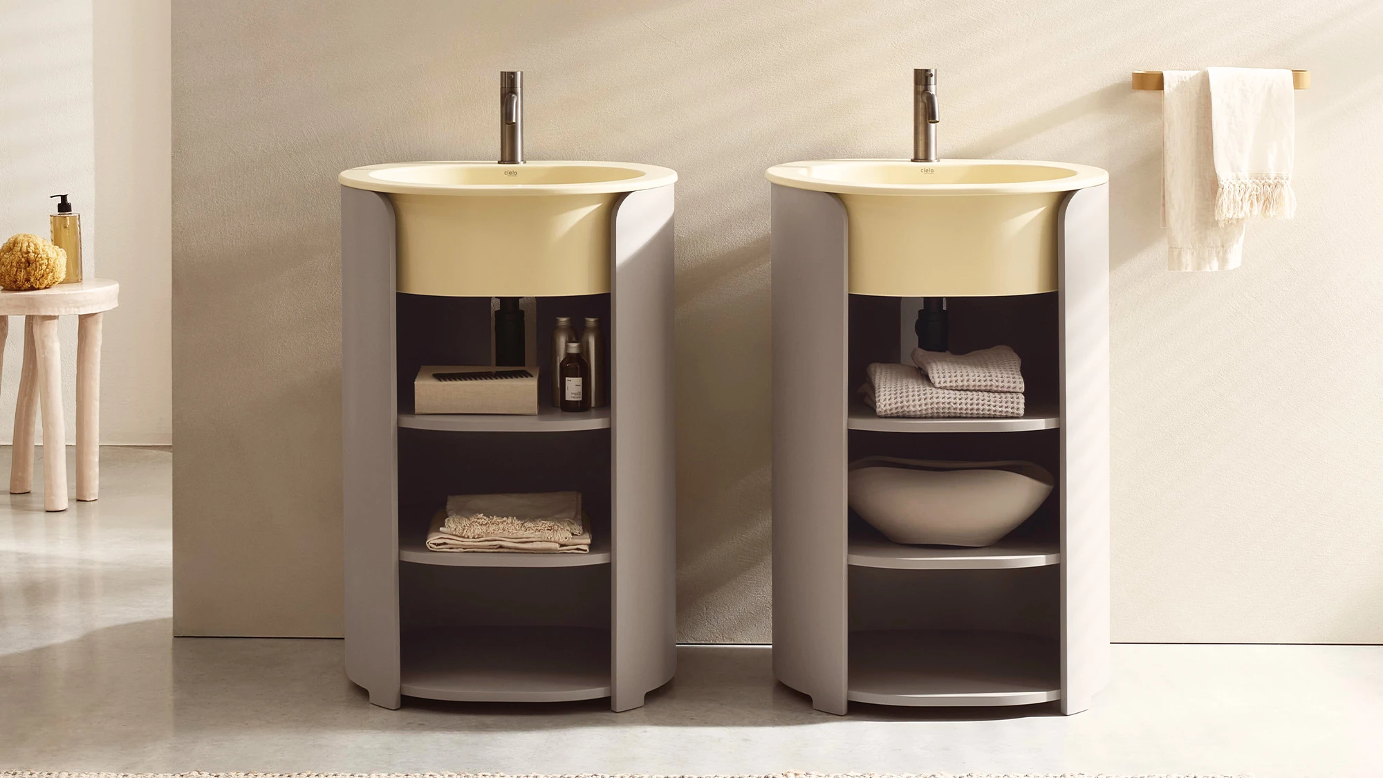 Il lavabo è disponibile nelle palette Terre di Cielo, Acque di Cielo ed Essential Colors, mentre la struttura in legno può essere personalizzata in molteplici varianti laccate o nelle essenze Eucalipto e Rovere. Il design è impreziosito da tre ripiani parzialmente a vista che creano un elegante gioco di pieni e vuoti, valorizzando la capacità contenitiva senza interrompere la pulizia formale dell'oggetto.