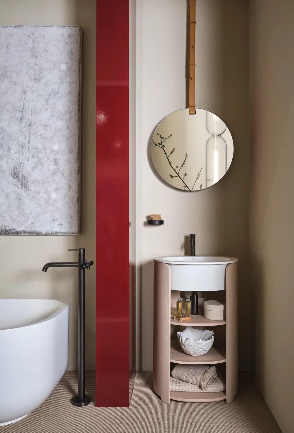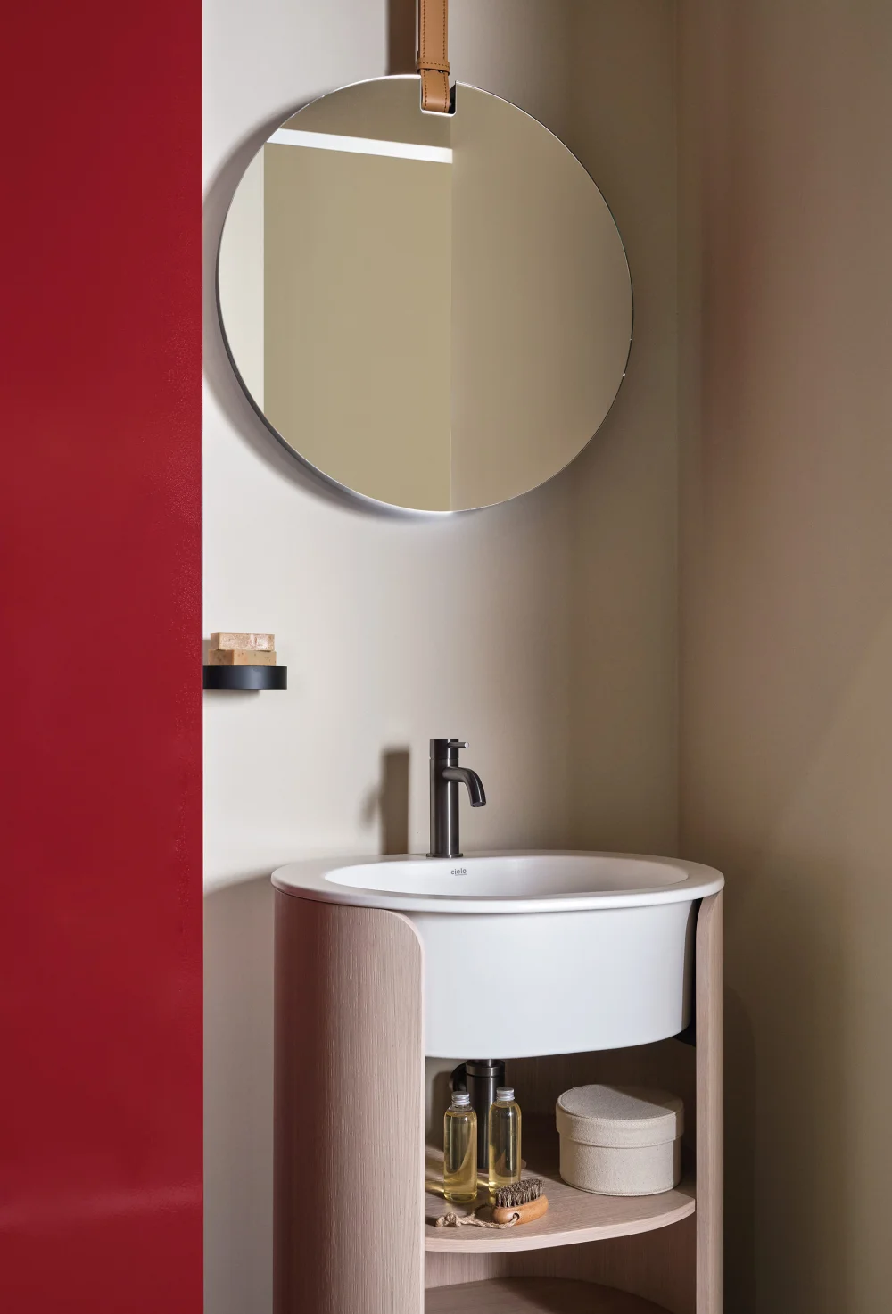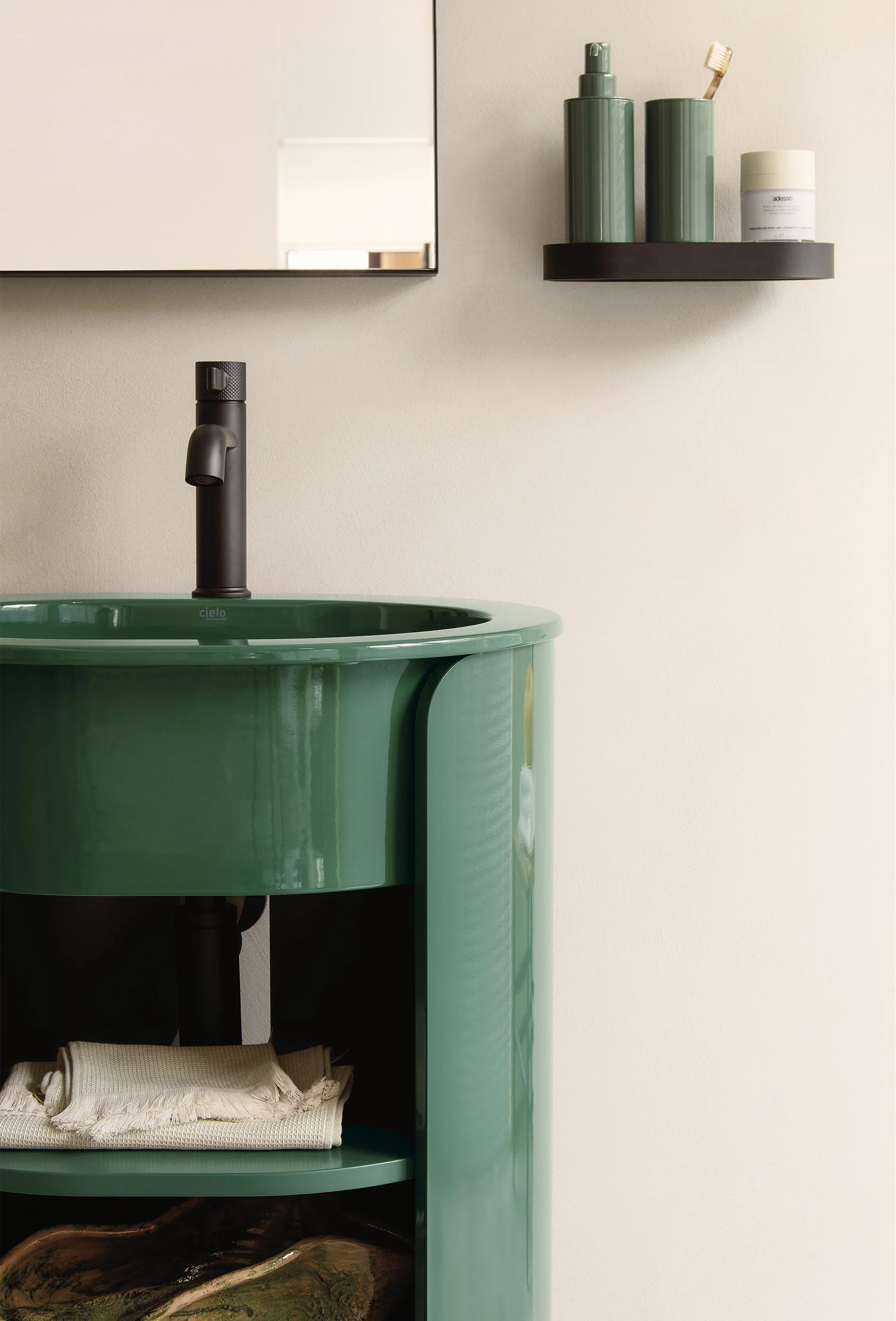 Il lavabo è disponibile nelle palette Terre di Cielo, Acque di Cielo ed Essential Colors, mentre la struttura in legno può essere personalizzata in molteplici varianti laccate o nelle essenze Eucalipto e Rovere. Il design è impreziosito da tre ripiani parzialmente a vista che creano un elegante gioco di pieni e vuoti, valorizzando la capacità contenitiva senza interrompere la pulizia formale dell'oggetto.