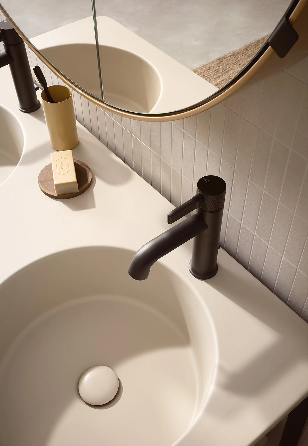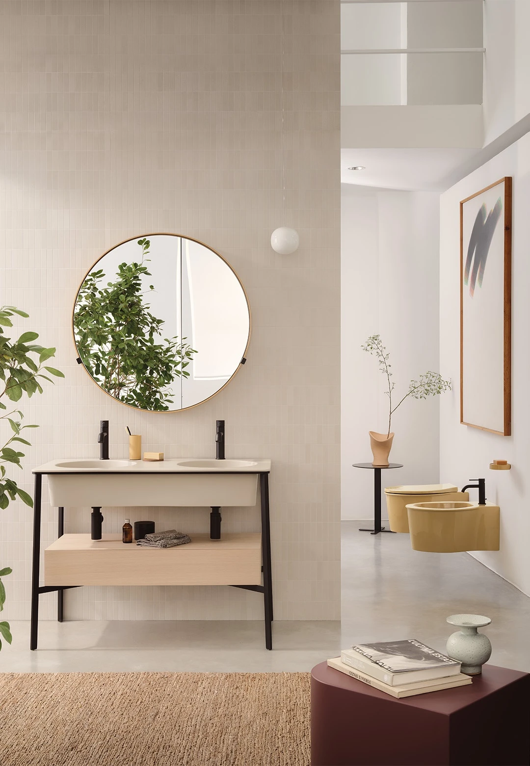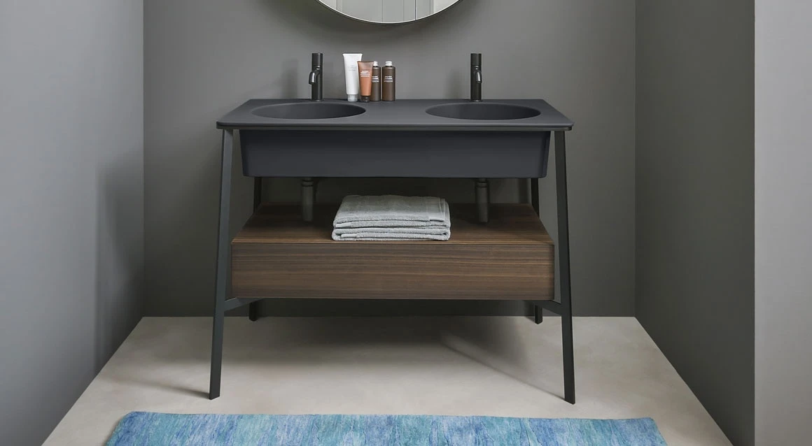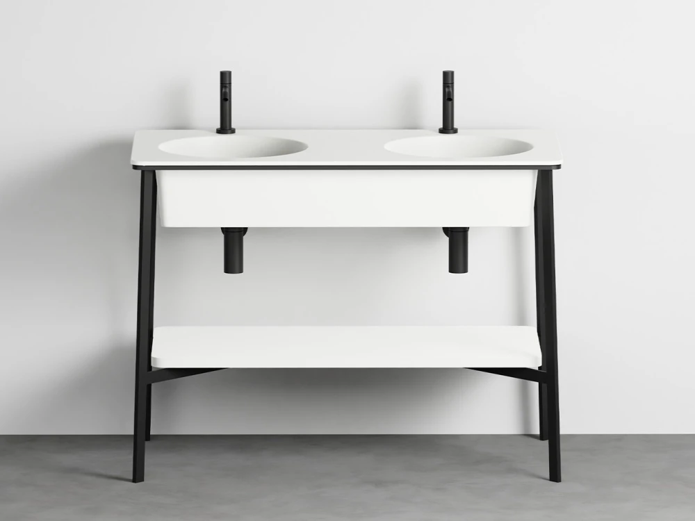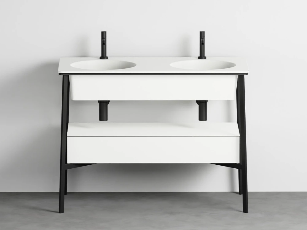 Sistema componibile con un pratico lavabo a doppia vasca in ceramica dalle molteplici finiture, montato su di una struttura in acciaio verniciato in diverse finiture e la possibilità di abbinare un comodo piano di appoggio in legno laccato o marmo oppure un pratico cassetto contenitore disponibile nelle finiture laccate o nelle pregiate essenze naturali.