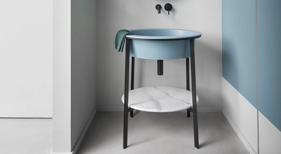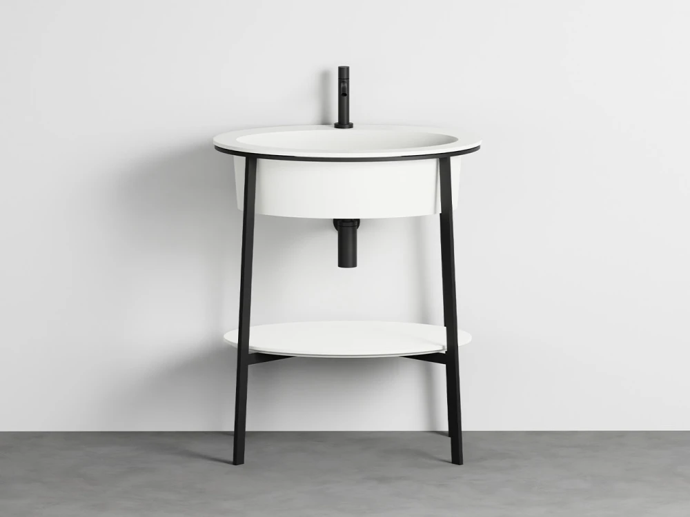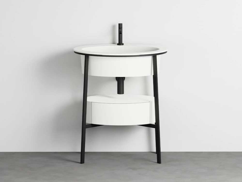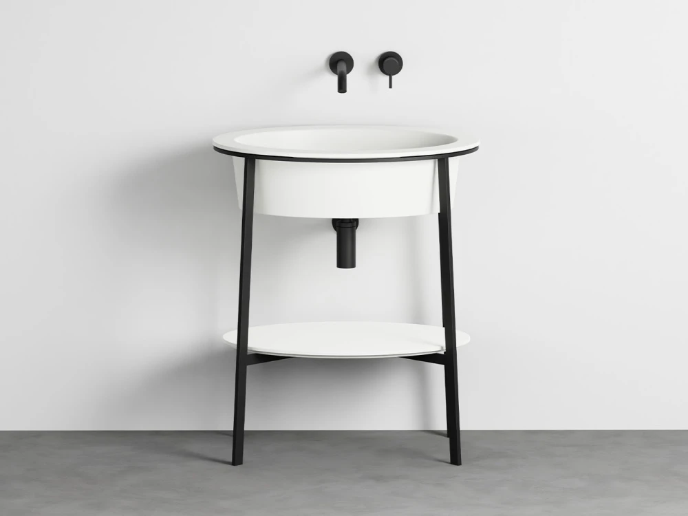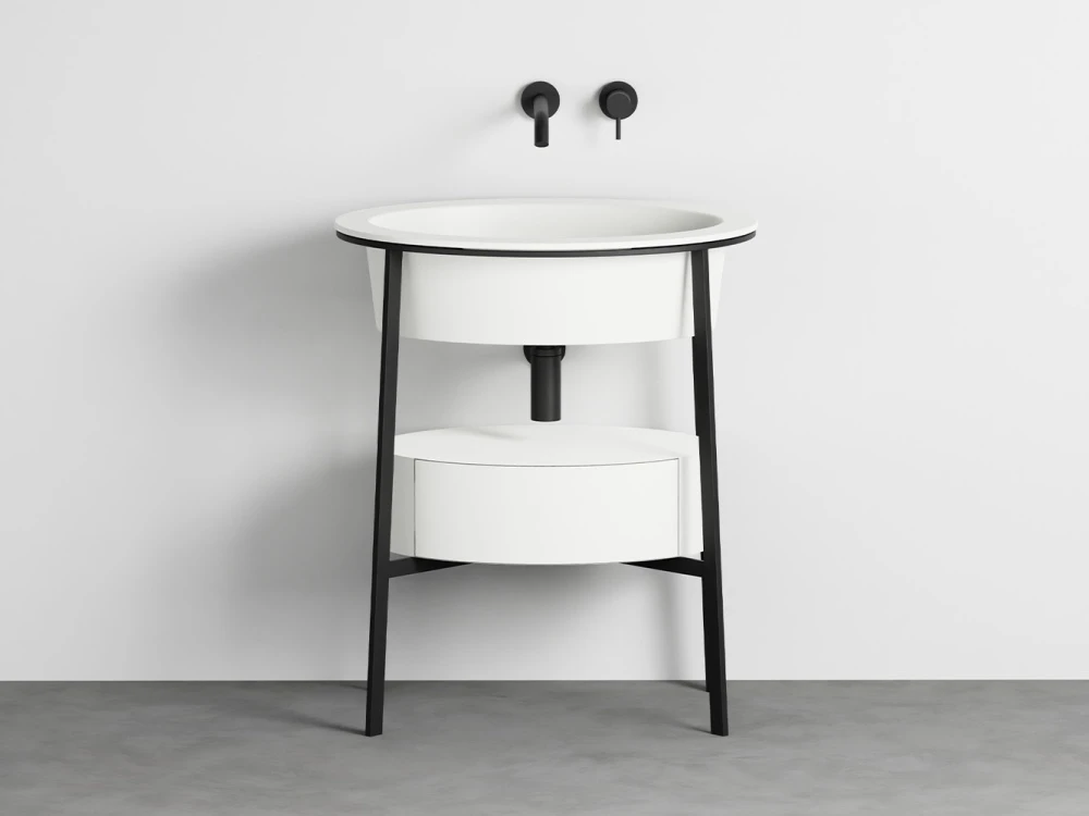 Sistema componibile con un lavabo in ceramica dalle molteplici finiture, disponibile nelle due versioni con o senza foro rubinetto, montato su di una struttura in acciaio verniciato in diverse finiture e la possibilità di abbinare un comodo piano di appoggio in ceramica o marmo oppure un pratico cassetto contenitore disponibile nelle finiture laccate o nelle pregiate essenze naturali.