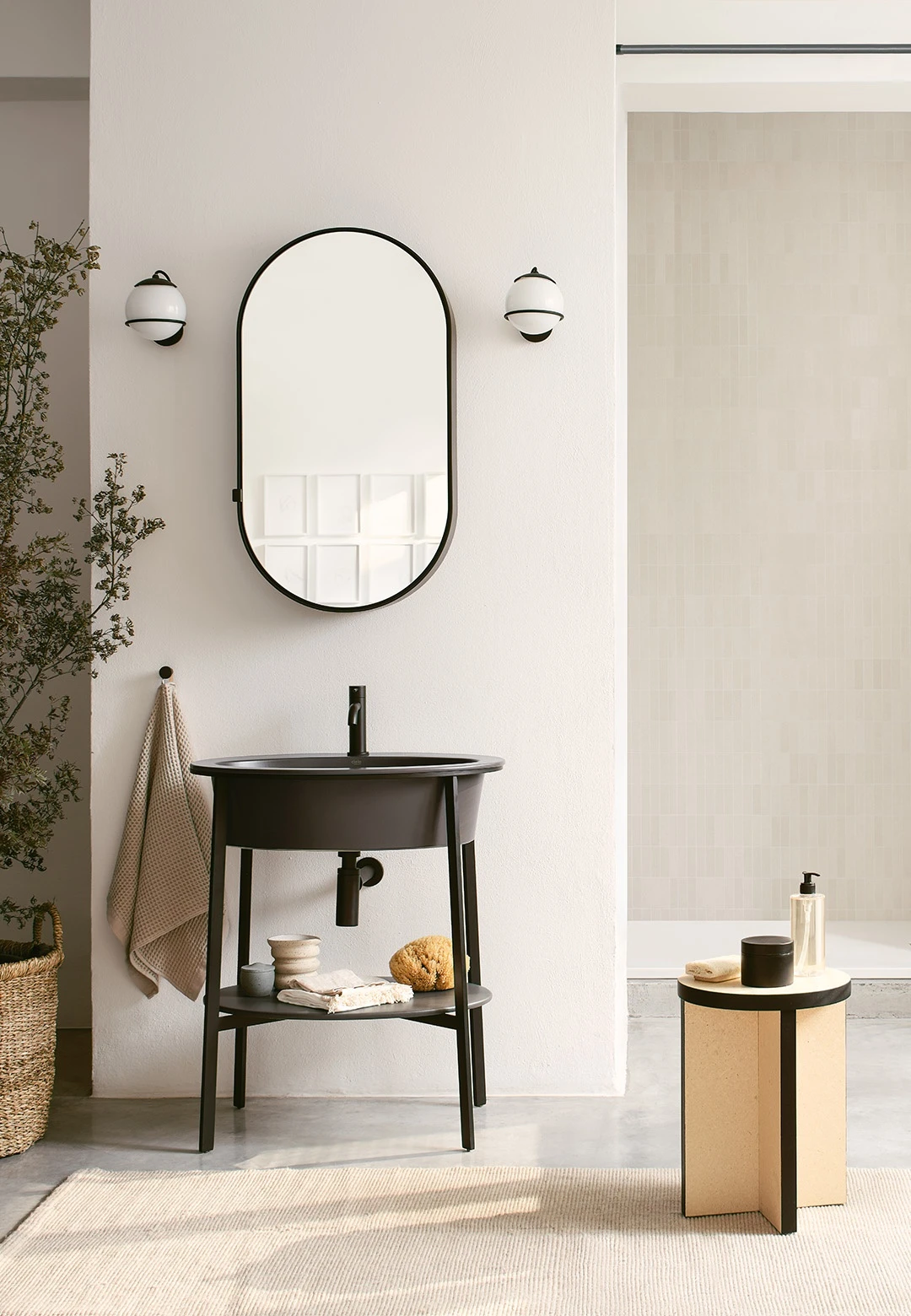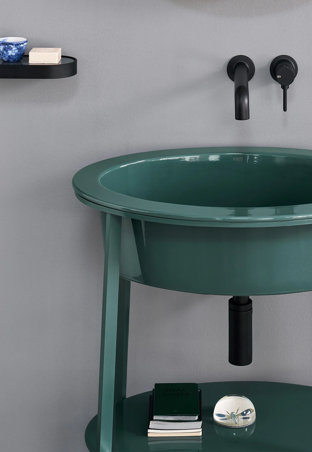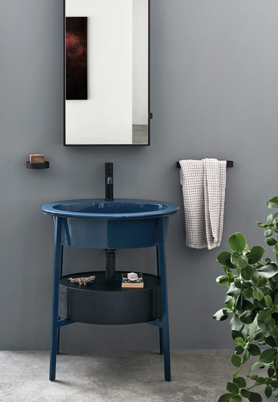 Sistema componibile con un lavabo in ceramica dalle molteplici finiture, disponibile nelle due versioni con o senza foro rubinetto, montato su di una struttura in acciaio verniciato in diverse finiture e la possibilità di abbinare un comodo piano di appoggio in ceramica o marmo oppure un pratico cassetto contenitore disponibile nelle finiture laccate o nelle pregiate essenze naturali.