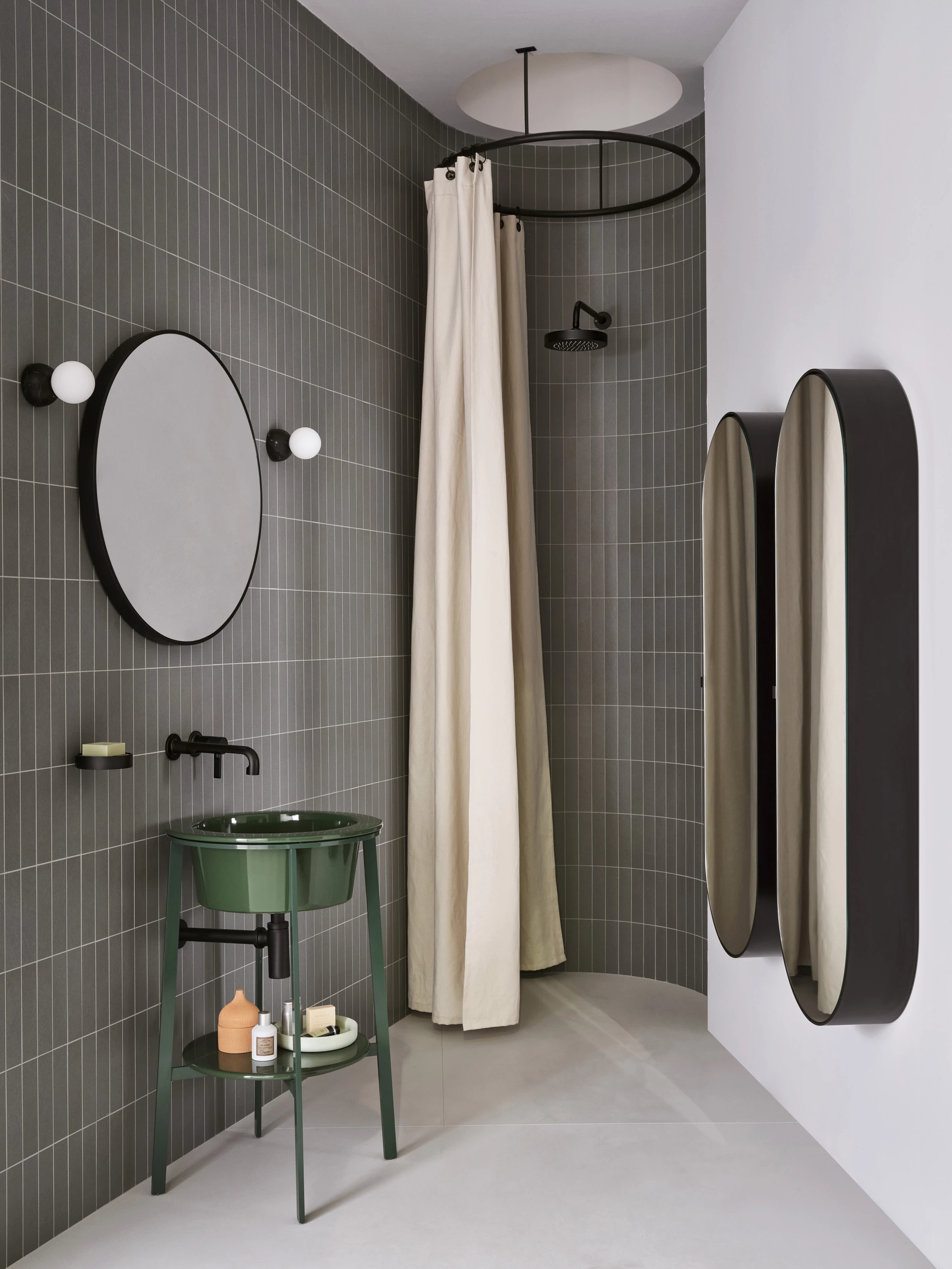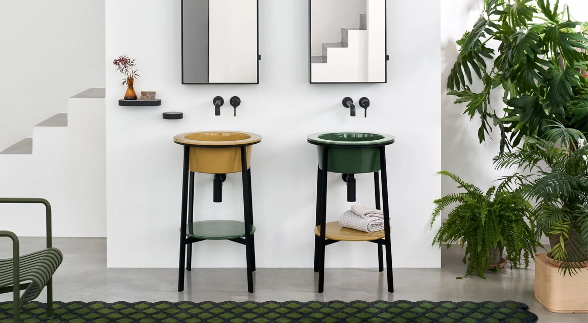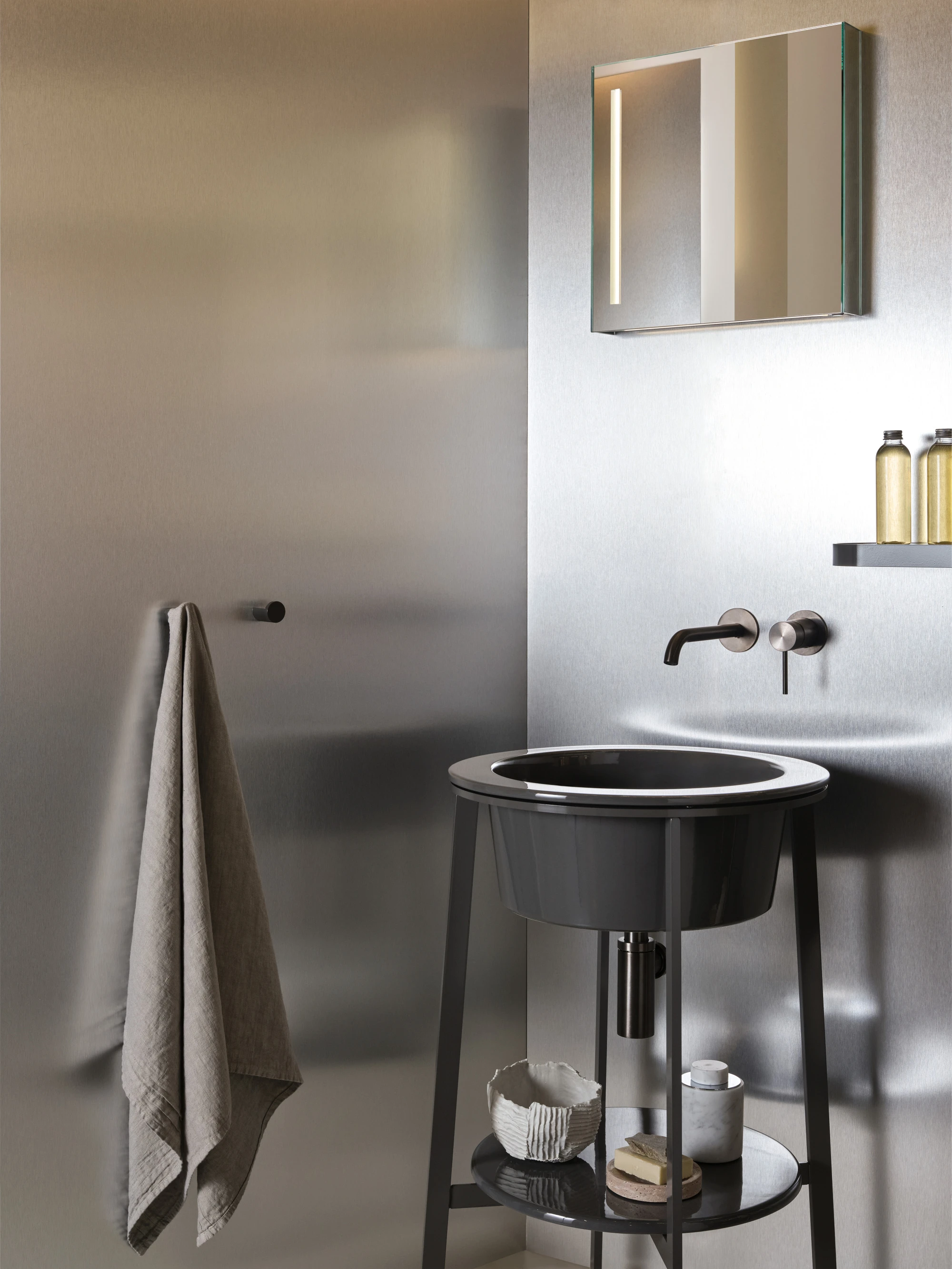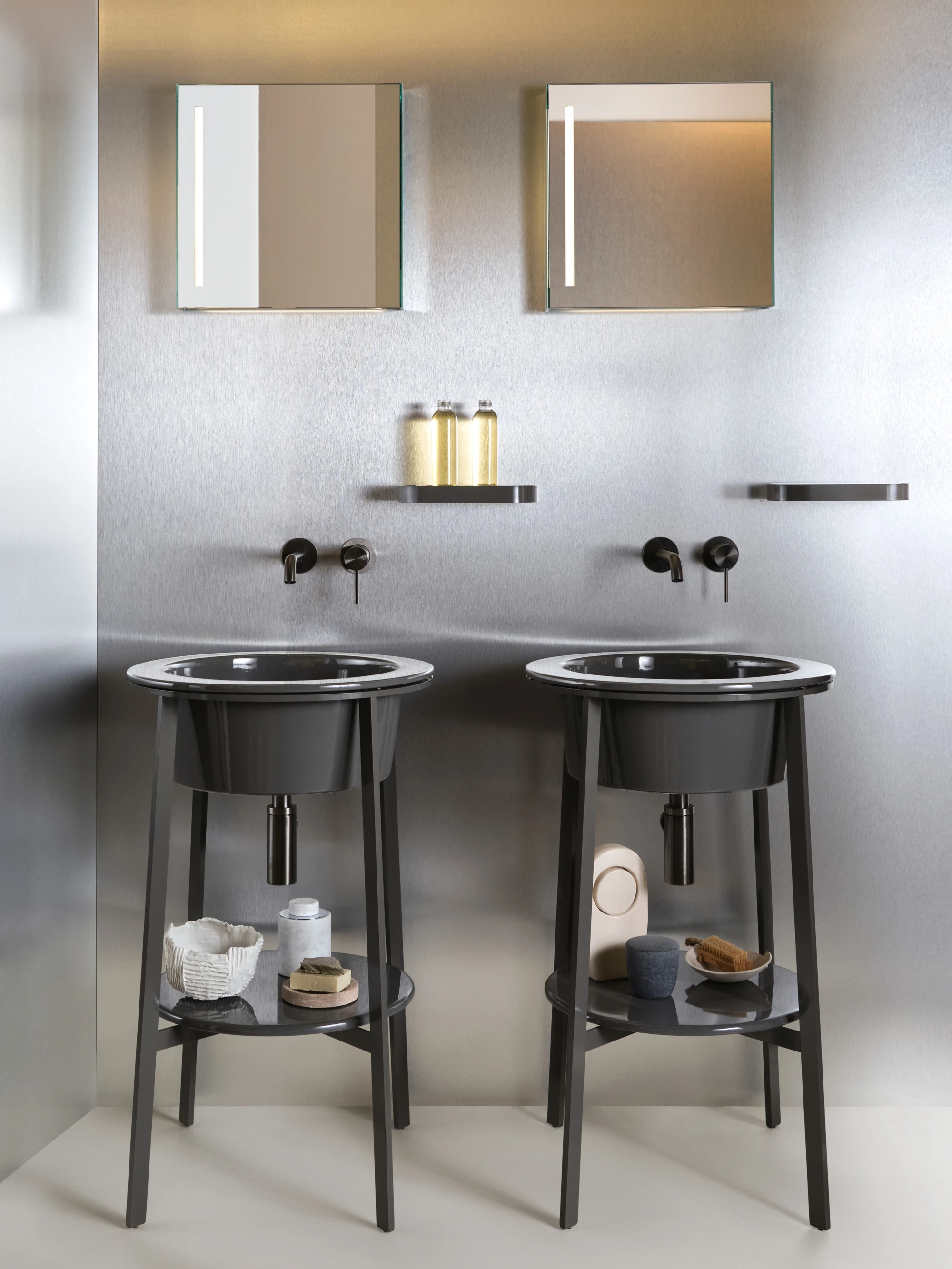Sistema componibile con un lavabo in ceramica dalle molteplici finiture, la struttura in acciaio verniciato e un comodo piano di appoggio in ceramica o marmo.