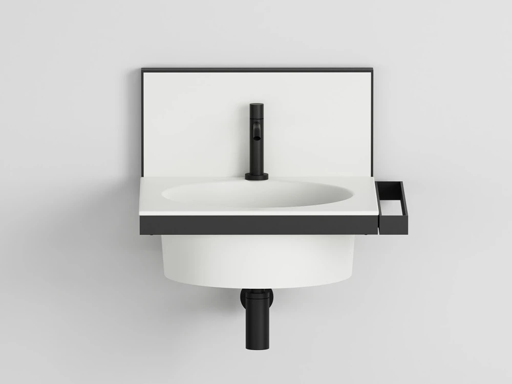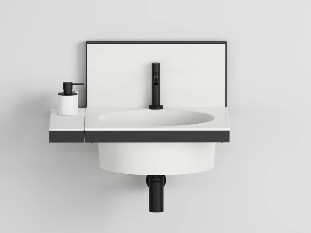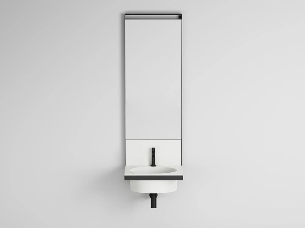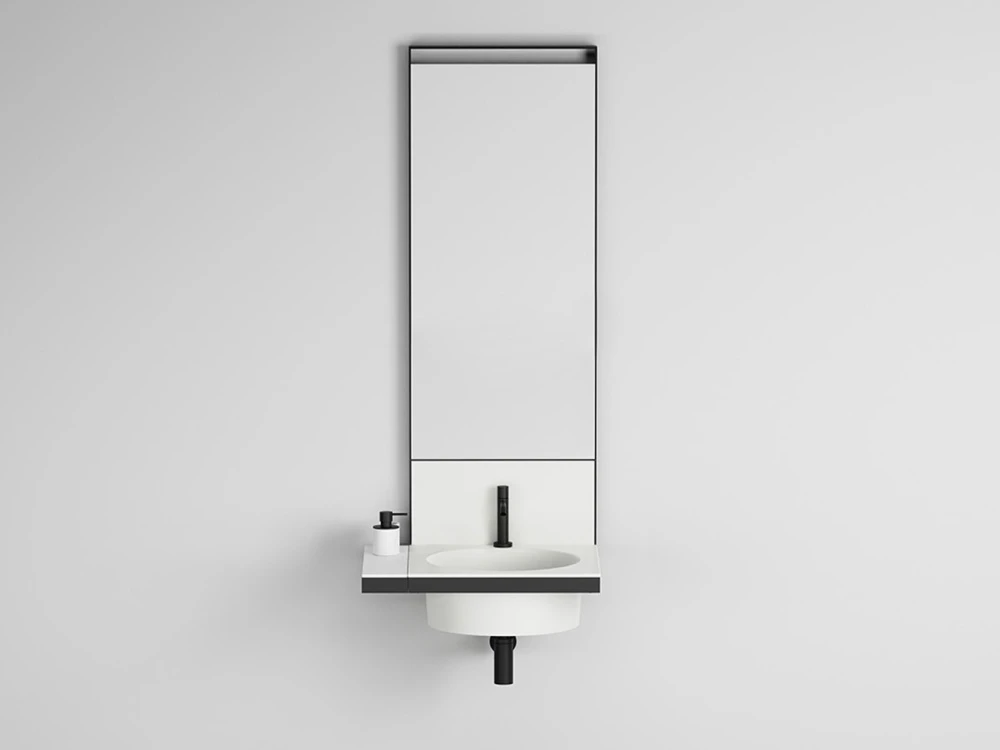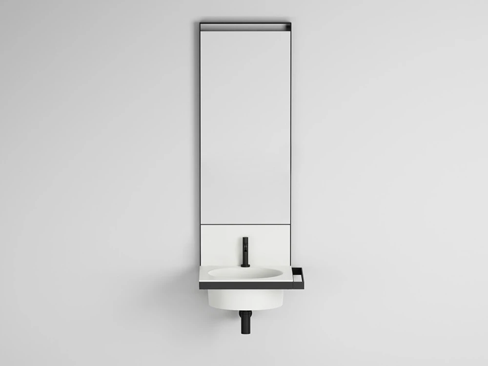 Sistema componibile di lavabo in diverse finiture ceramiche, montato su una struttura sospesa in acciaio verniciato, con alzatina in ceramica. Uno specchio, porta asiugamani, porta oggetti e accessori completano il prodotto.