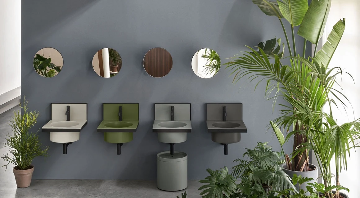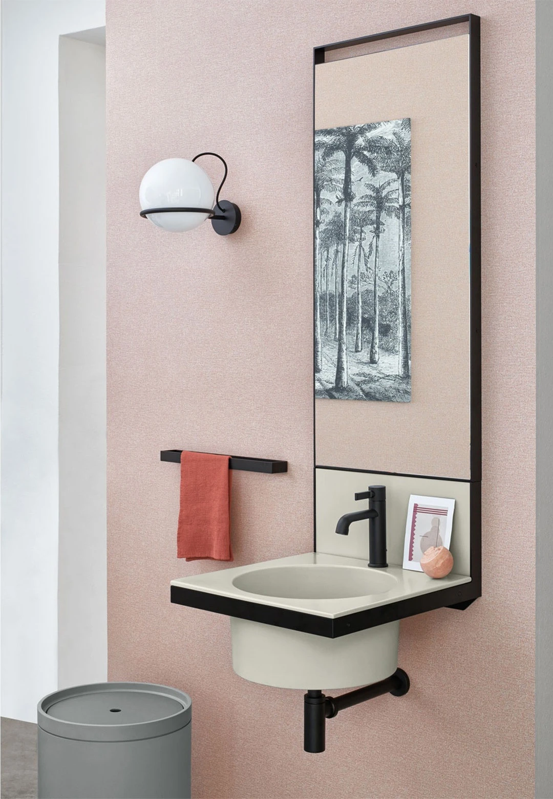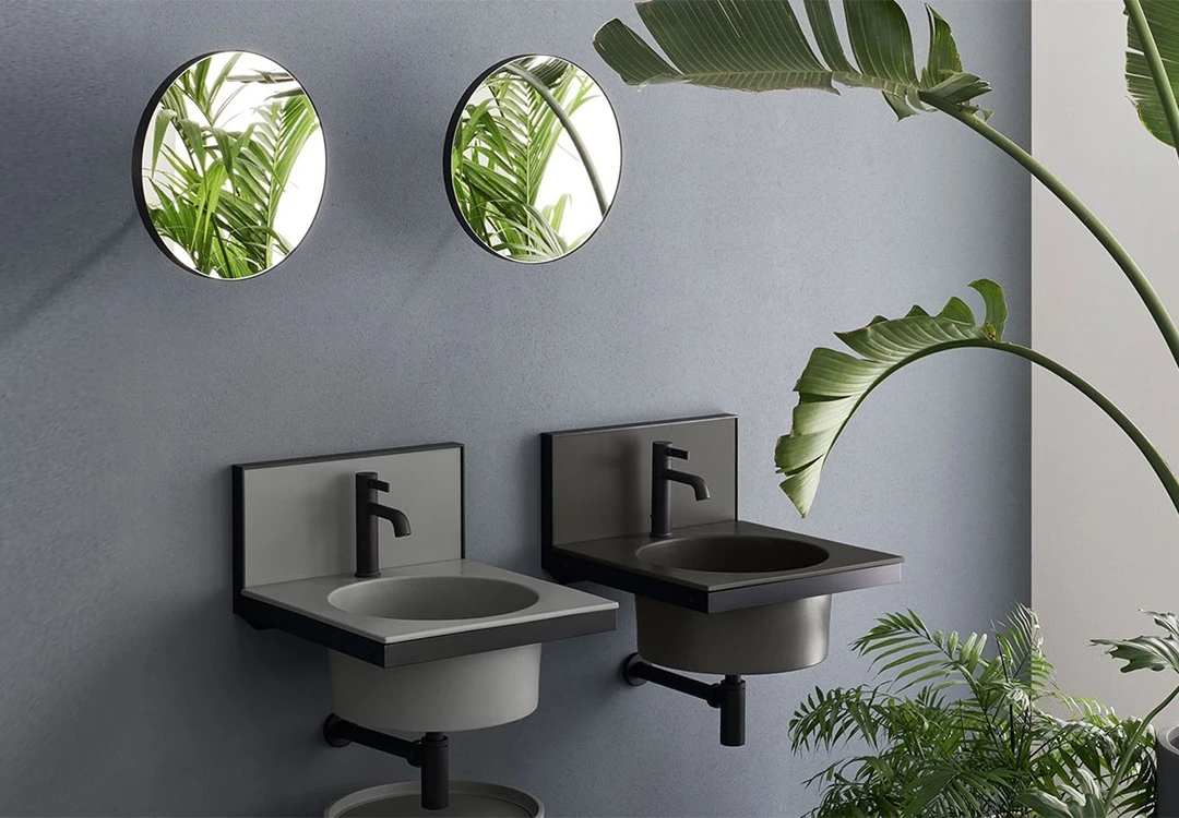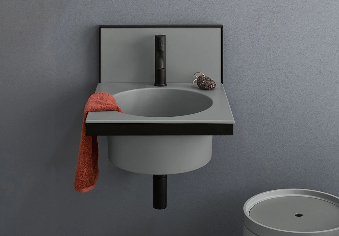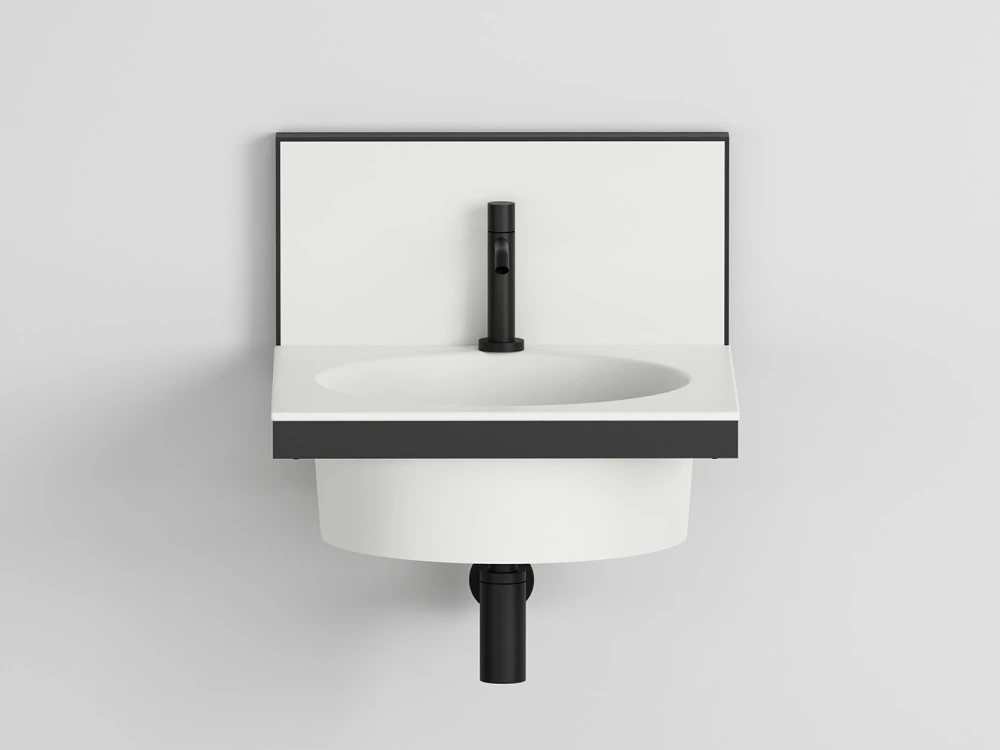 Sistema componibile di lavabo in diverse finiture ceramiche, montato su una struttura sospesa in acciaio verniciato, con alzatina in ceramica. Uno specchio, porta asiugamani, porta oggetti e accessori completano il prodotto.