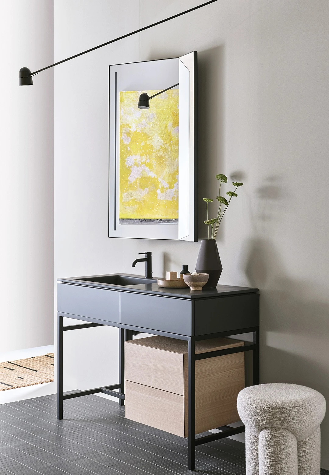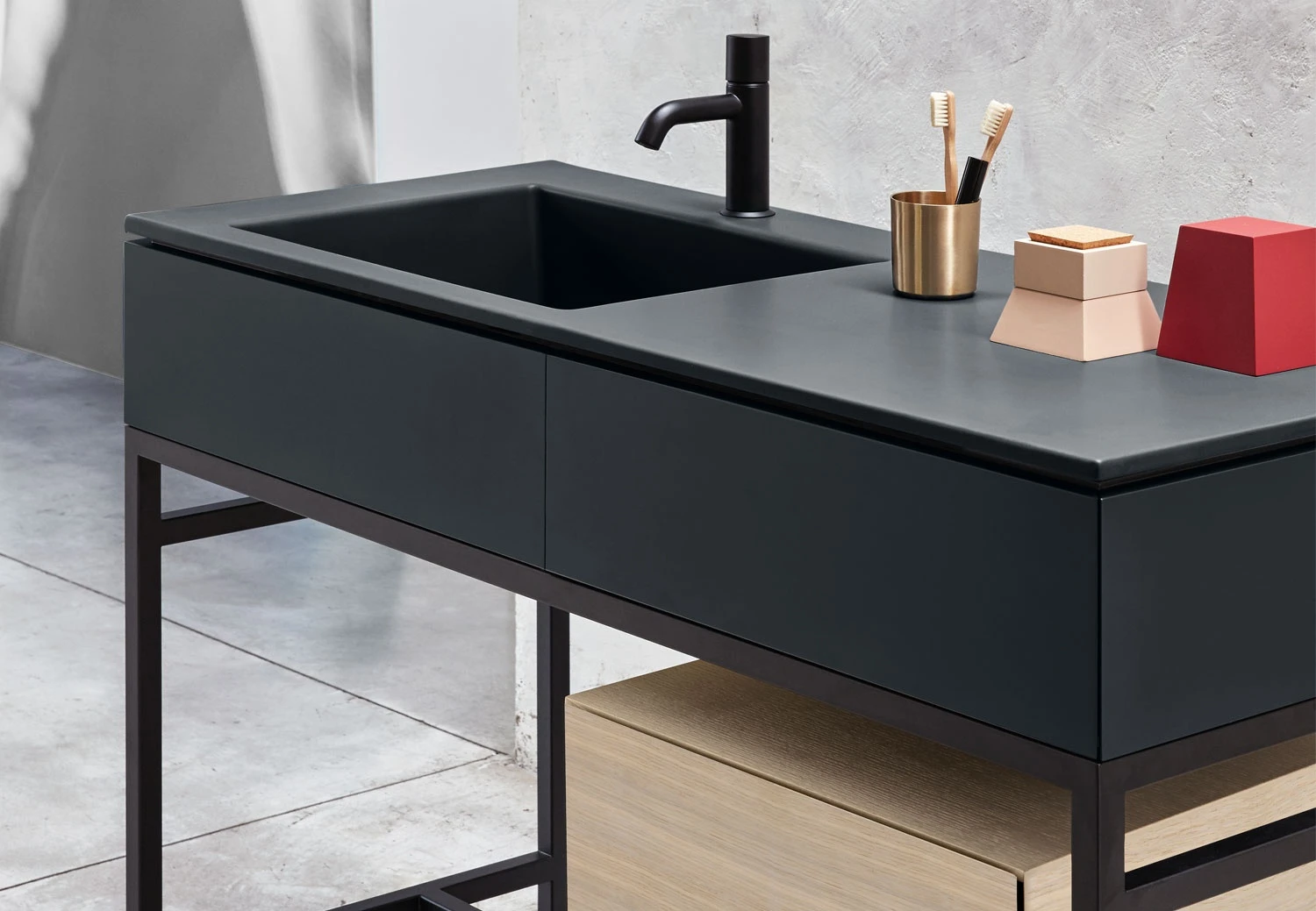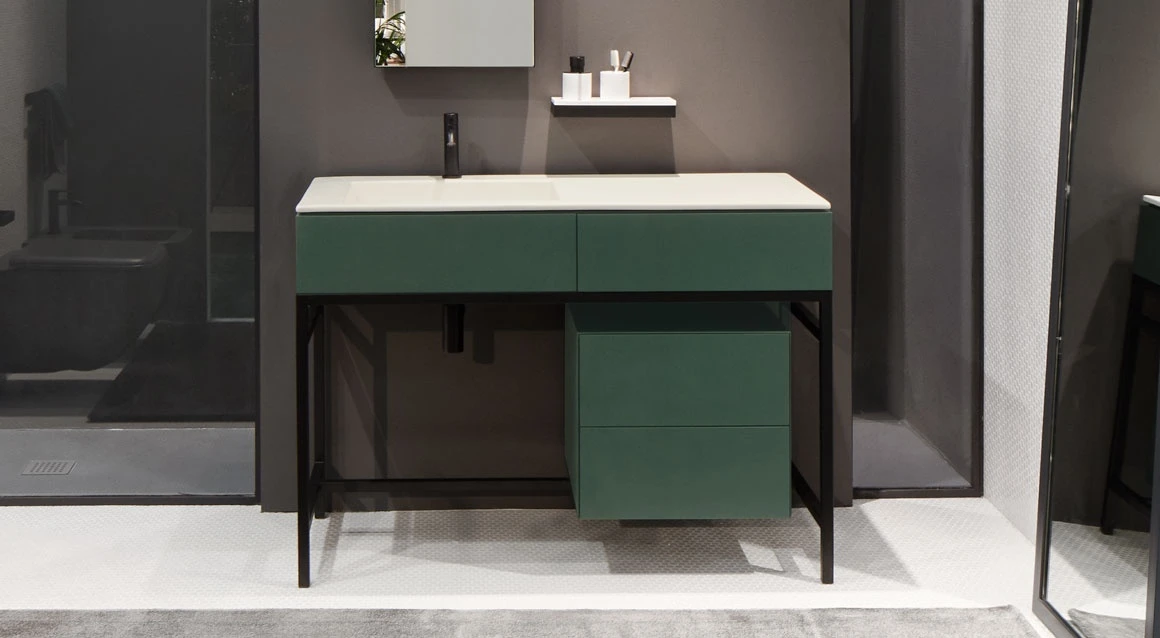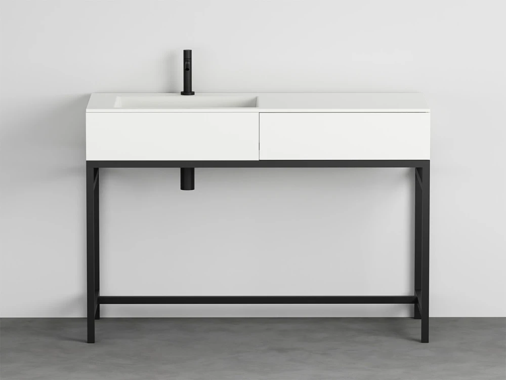 Un grande bacino e un comodo piano d'appoggio caratterizzano un mobile puro ed essenziale con piano in ceramica disponibile nelle finiture della gamma Terre di Cielo con integrato un cassetto contenitore. La struttura in acciaio verniciato in diverse finiture, può essere completata da una cassettiera in essenza o laccata.