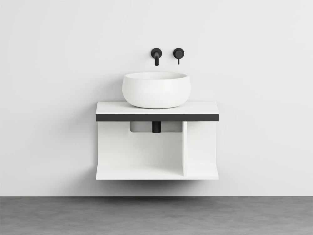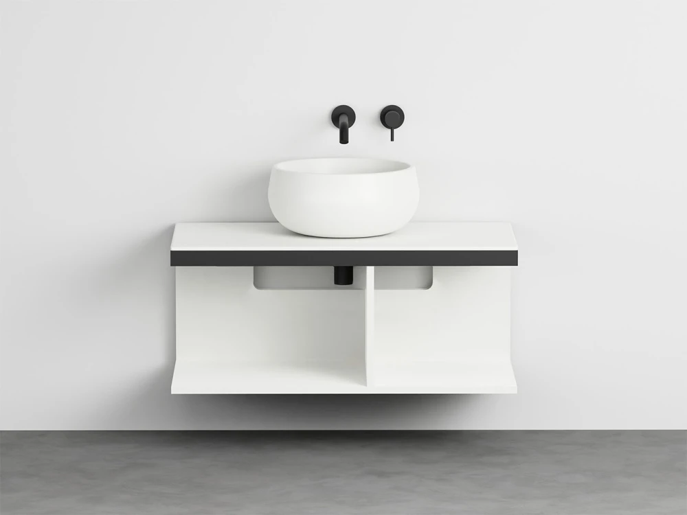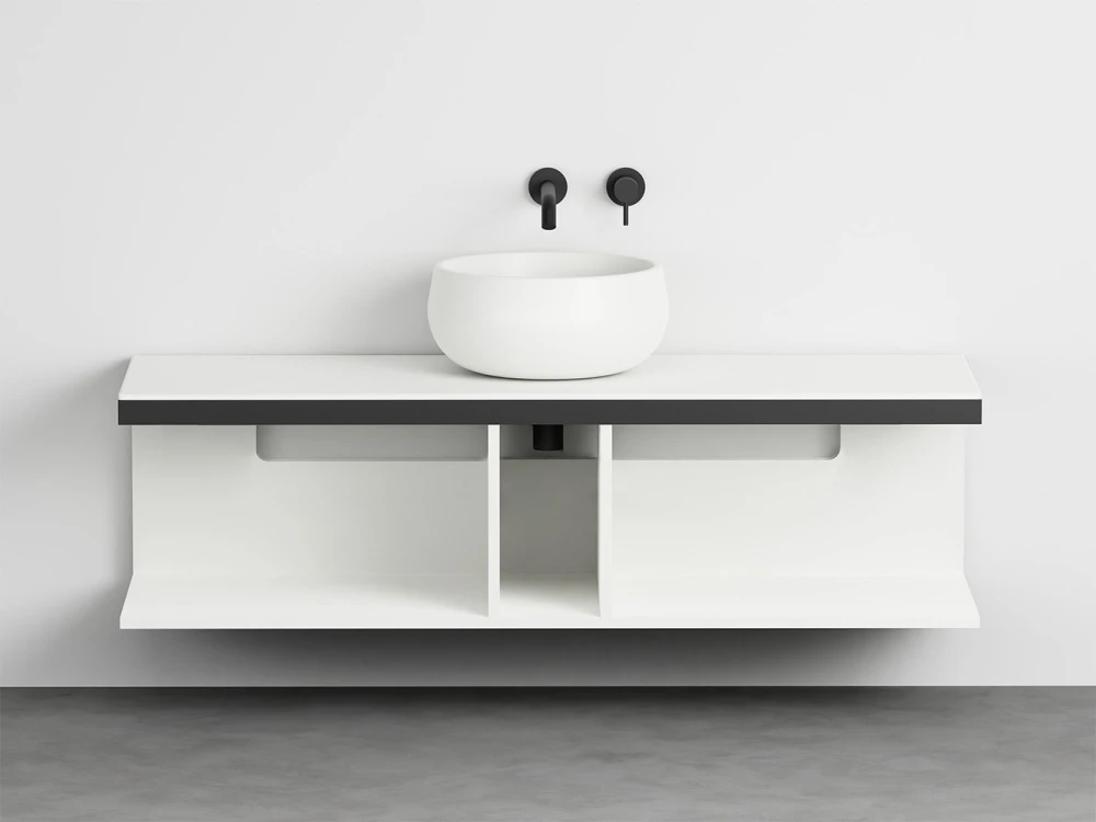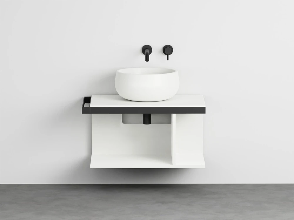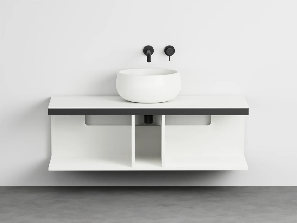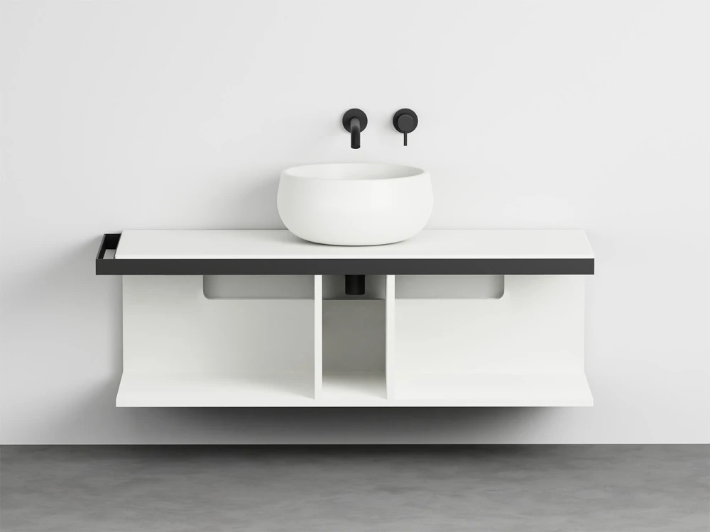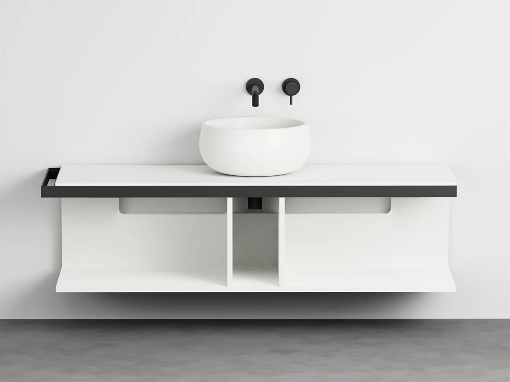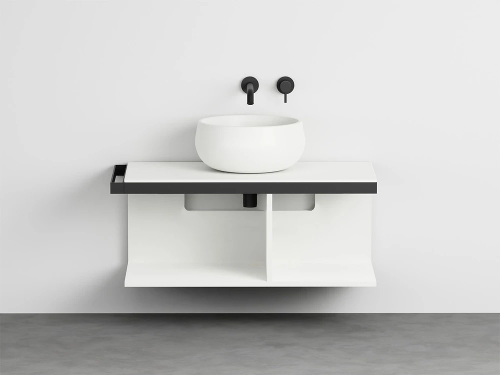 Sistema componibile a installazione sospesa, in molteplici dimensioni e composto da un piano in ceramica disponibile in varie finiture montato su di una struttura in acciaio verniciato con la possibilità di aggiungere porta asciugamani a complemento. In aggiunta un pratico ed elegante mobile a giorno disponibile nelle finiture laccate.