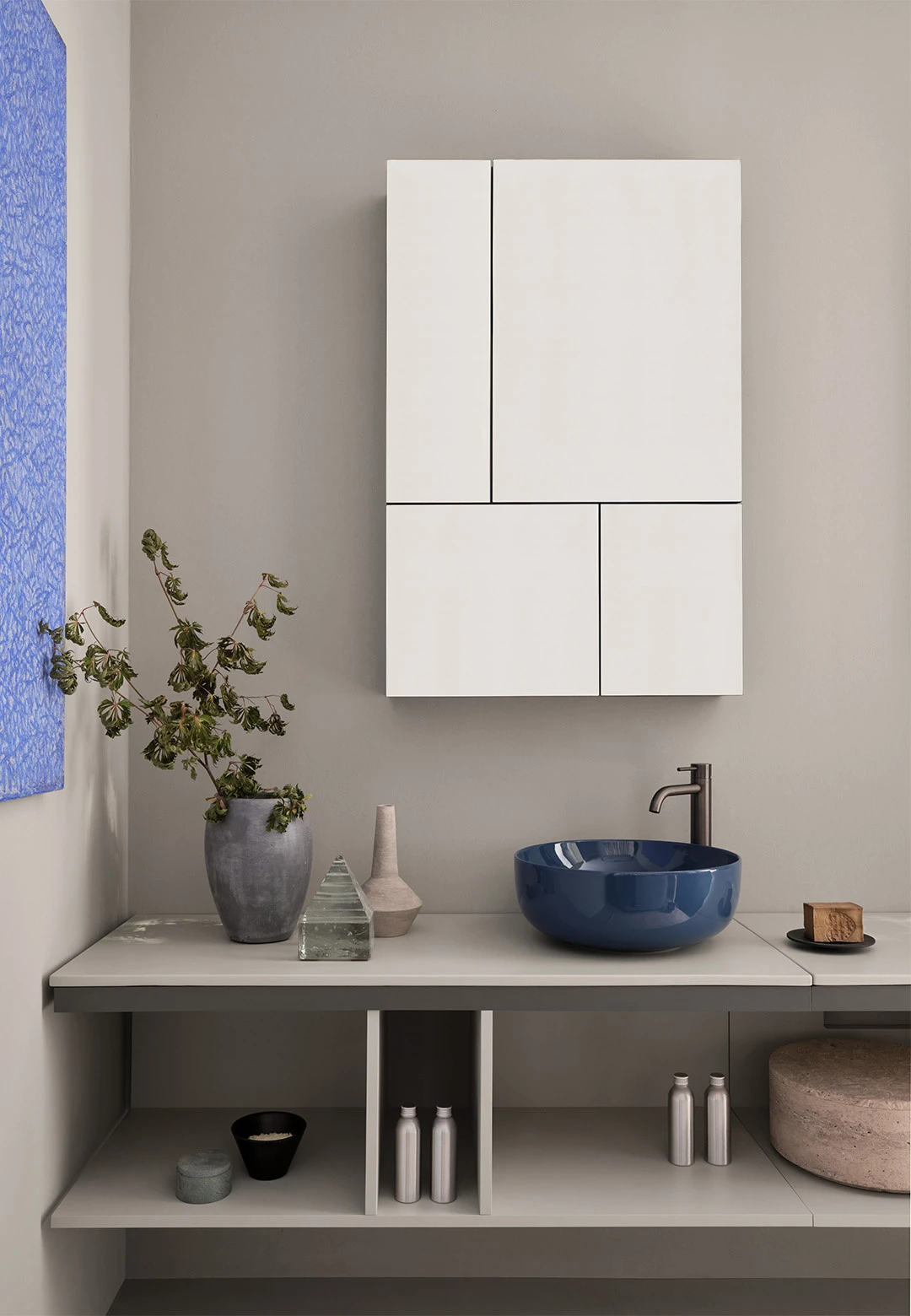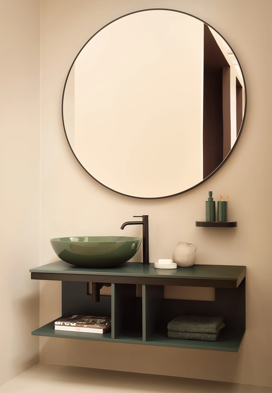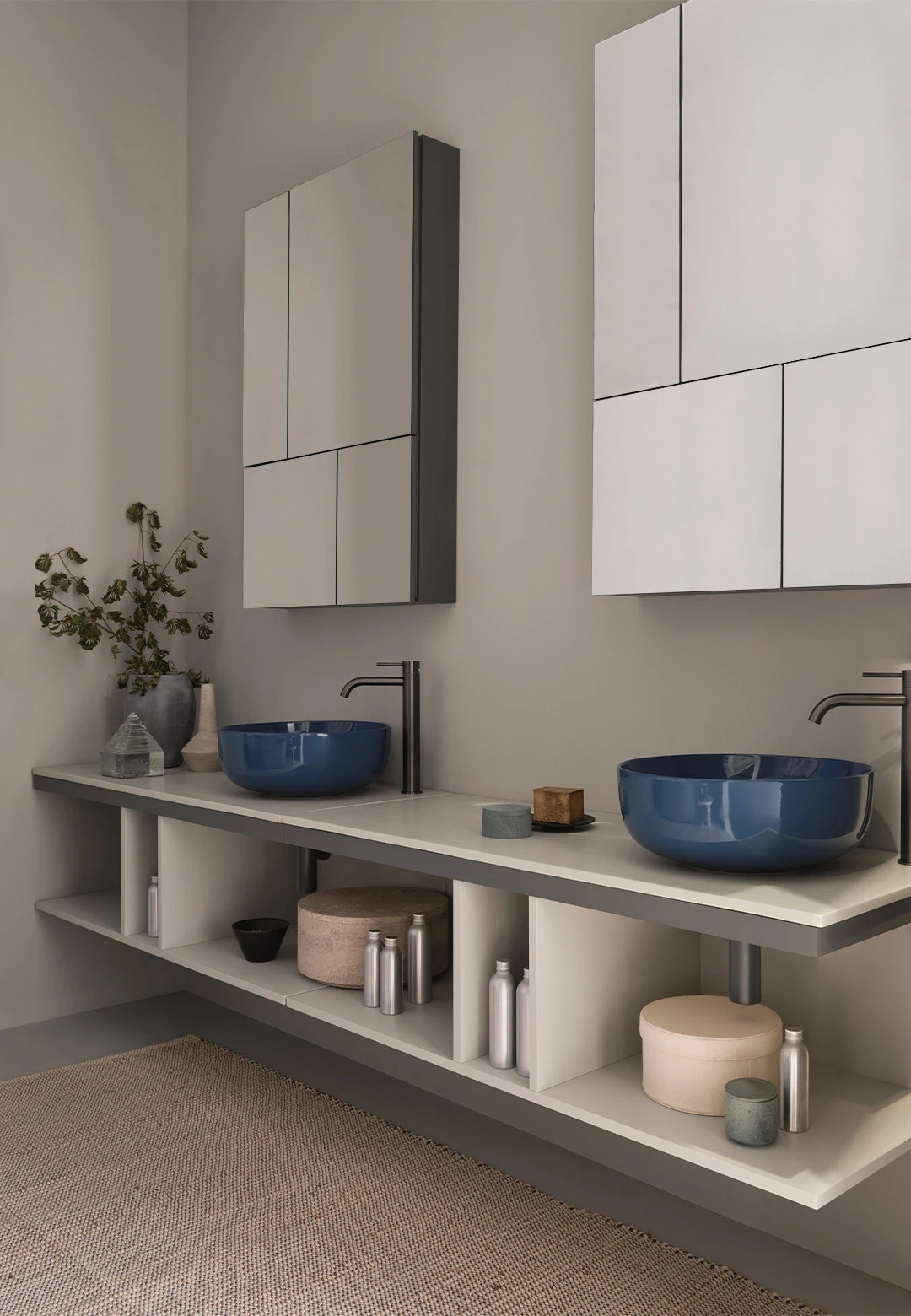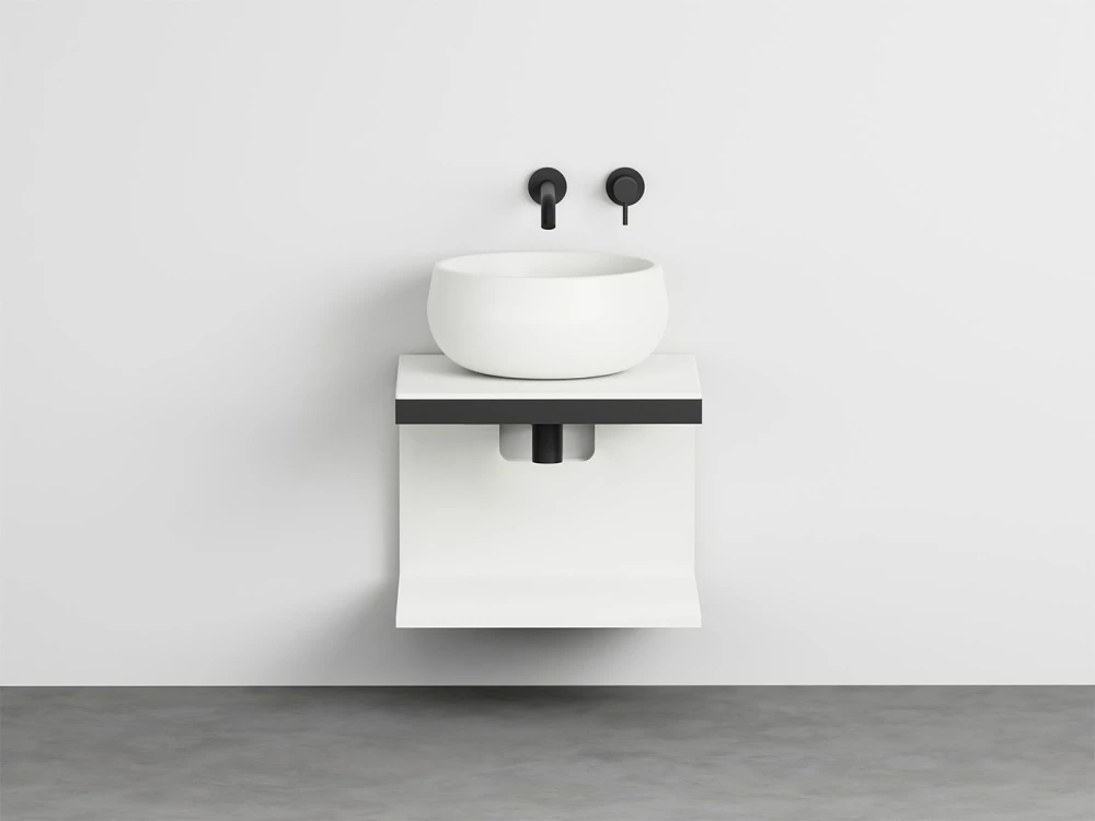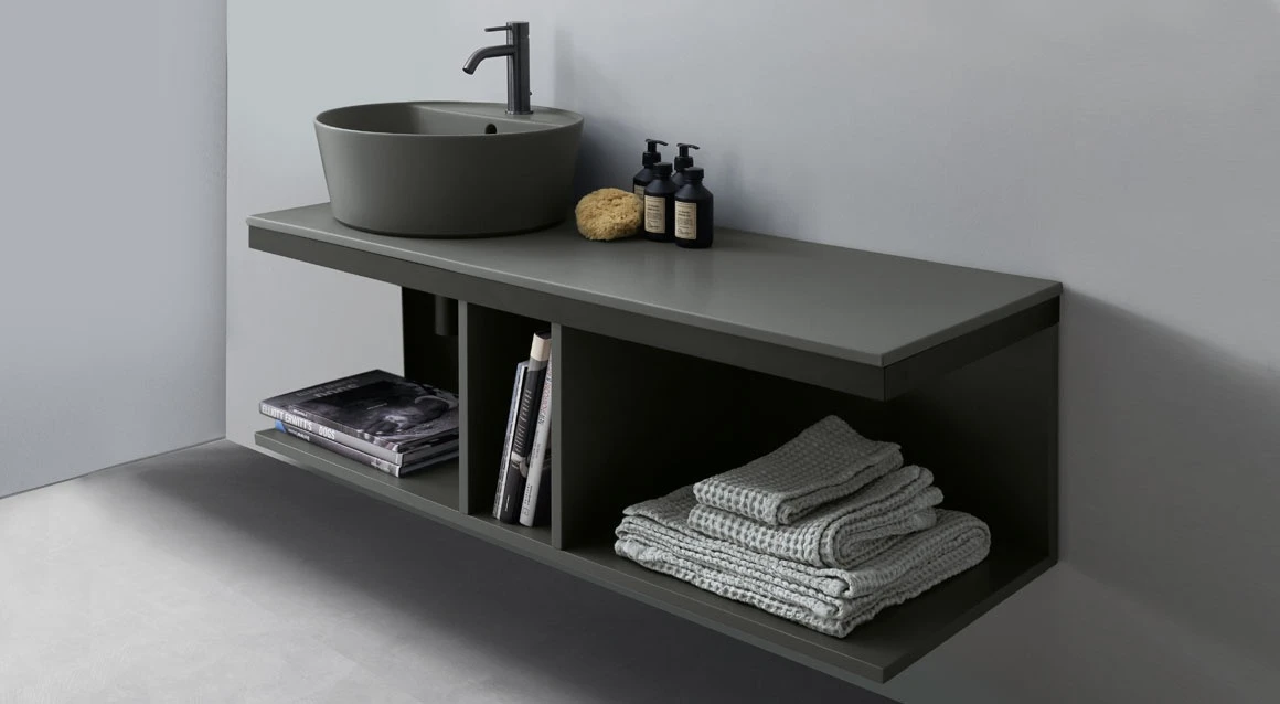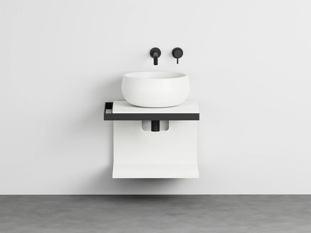 Sistema componibile a installazione sospesa, in molteplici dimensioni e composto da un piano in ceramica disponibile in varie finiture montato su di una struttura in acciaio verniciato con la possibilità di aggiungere porta asciugamani a complemento. In aggiunta un pratico ed elegante mobile a giorno disponibile nelle finiture laccate.