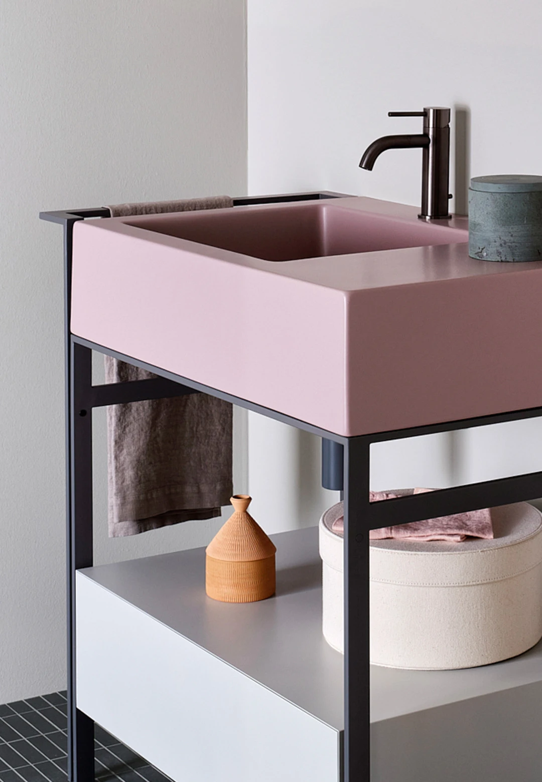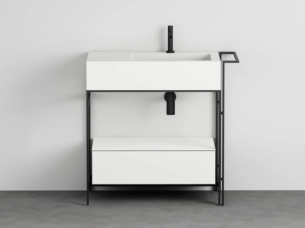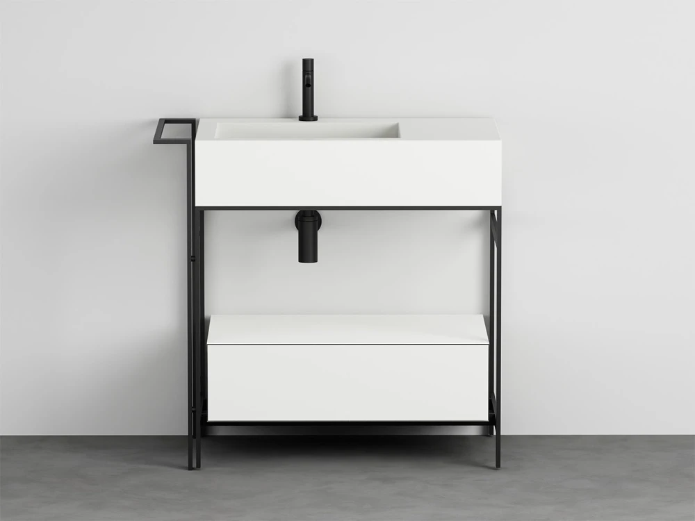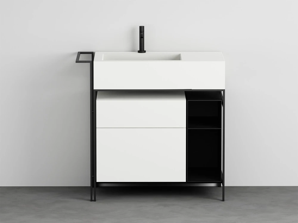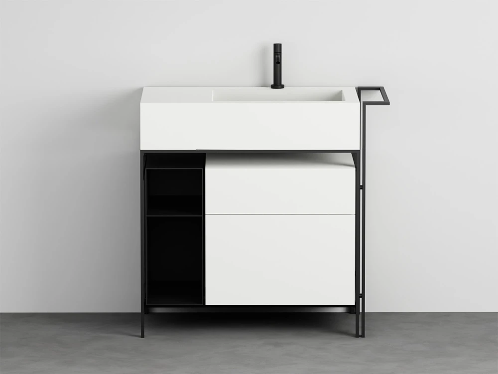 Sistema componibile di un comodo lavabo con piano d'appoggio laterale disponibile in molteplici finiture. La struttura in acciaio verniciato, può essere completata da un pratico porta-asciugamani laterale, da un elemento porta oggetti a giorno anch'esso in metallo verniciato, una cassettiera in legno laccato o in essenza e una comoda sacca in cuoio laterale, oppure un'ampio cassetto basso che funge anche da piano di appoggio disponibile in legno laccato o in essenza. Completa il tutto, una pratica sacca in cuoio laterale.