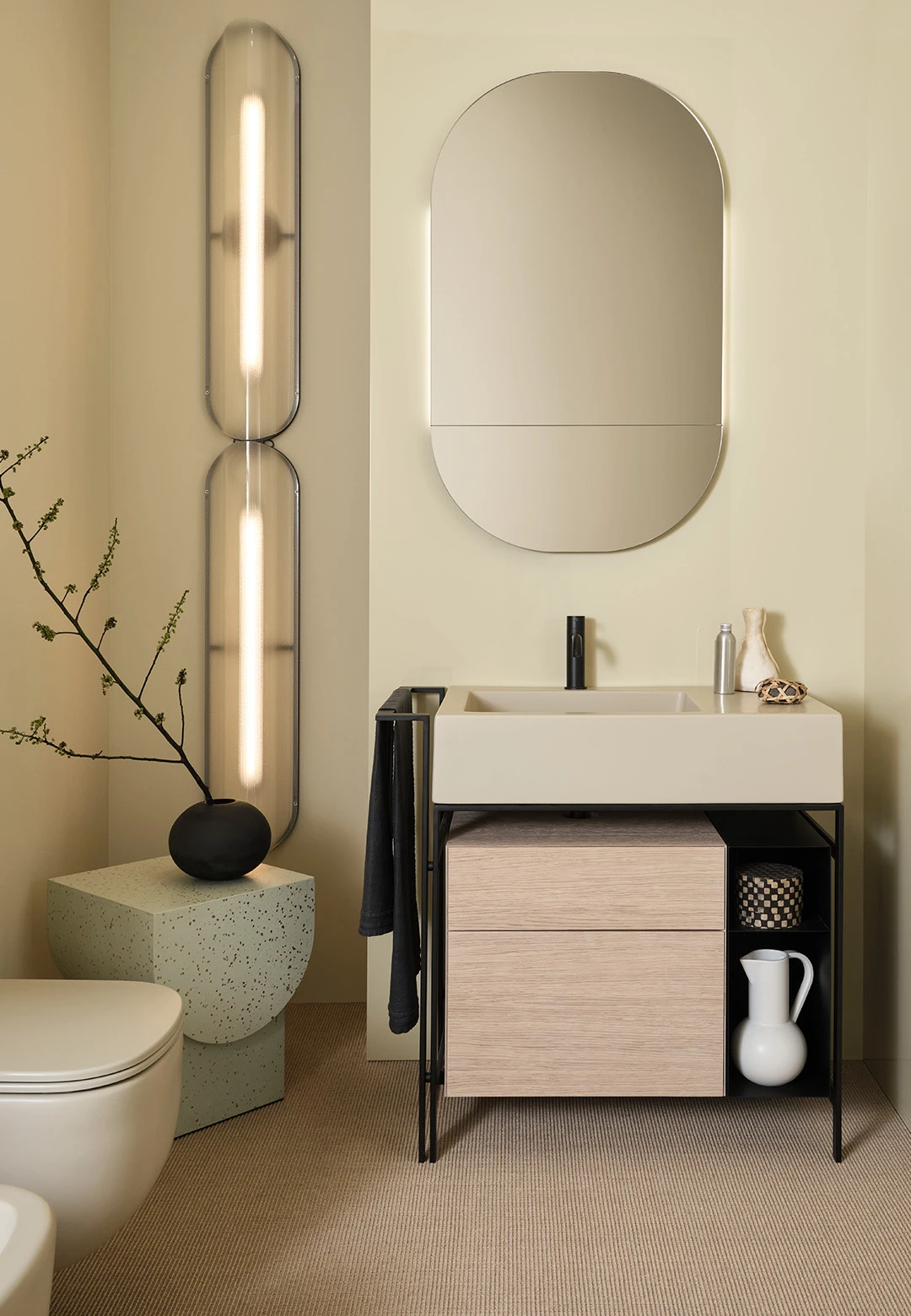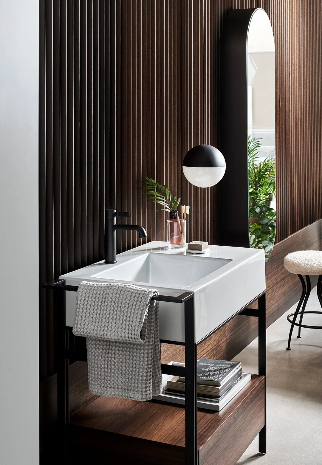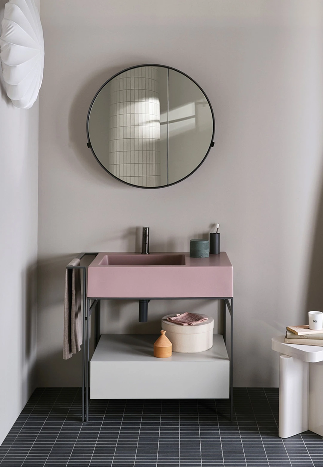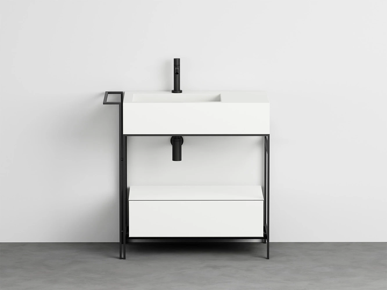 Sistema componibile di un comodo lavabo con piano d'appoggio laterale disponibile in molteplici finiture. La struttura in acciaio verniciato, può essere completata da un pratico porta-asciugamani laterale, da un elemento porta oggetti a giorno anch'esso in metallo verniciato, una cassettiera in legno laccato o in essenza e una comoda sacca in cuoio laterale, oppure un'ampio cassetto basso che funge anche da piano di appoggio disponibile in legno laccato o in essenza. Completa il tutto, una pratica sacca in cuoio laterale.