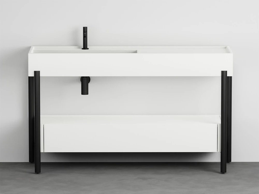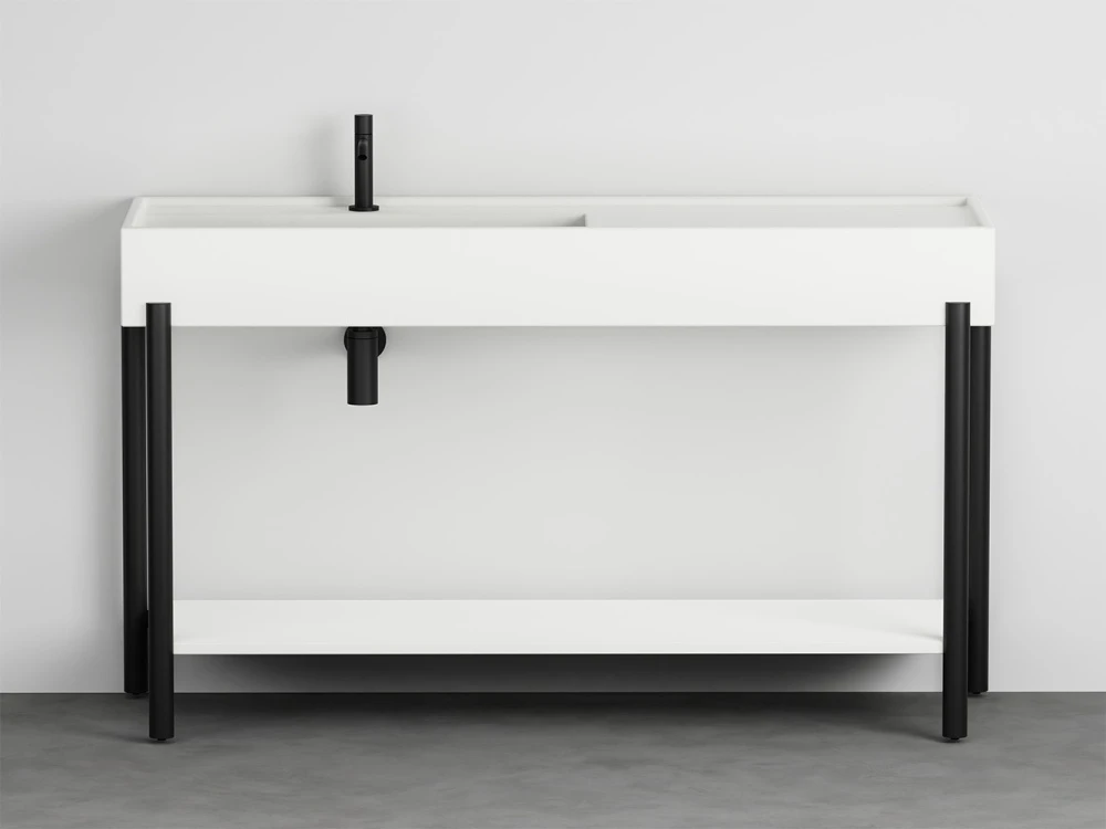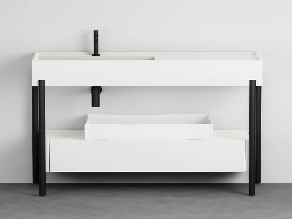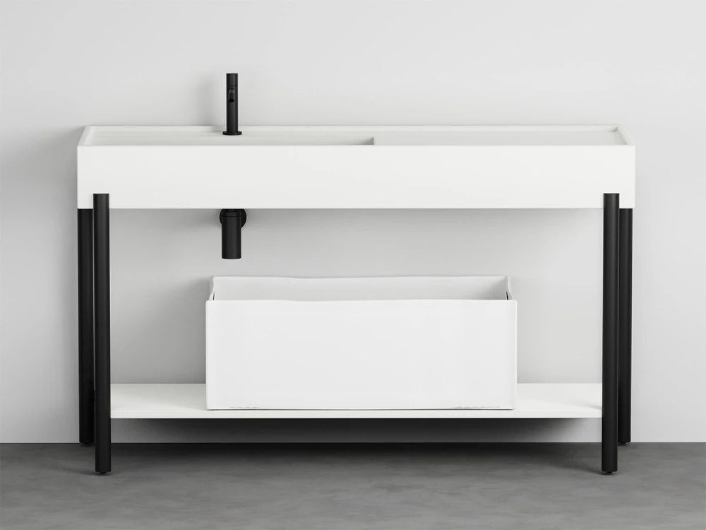 Un lavabo in ceramica dal grande bacino e un comodo piano d'appoggio laterale disponibile in molteplici finiture con una struttura in acciaio verniciato o legno in varie pregiate essenze naturali, componibile con un piano di appoggio oppure un generoso cassetto basso, entrambe in legno laccato o in essenza. Il tutto completato da ceste in cuoio di diverse misure.