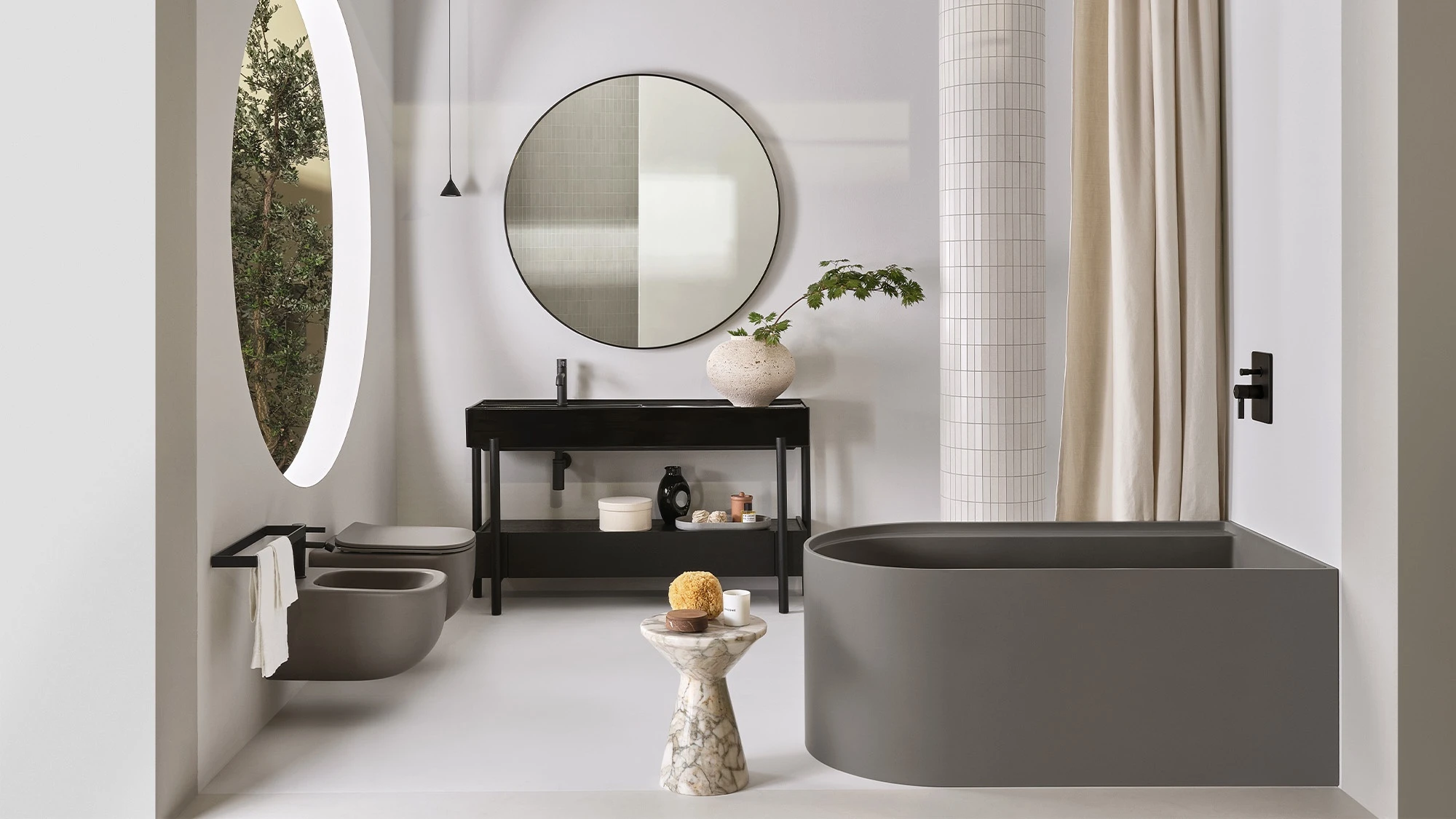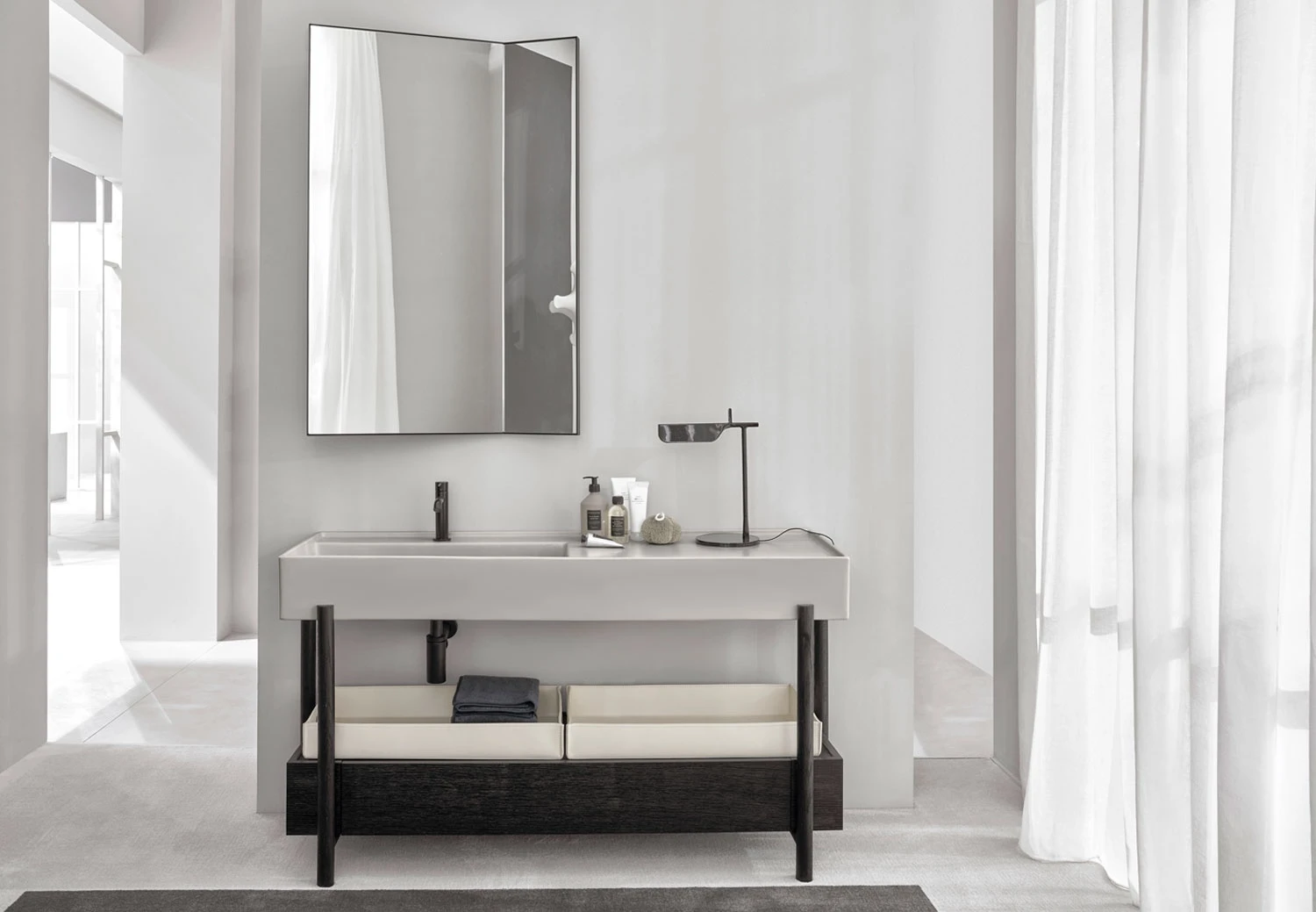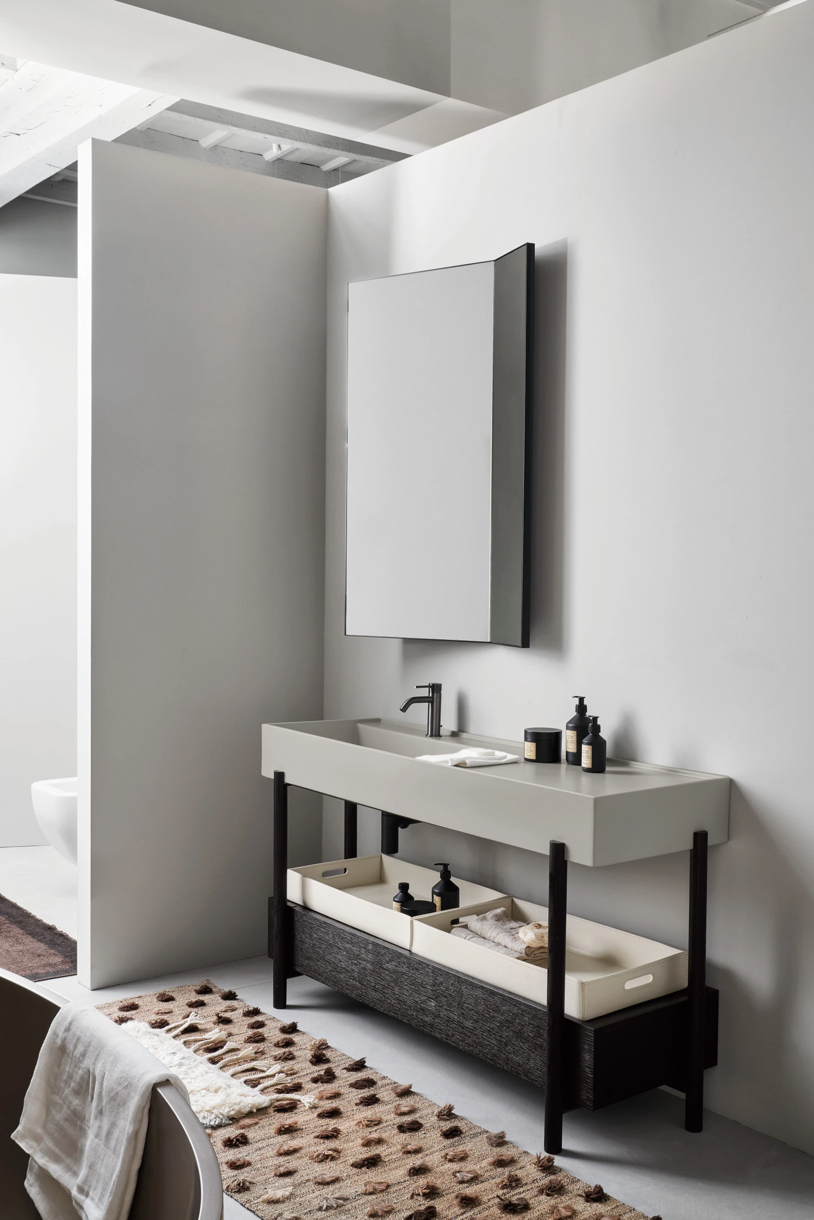 Un lavabo in ceramica dal grande bacino e un comodo piano d'appoggio laterale disponibile in molteplici finiture con una struttura in acciaio verniciato o legno in varie pregiate essenze naturali, componibile con un piano di appoggio oppure un generoso cassetto basso, entrambe in legno laccato o in essenza. Il tutto completato da ceste in cuoio di diverse misure.