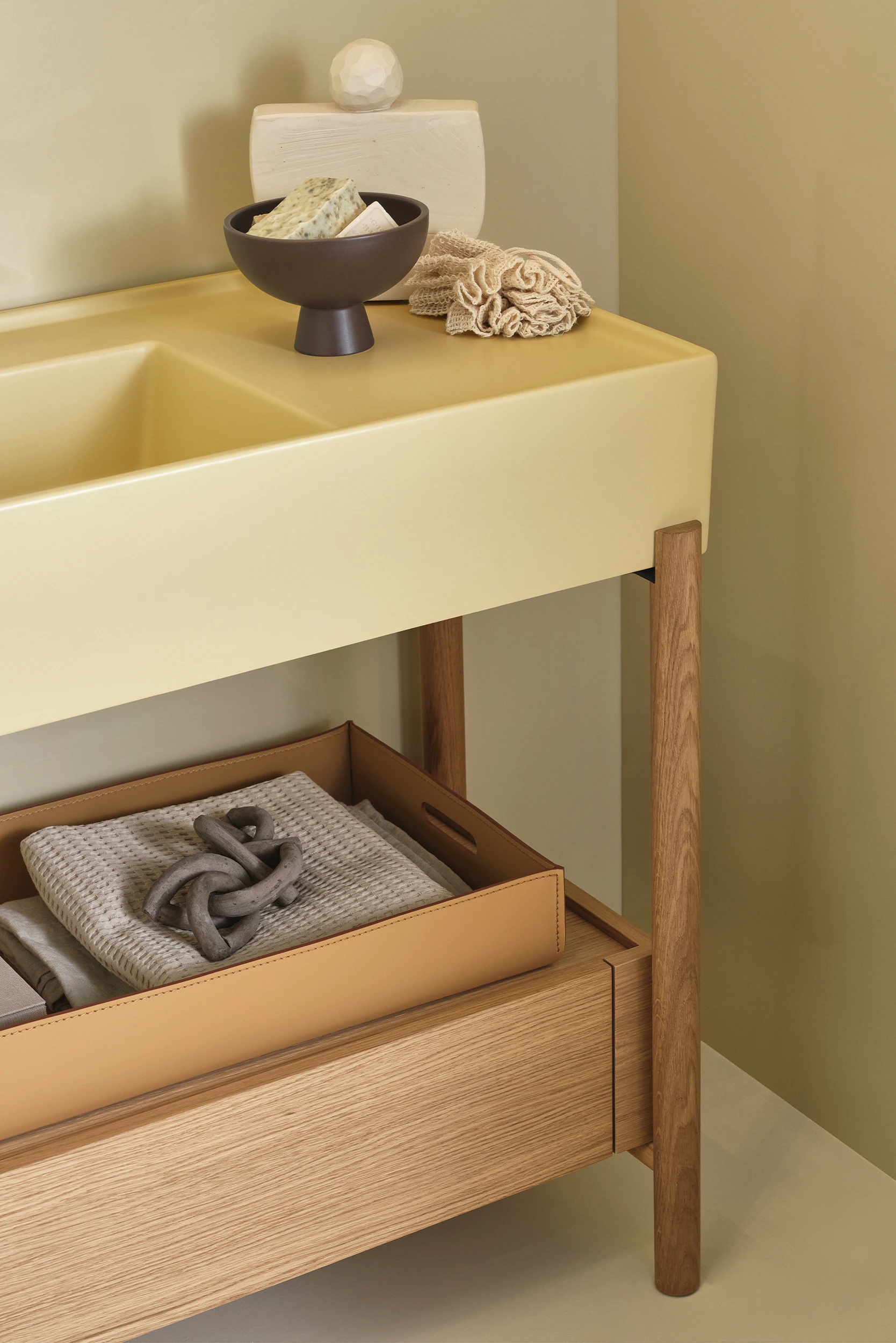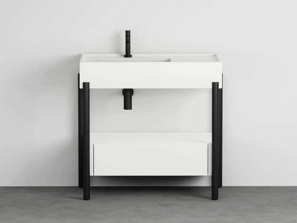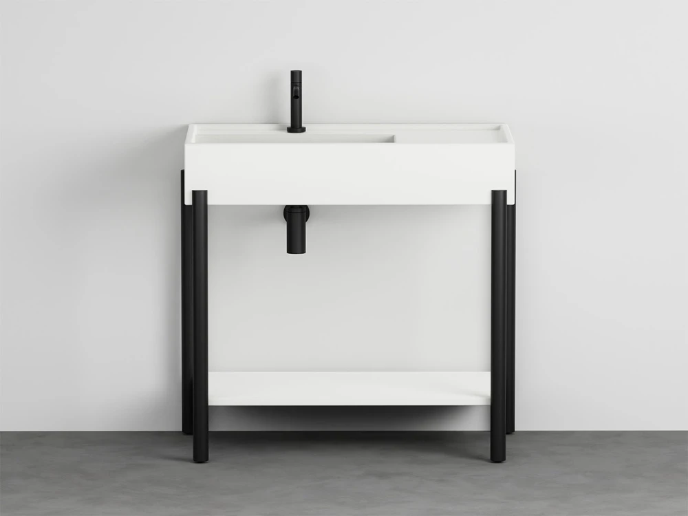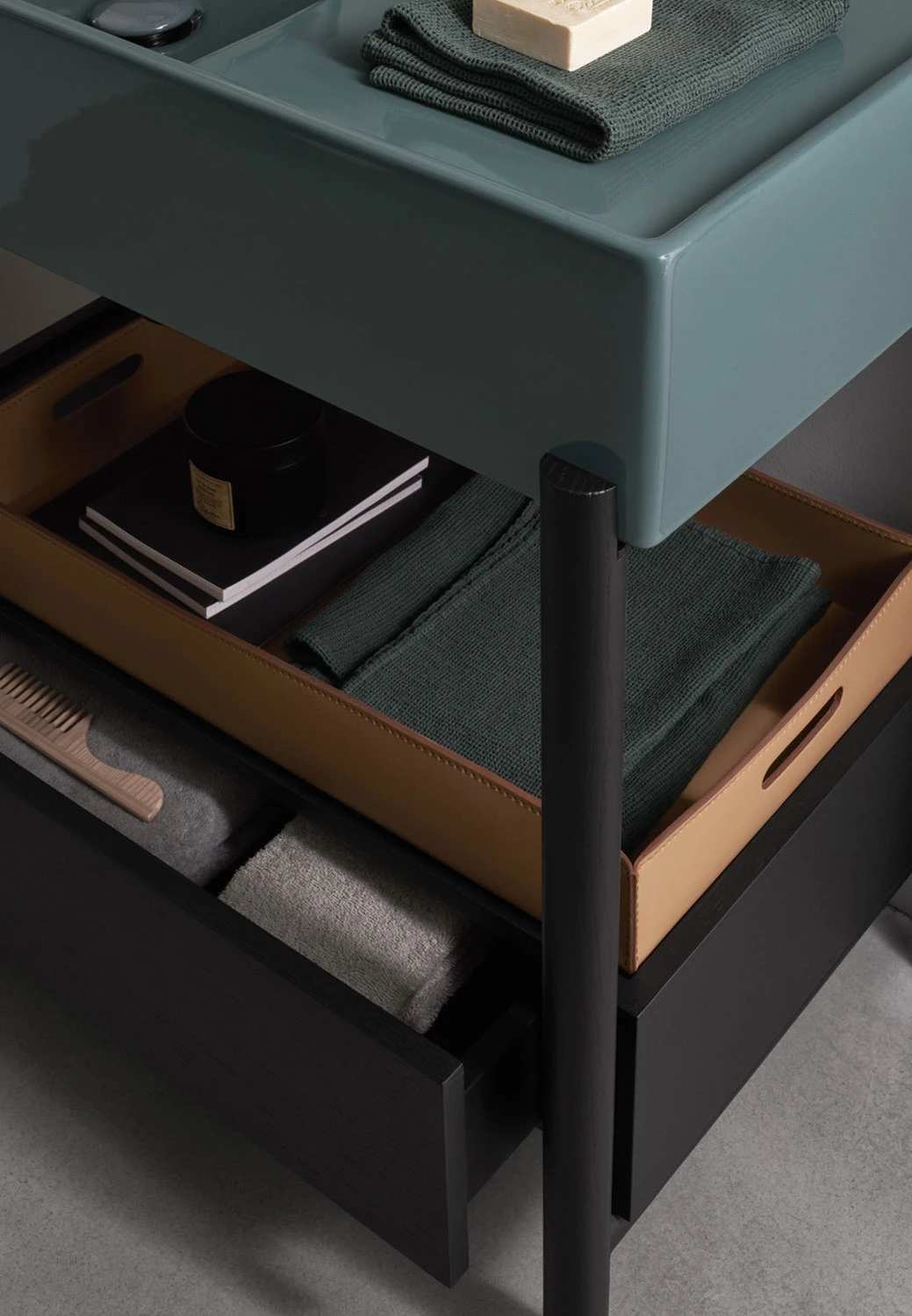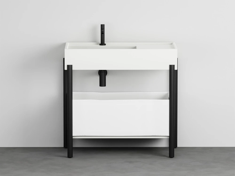 Un lavabo in ceramica dal grande bacino e un comodo piano d'appoggio laterale disponibile in molteplici finiture con una struttura in acciaio verniciato o legno in varie pregiate essenze naturali, componibile con un piano di appoggio oppure un generoso cassetto basso, entrambe in legno laccato o in essenza. Il tutto completato da ceste in cuoio di diverse misure.