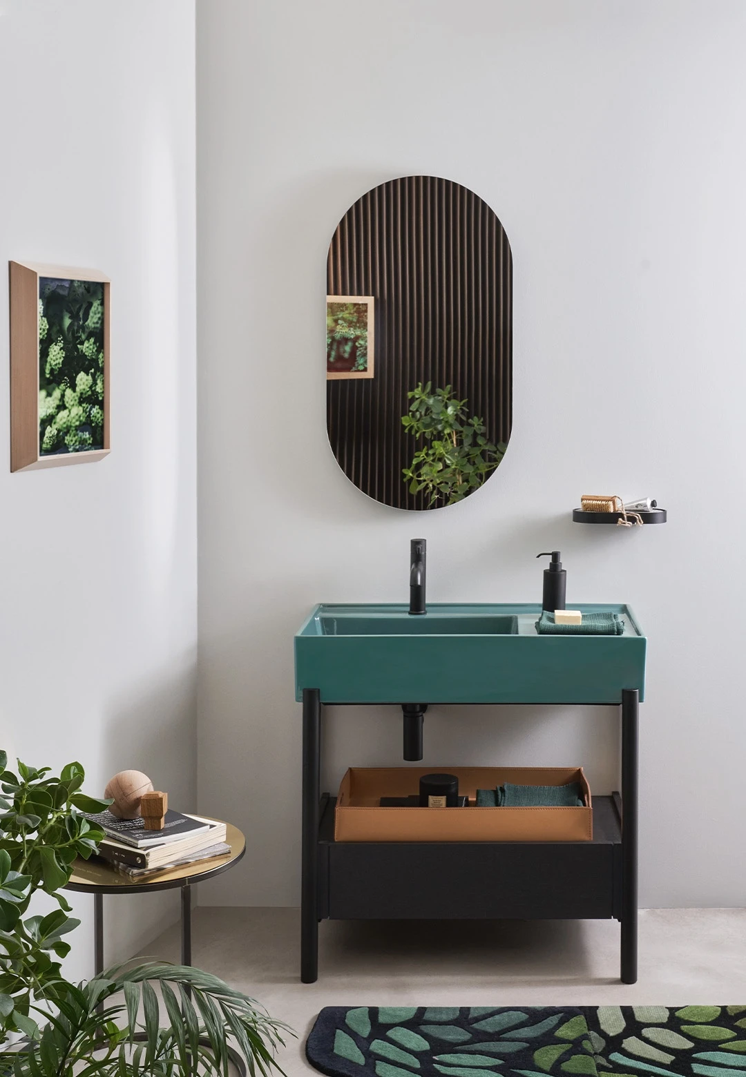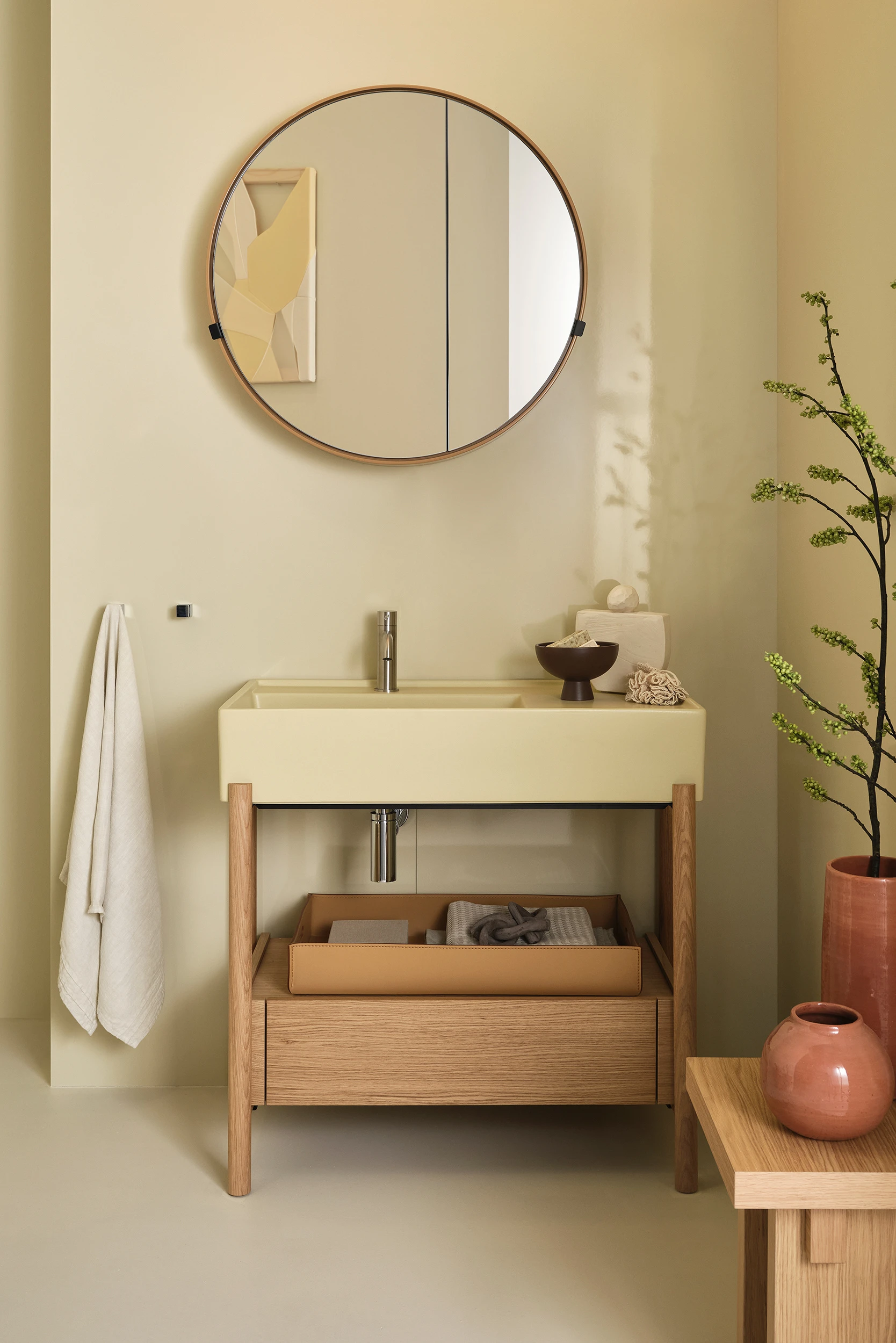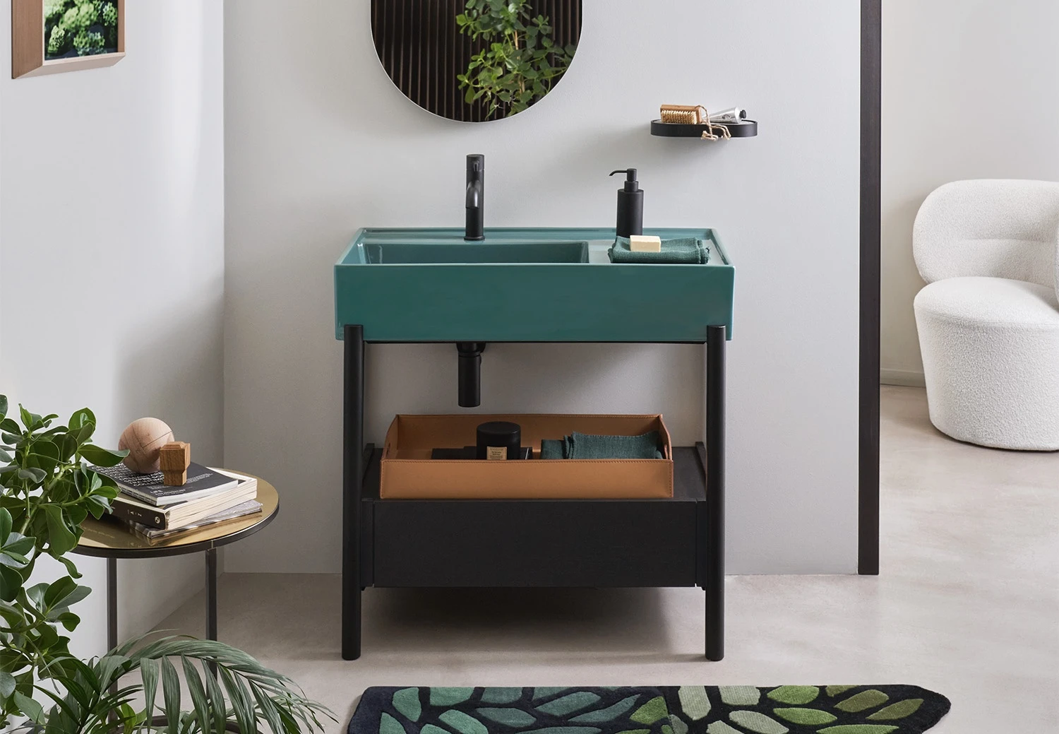 Un lavabo in ceramica dal grande bacino e un comodo piano d'appoggio laterale disponibile in molteplici finiture con una struttura in acciaio verniciato o legno in varie pregiate essenze naturali, componibile con un piano di appoggio oppure un generoso cassetto basso, entrambe in legno laccato o in essenza. Il tutto completato da ceste in cuoio di diverse misure.