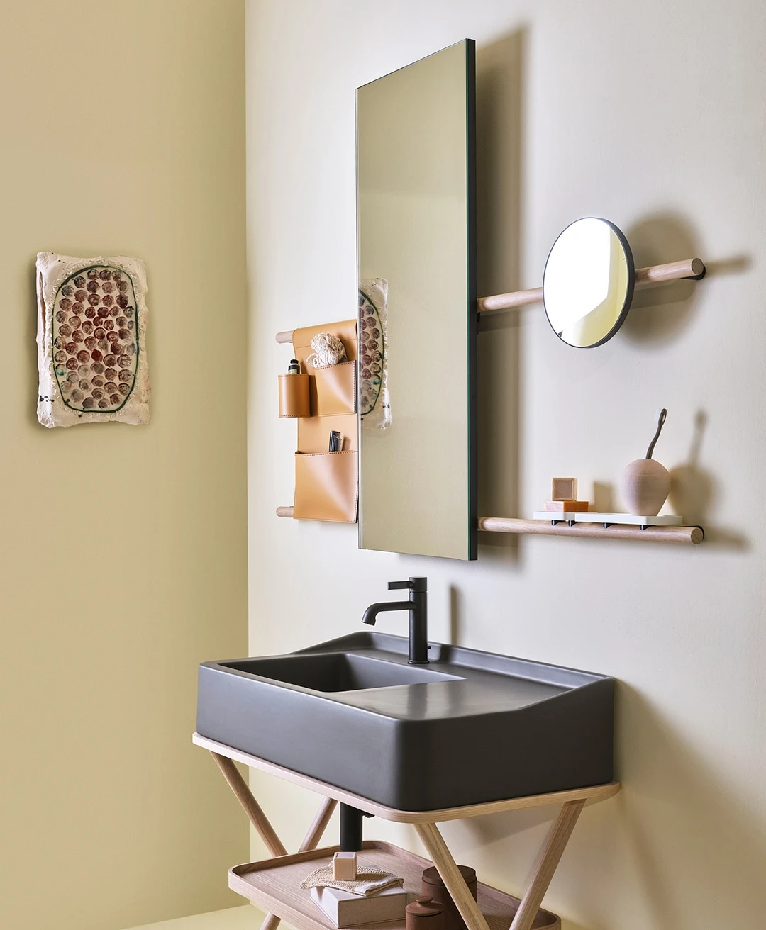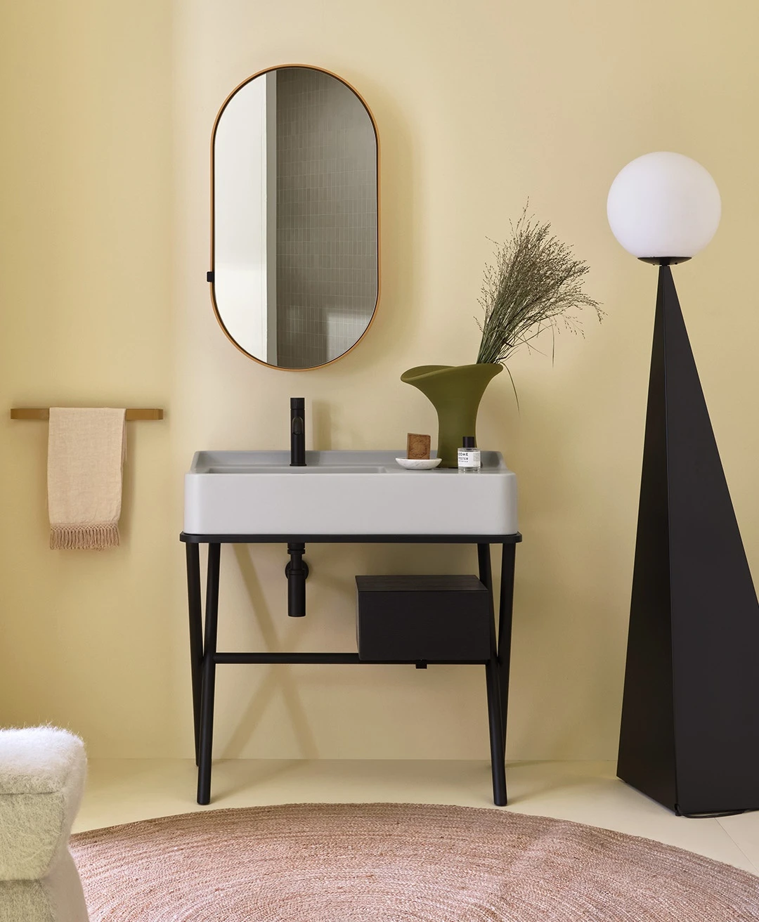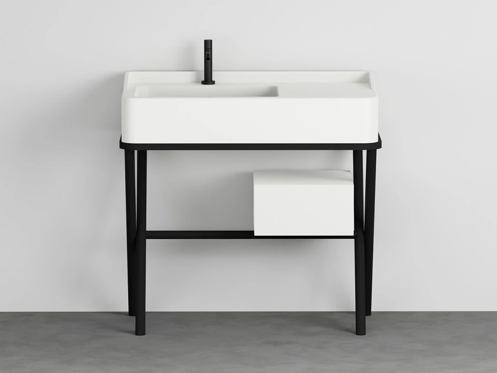 Sistema componibile con un lavabo in ceramica monoforo dalle molteplici finiture, la struttura disponibile in acciaio verniciato o in legno e la possibilità di scegliere fra un pratico cassetto o un ampio piano entrambe realizzati in legno entrambe e disponibili nelle finiture laccate de "Le Terre di Cielo" o rivestiti da pregiate essenze naturali.