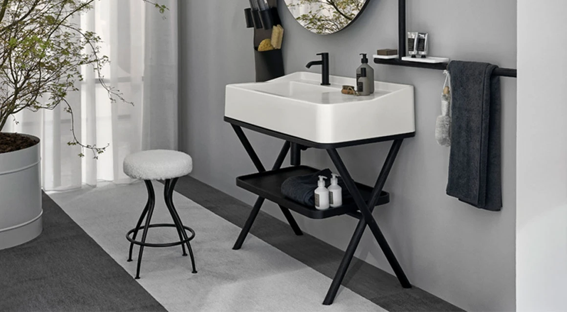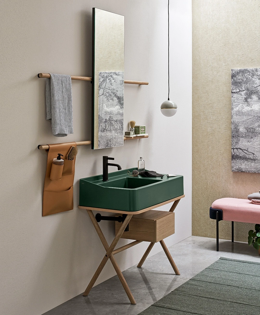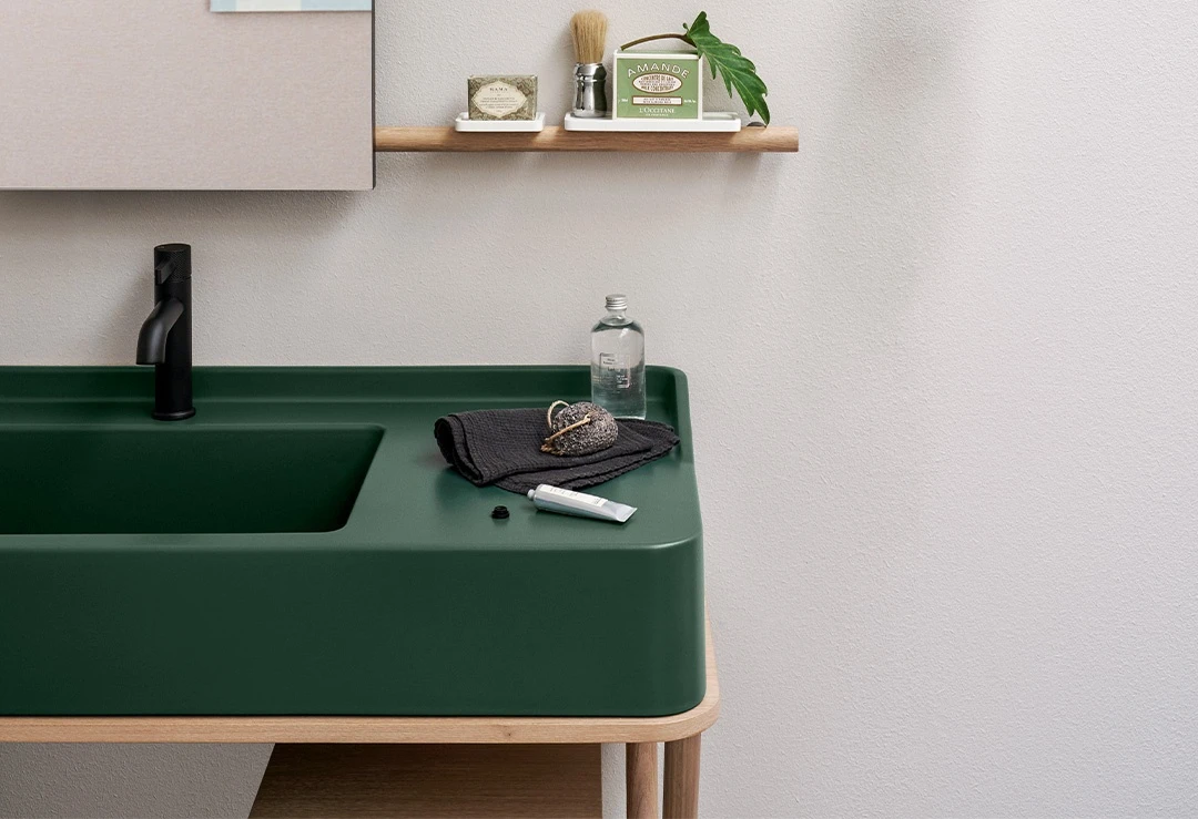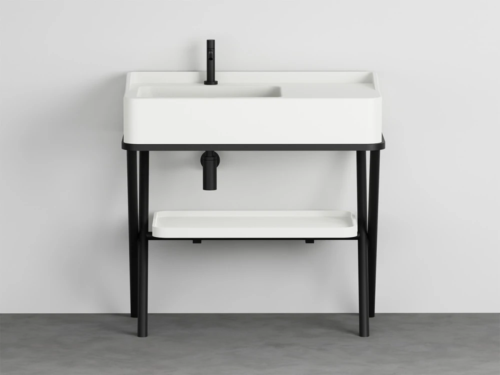 Sistema componibile con un lavabo in ceramica monoforo dalle molteplici finiture, la struttura disponibile in acciaio verniciato o in legno e la possibilità di scegliere fra un pratico cassetto o un ampio piano entrambe realizzati in legno entrambe e disponibili nelle finiture laccate de "Le Terre di Cielo" o rivestiti da pregiate essenze naturali.