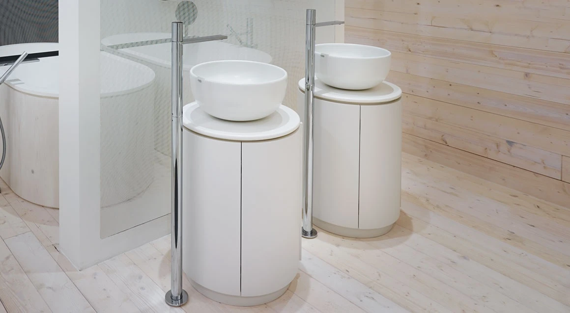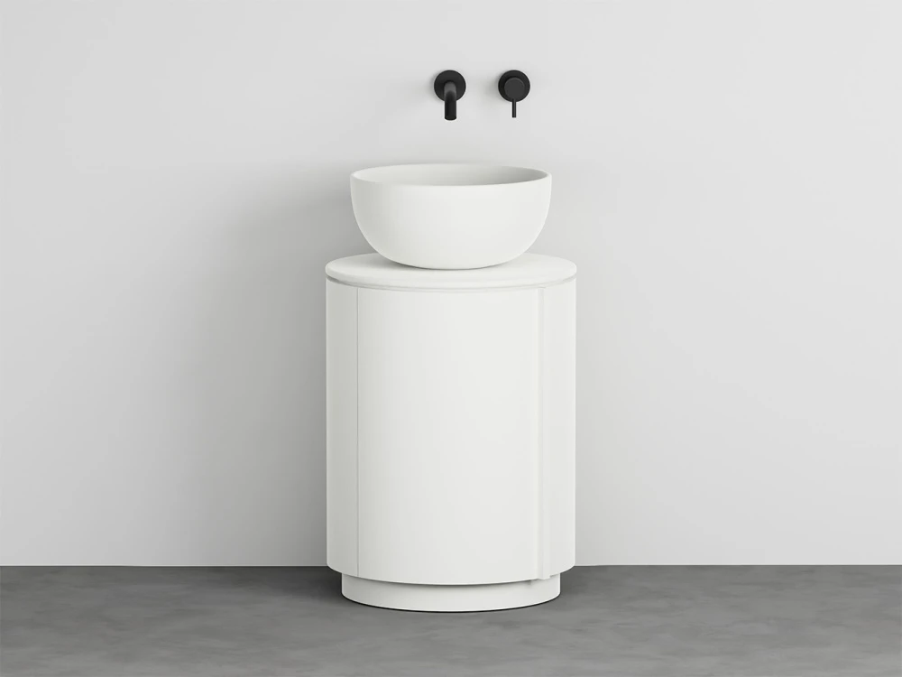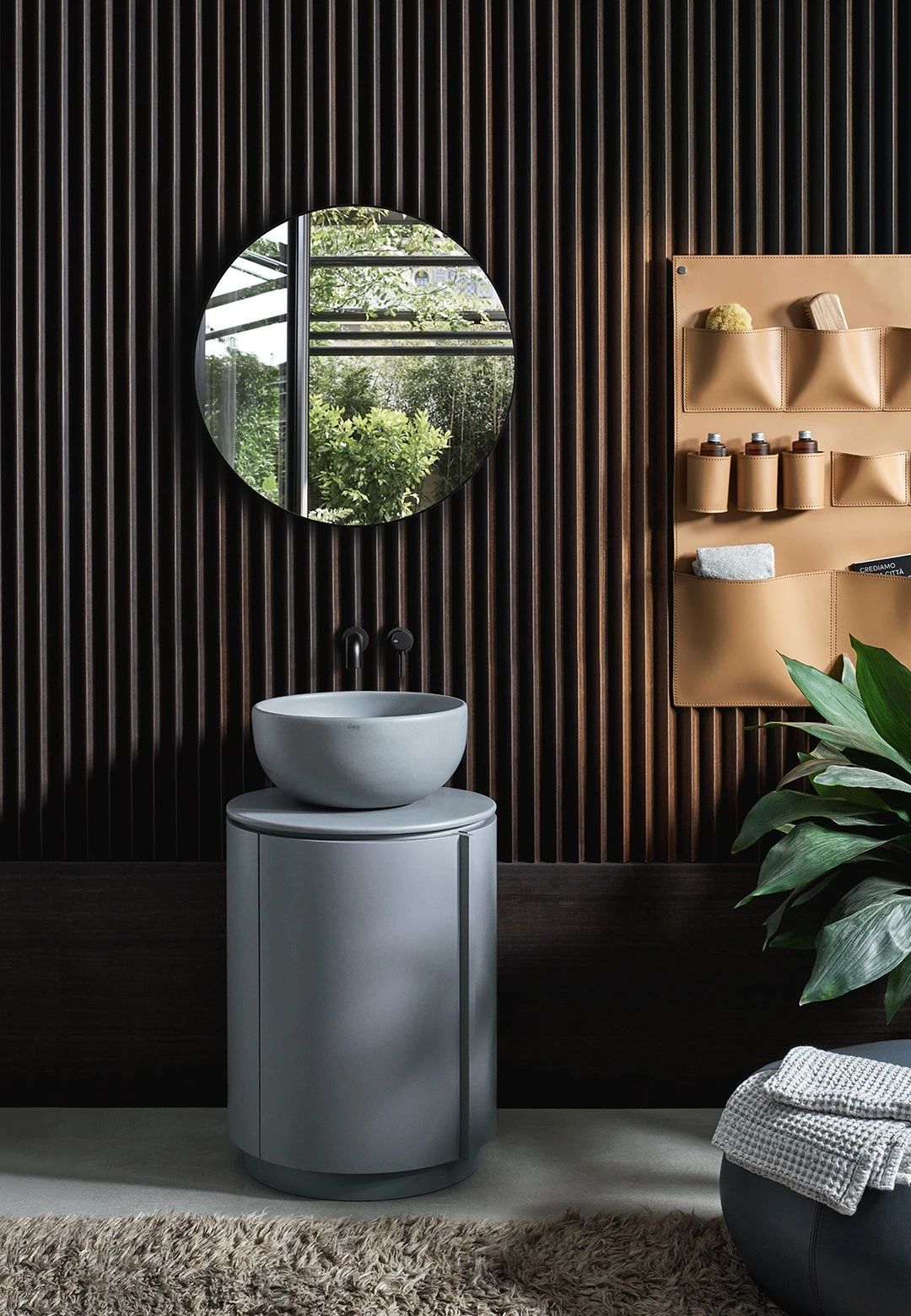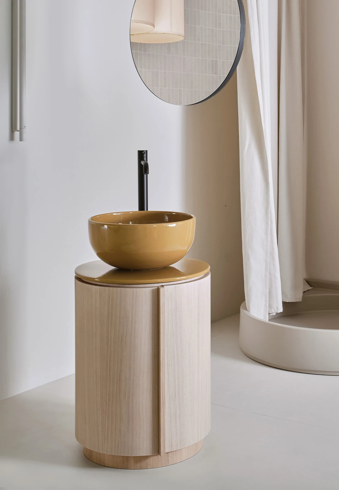 Pratico mobile contenitore freestanding a due ripiani interni, disponibile sia nella versione da centro stanza con scarico a terra, che nella versione con scarico parete. Il mobile può essere realizzato nelle finiture laccate o nelle prestigiose essenze naturali, abbinato a una piastra ceramica e un lavabo entrambe in molteplici finiture.