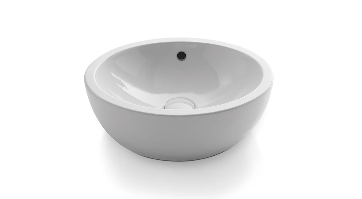 Bacinella da appoggio, con troppo pieno, rifinita su tutti i lati e disponibile in molteplici finiture.