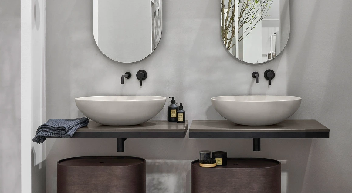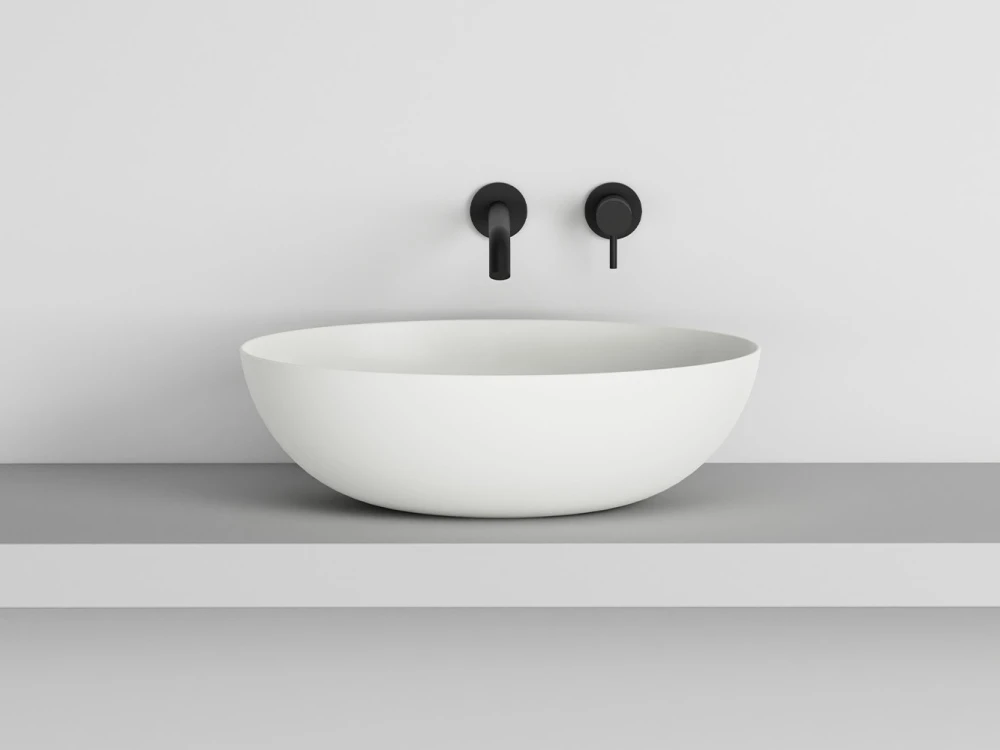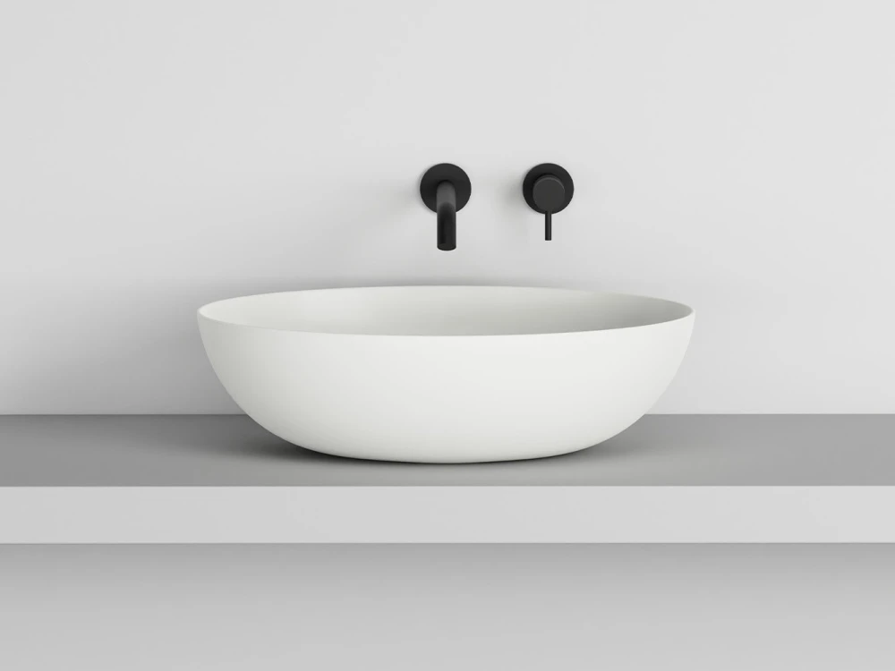 Bacinella da appoggio, senza troppo pieno, rifinita su tutti i lati. Disponibile in varie finiture ceramiche.