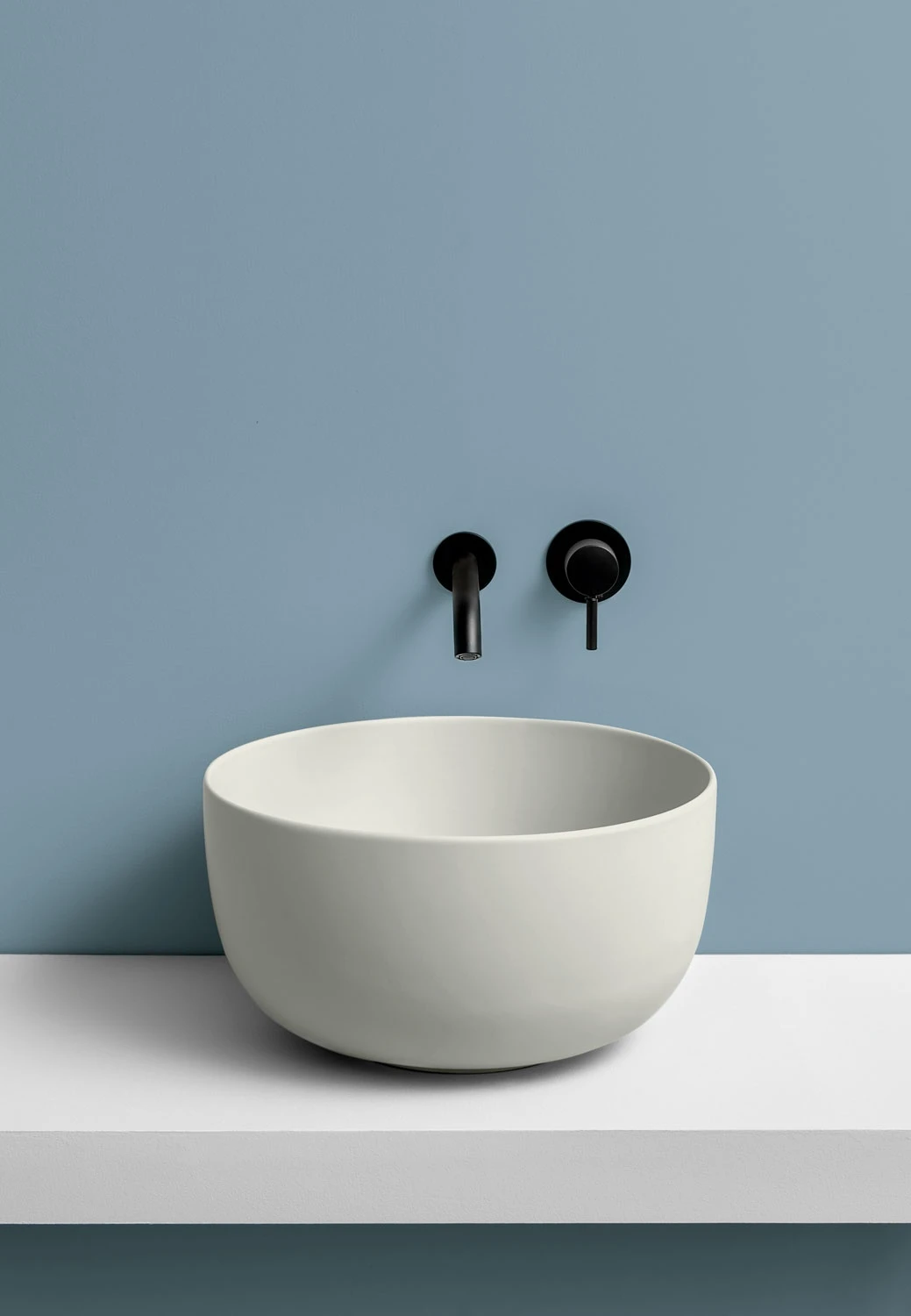 Bacinella Era da appoggio, senza troppo pieno, rifinita su tutti i lati. Disponibile in varie finiture ceramiche.