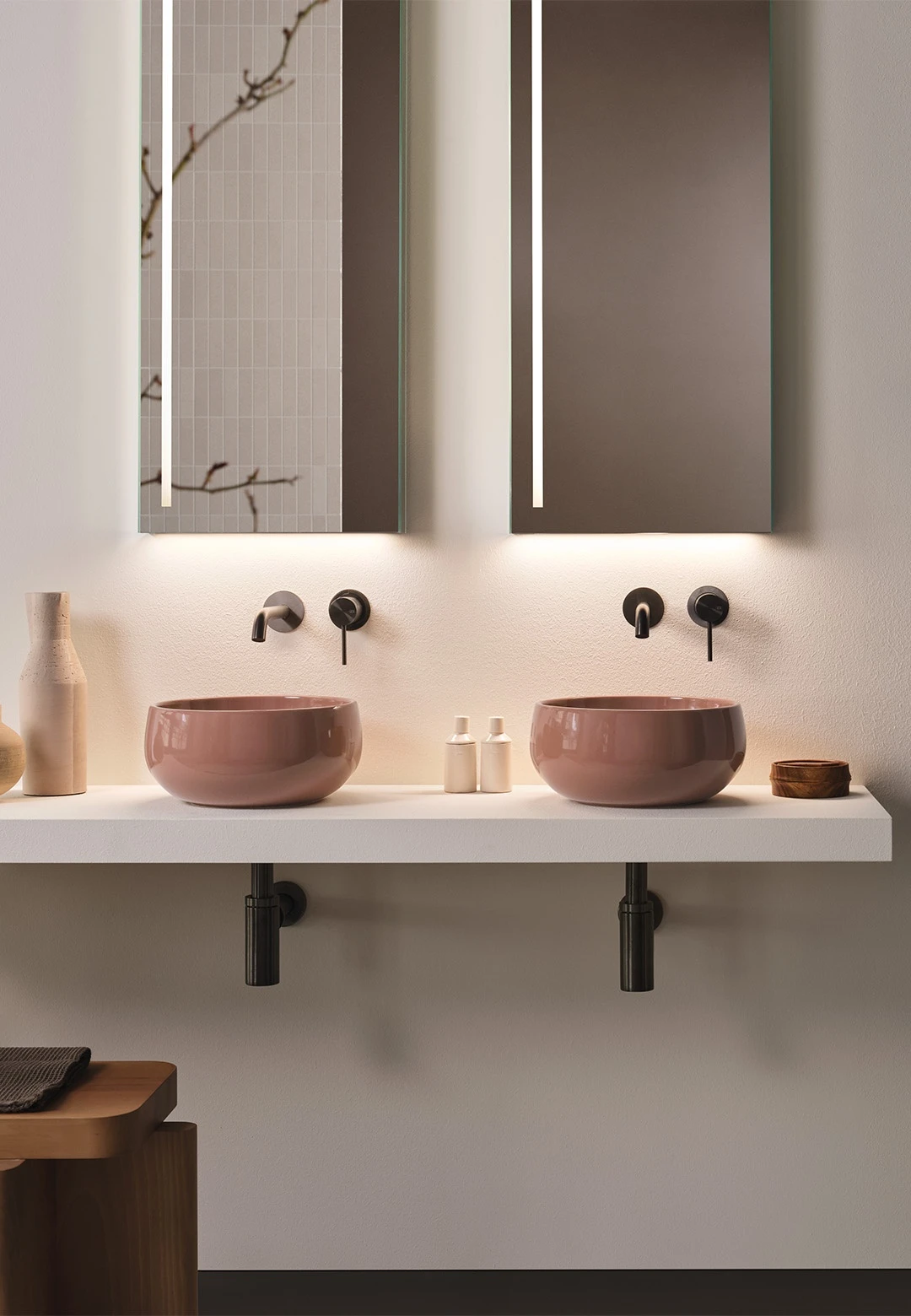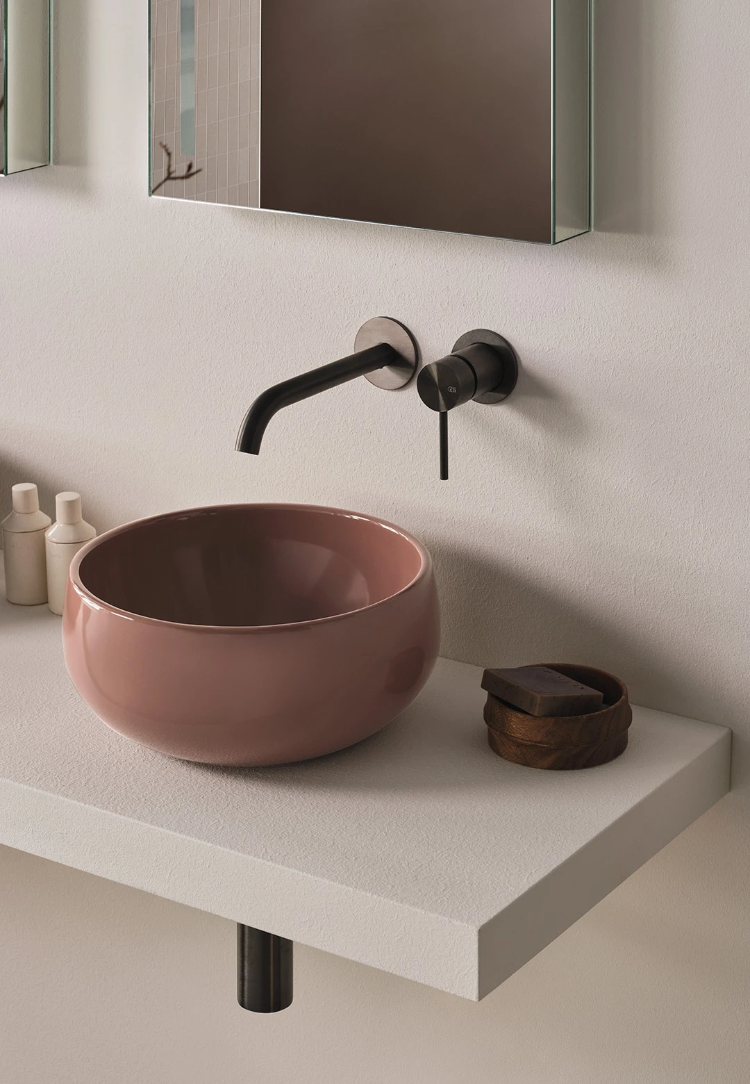 Bacinella da appoggio, senza troppo pieno, rifinita su tutti i lati. Disponibile nelle varie finiture ceramiche.